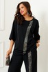 Изысканный костюм состоит из 2-ух предметов: блузки и брюк. Выполнен из костюмно-смесового полотна. У этой ткани нежная, гладко-бархатистая фактура, приятная на ощупь и матовая поверхность. Она легко драпируется и очень выгодно и дорого подчёркивает образ.