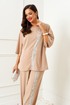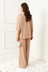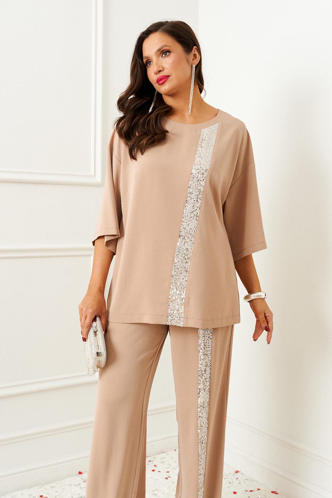 Изысканный костюм состоит из 2-ух предметов: блузки и брюк. Выполнен из костюмно-смесового полотна. У этой ткани нежная, гладко-бархатистая фактура, приятная на ощупь и матовая поверхность. Она легко драпируется и очень выгодно и дорого подчёркивает образ.