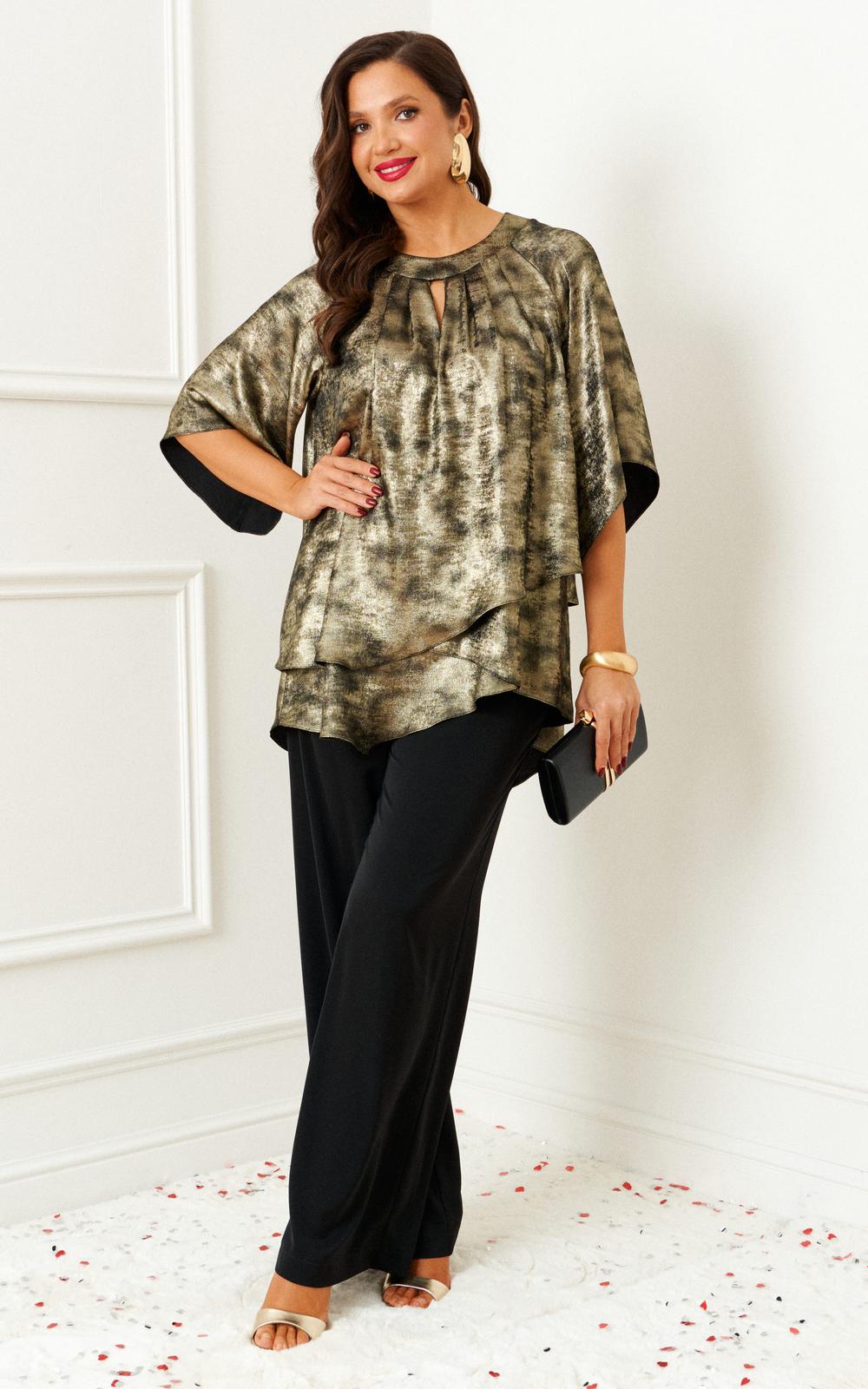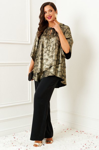 Изысканный костюм состоит из 2-ух предметов: блузки и брюк. Выполнен из эластичного полотна в сочетании с ворсовым шифоном. Брючная ткань нежная, гладко-бархатистой фактуры, приятная на ощупь, она легко драпируется и очень выгодно и дорого подчёркивает образ; блузочная ткань придает праздничный шарм.