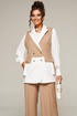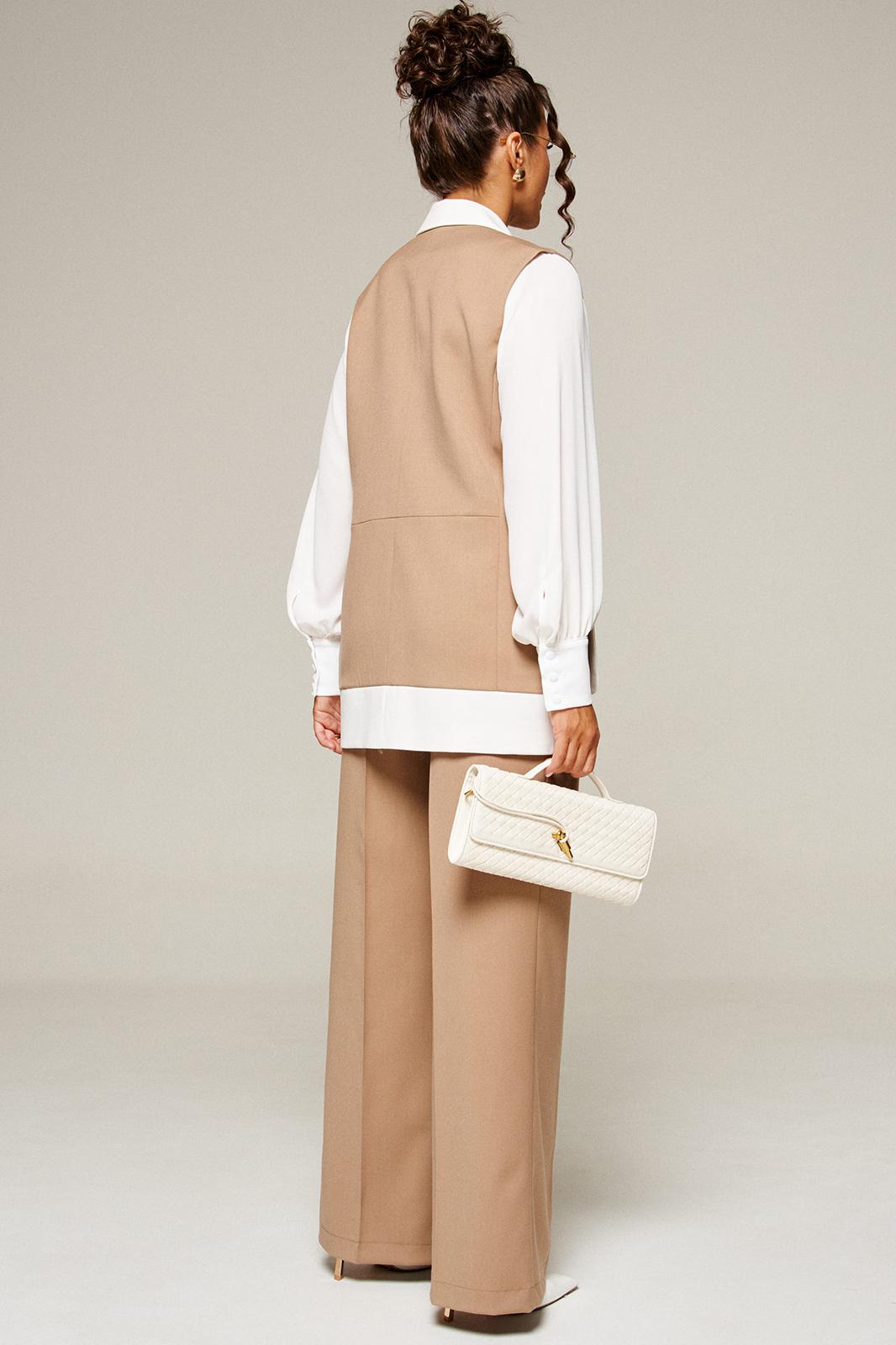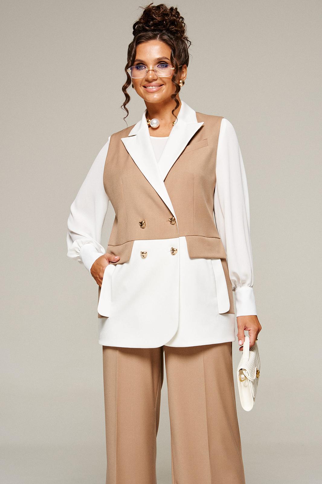 Комплект женский 3-ёх предметный: жилет, брюки, блузка в деловом стиле. Выполнен из костюмно-смесового полотна с нежной, гладко-бархатистой фактурой, приятной на ощупь и матовой поверхностью в контрастном сочетании актуальных оттенков.