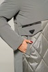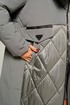 Перед асимметричный. С правой стороны расположены кокетка и вертикальный подрез от неё. В кокетку вставлена декоративная молния и клапан с пришивным отделочным элементом. На центральной правой части переда расположен боковой прорезной карман с обтачкой. С левой стороны – два вертикальных рельефа: от плеча (в который вставлена часть молнии) и от проймы, а также боковой прорезной карман на молнии с декоративным фиксатором. Центральные части переда выполнены из отделочной стеганой ткани с блеском аналогичного оттенка с цветом изделия.