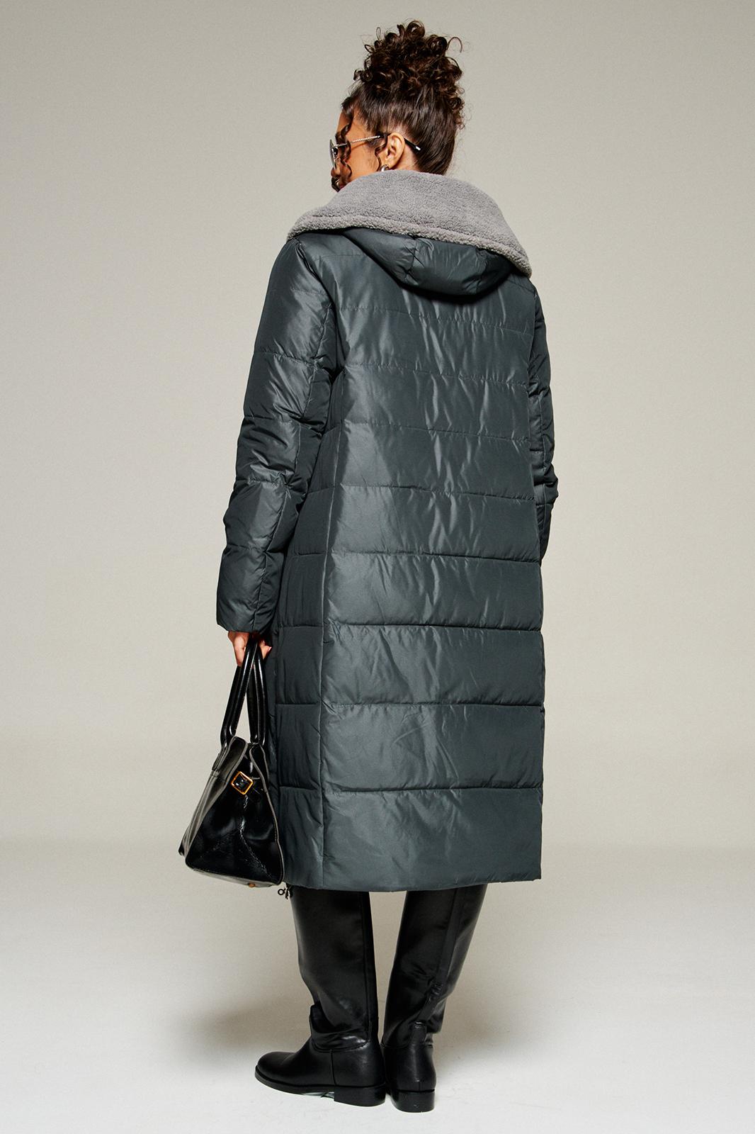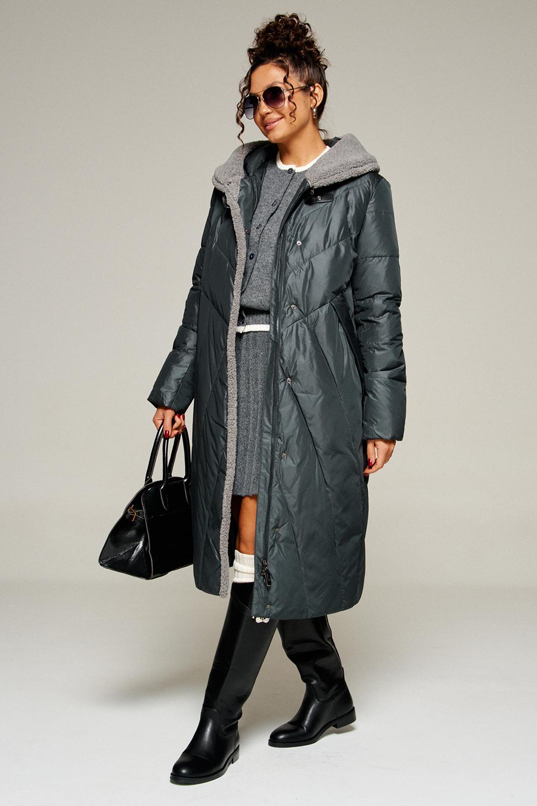 Застежка центральная на двустороннюю молнию от верха до низа и кнопки. Под капюшоном спереди настрочен дополнительный элемент застежки из экокожи.