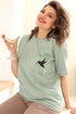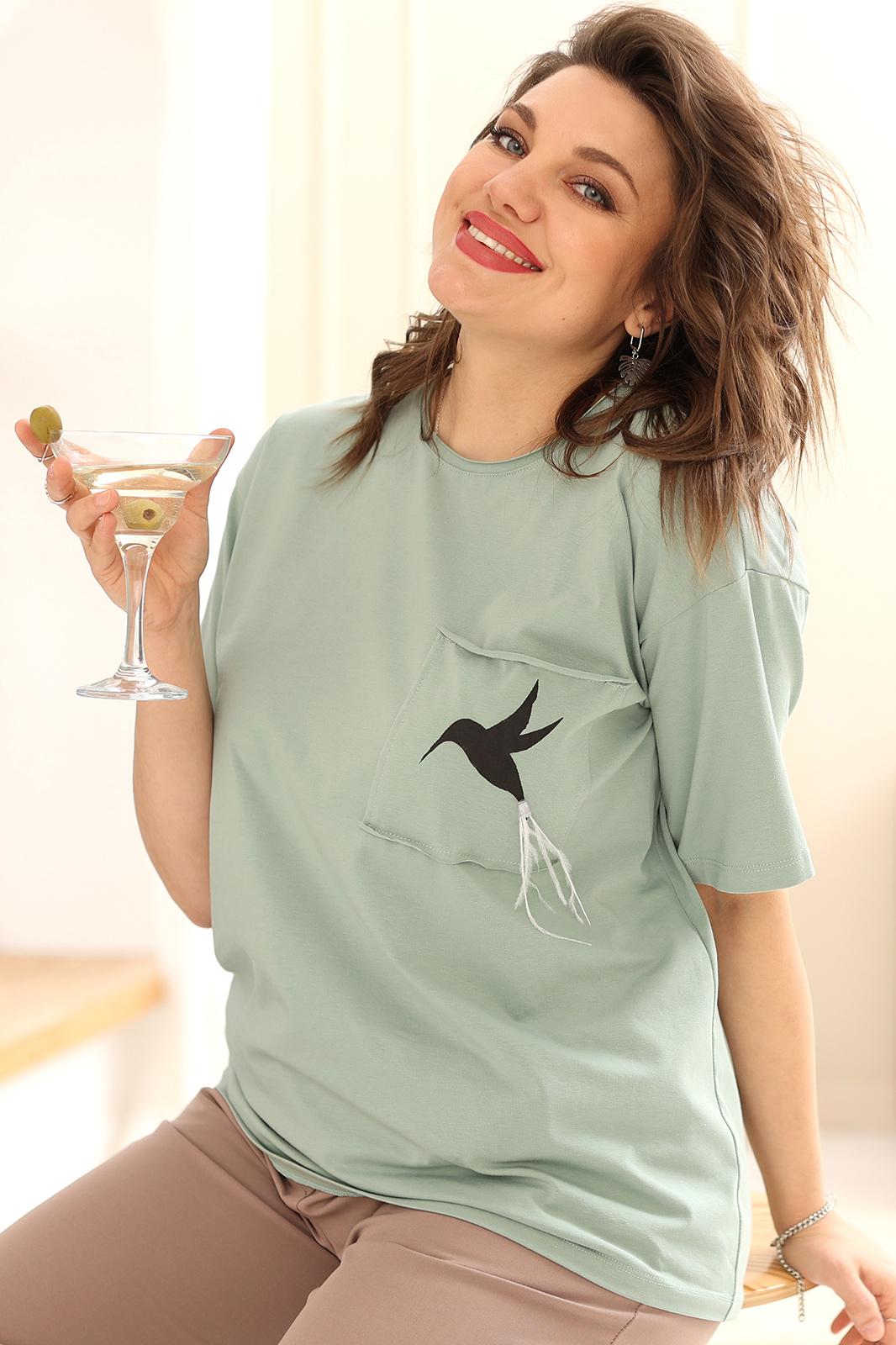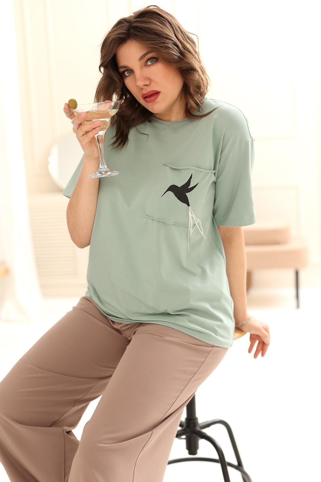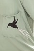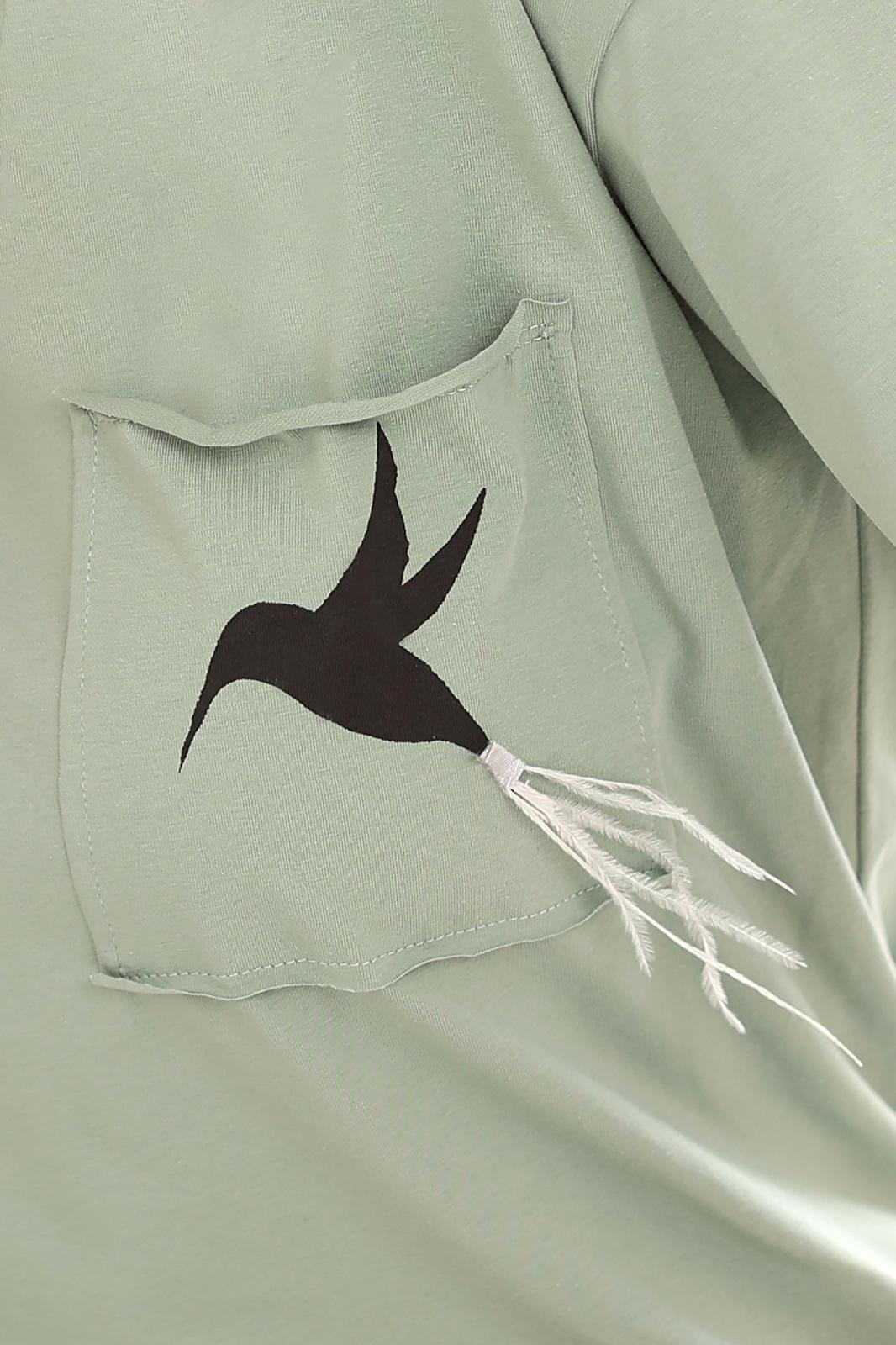 Горловина полукруглой формы обработана обтачкой. Линия плеча слегка спущена. Рукав втачной, оформлен подворотом наружу. Спинка длиннее полочки и имеет форму полукруга по низу. Блуза декорирована настрочным карманом с принтом в виде Колибри, нанесённым вручную! Интересной деталью является хвостик птицы, который выполнен из перьев. Его можно легко снять при стирке изделия.