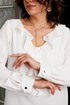 Базовая блуза свободного кроя с V-образным вырезом, который декорирован волнистой рюшей, визуально удлиняет шею и вытягивает силуэт. Рукав втачной с фигурной манжетой с функциональной пуговицей золотистого цвета.