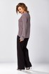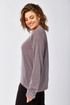 Горловина полукруглой формы, обработана обтачкой с открытым срезом, линия плеча слегка спущена. Рукав втачной, присборен с помощью пришивной металлической шильды. Спинка изделия длиннее полочки и имеет форму полукруга по низу. Низ изделия и рукава обработан декоративной плоскошовной строчкой.