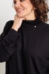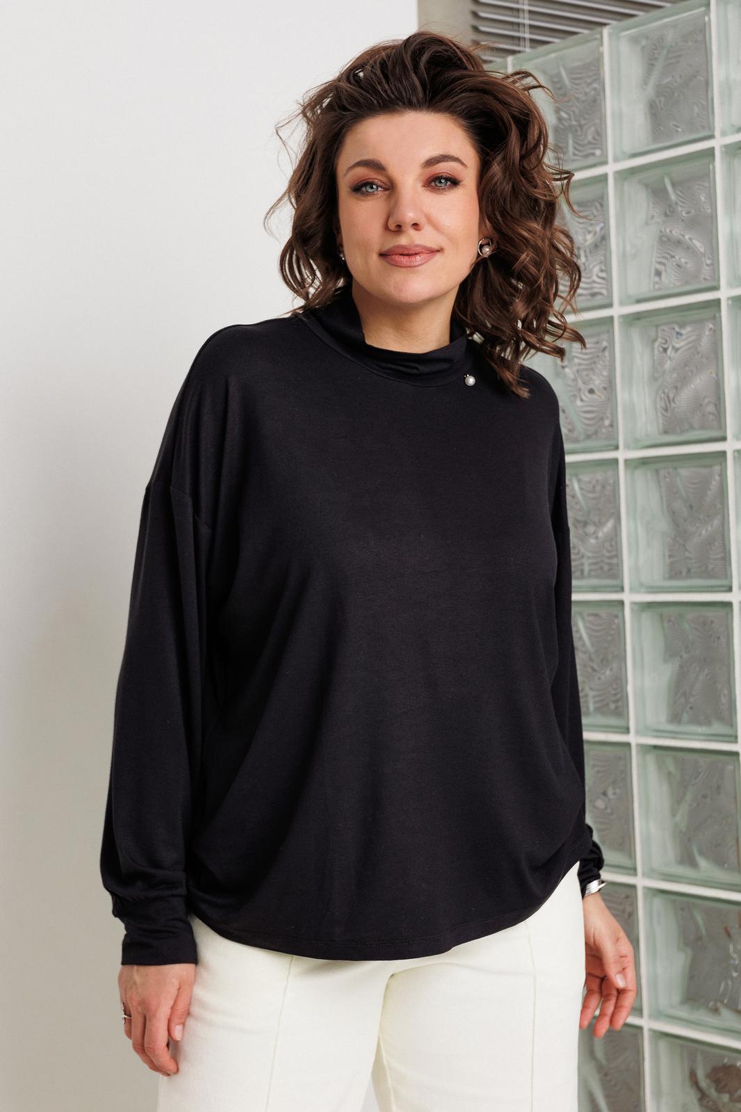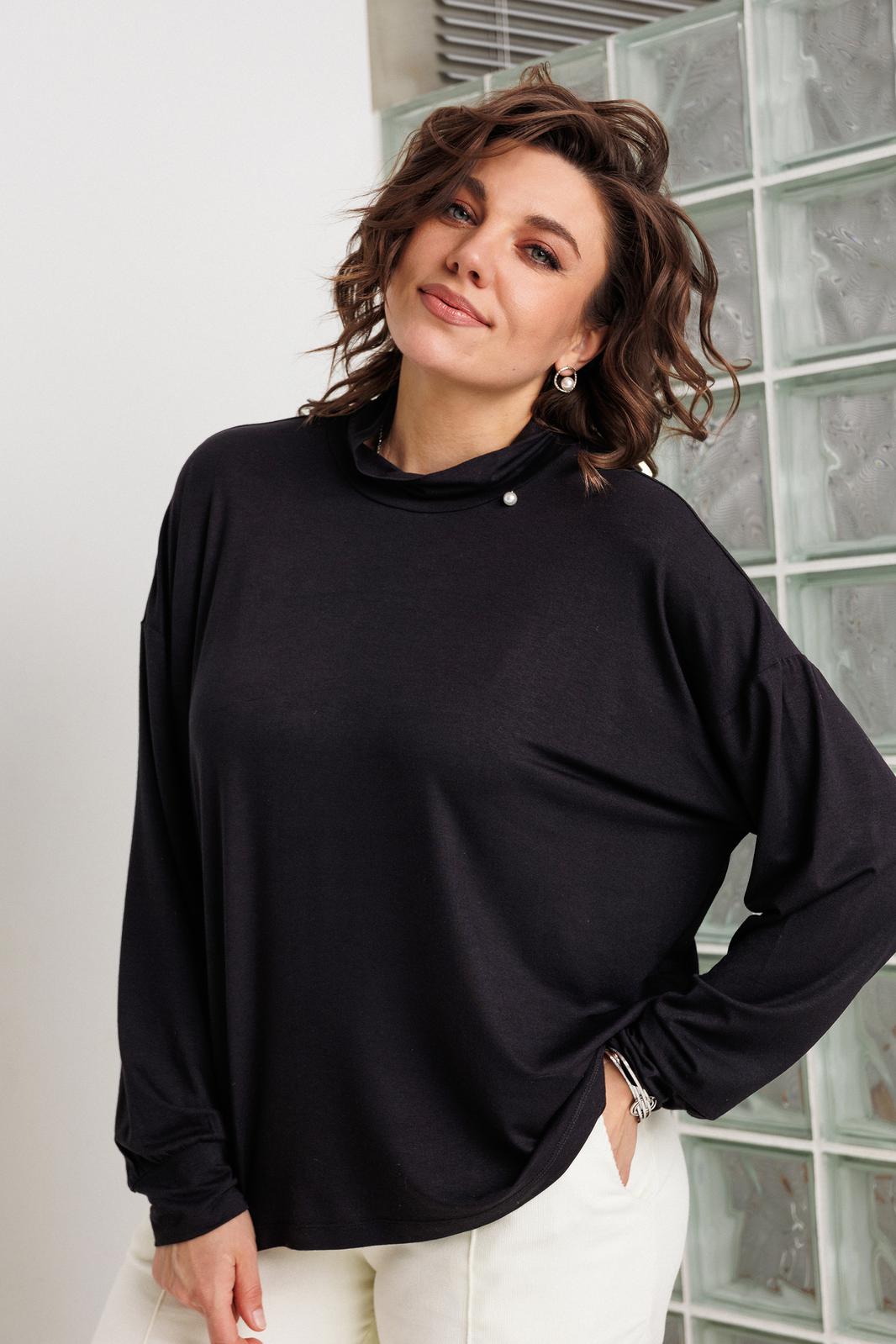Трикотажный лонгслив с высоким горлом, декорирован жемчужной бусиной, приковывающей к себе взгляды. Базовая модель в классическом черном цвете прекрасно впишется в гардероб как самостоятельный элемент, так и как первый слой под жакет. Крой прямой, линия рукава приспущена, низ обработан манжетой.