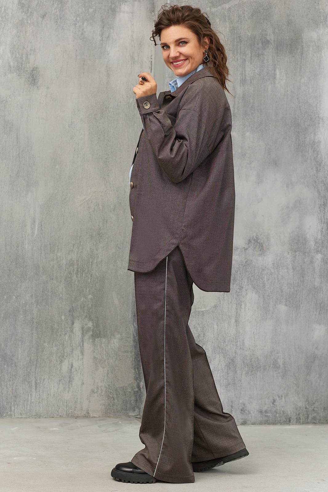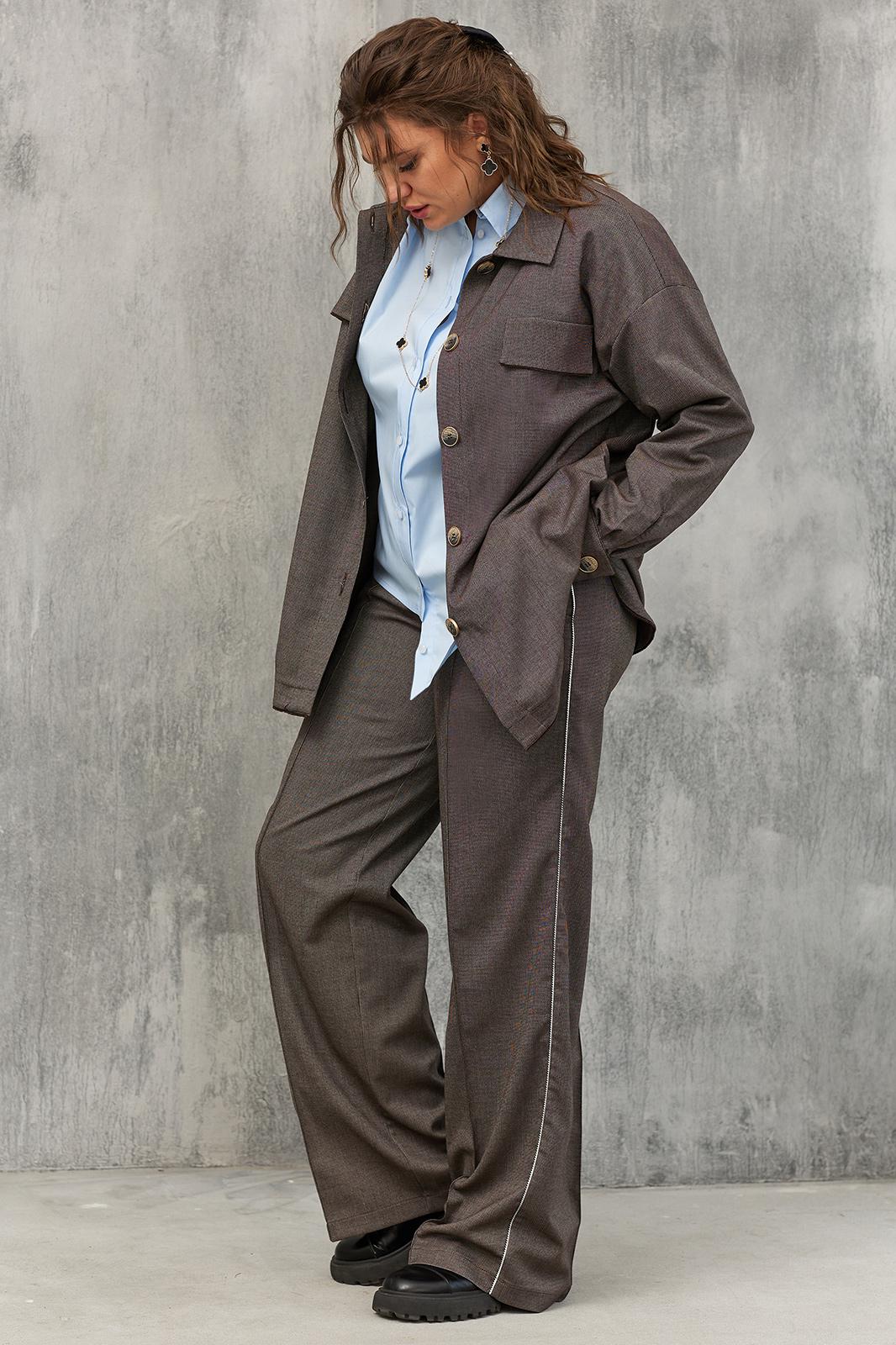 Сет, состоящий из жакета в виде рубашки и брюк палаццо- идеальное воплощение современных тенденций в мире моды. В этом комплекте Вы не только будете выглядеть элегантно, но и чувствовать себя комфортно на протяжении всего дня. Рубашка выполнена в стиле оверсайз. По линии груди декоративные клапаны, по линии низа декорированные кромкой материала. Рукав имеет спущенную пройму, линии низа обработан манжетой с застёжкой на пуговицу Полочка имеет функцию застёжки на пуговицы. Спинка немного длиннее полочки. Низ изделия декорирован кромкой основного материала. Удобные, элегантные брюки палаццо- с высокой талией прекрасно моделируют силуэт, стройнят и визуально удлиняют ножки благодаря застроченным стрелкам и лампасу по боковому шву изделия. В боковых швах карманы хулиганы. Блузу и брюки можно приобрести отдельно.