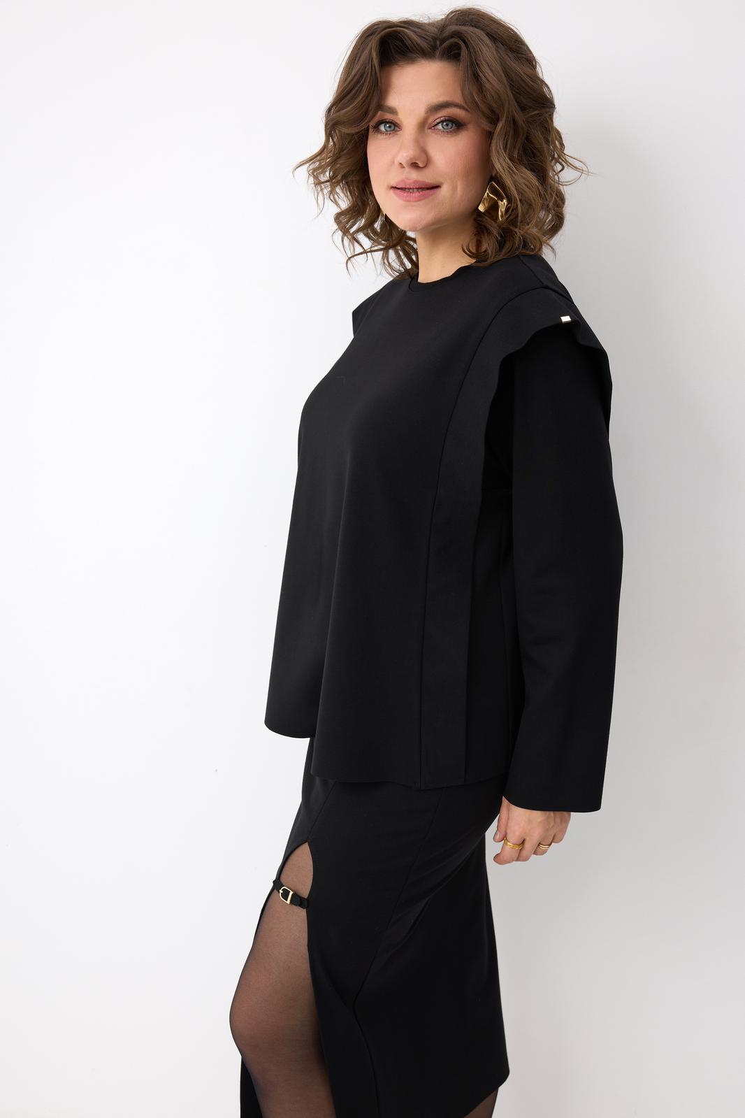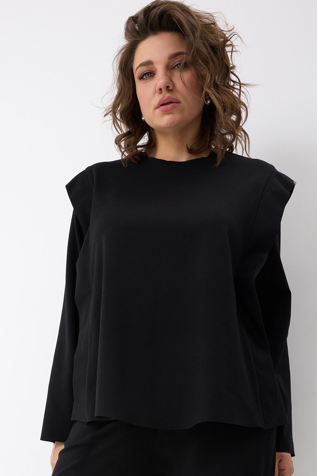 Свитшот прямого кроя с цельной декоративной планкой по передней и задней части. Благодаря конструктивным особенностям модель делает акцент на линии плеча и создаёт дополнительную вертикаль, что невероятно стройнит и вытягивает силуэт! Горловина обработана обтачкой с открытым срезом. Также, низ рукава и низ изделия имеют открытые срезы. На плечах - металлические декоративные зажимы золотистого цвета.