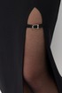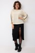 Юбка прямого кроя, пояс притачной на резинке, низ изделия обработан подгибкой. Разрез декорирован пришивной функционально- декоративной металлической пряжкой.
