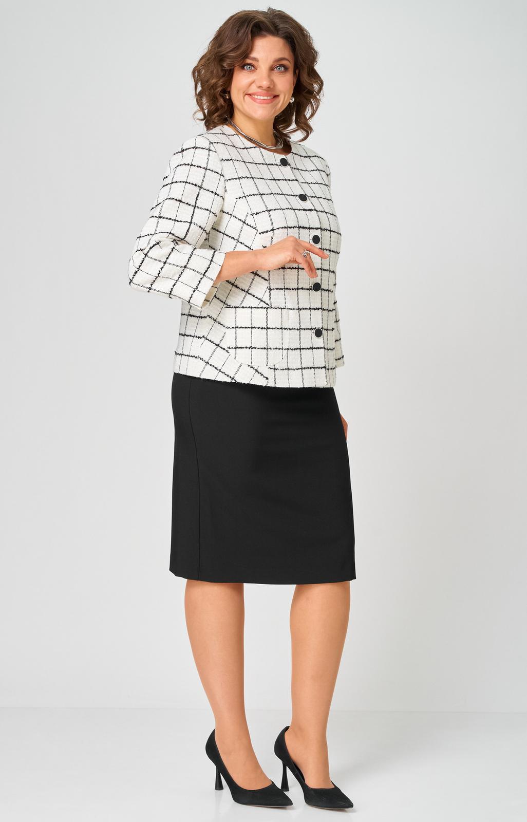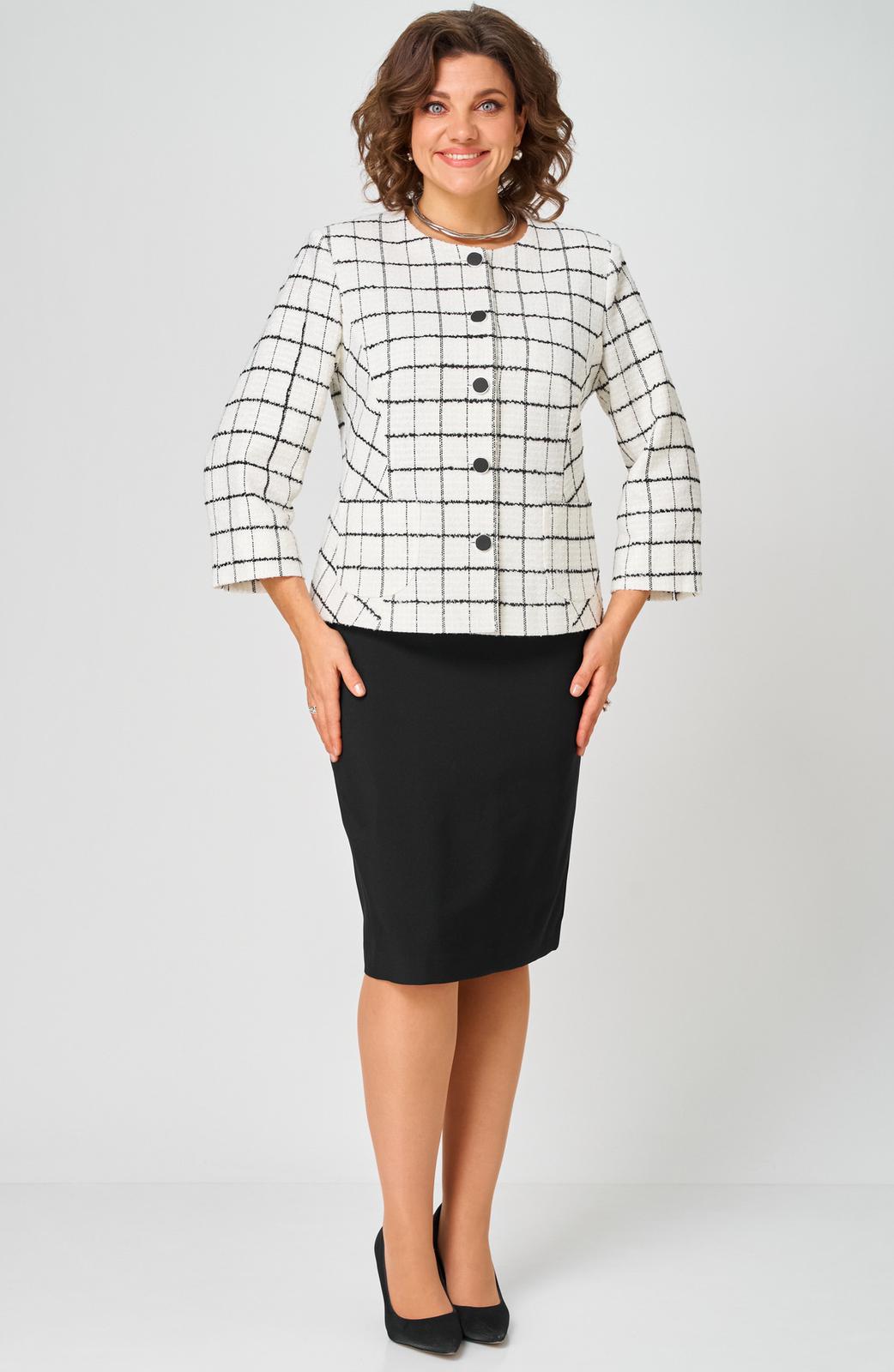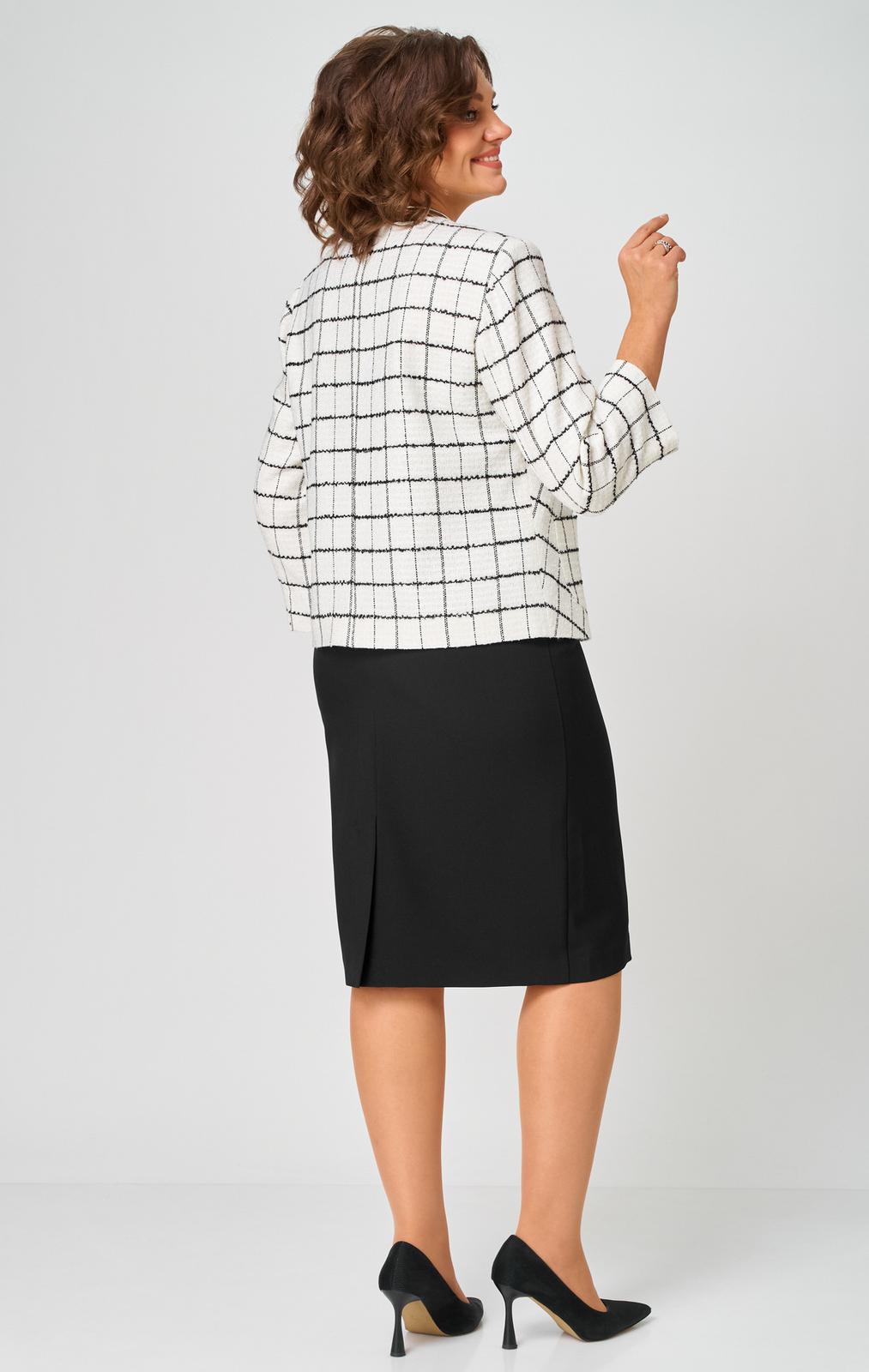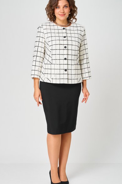 Элегантный комплект на все случаи жизни: классический жакет из твида и прямая юбка. В жакете классический округлый вырез горловины, центральная застежка на петли-пуговицы и функциональный накладной карман добавляют образу солидности и завершенности.Укороченный двухшовный рукав — современный и практичный вариант. Полная подкладка не дает жакету тянуться и обеспечивает комфорт при носке. Длина жакета по спинке 56 см, длина рукава 52см. Юбка-прямой стройнящий силуэт, верхний срез на обтачке, потайная молния и удобная шлица. На подкладке. Длина по боковому шву 65 см.