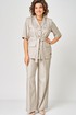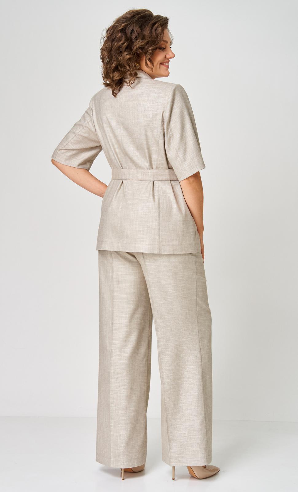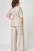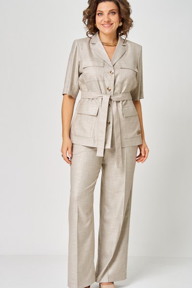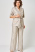 Комплект 2-х предметный состоит из жакета и и брюк. Стильный льняной жакет, без подкладки, прямого кроя, с центральной застежкой на петли-пуговицы. Дополнен накладными карманами с клапаном. Спинка со средним швом. Притален съемным поясом из ткани верха. Рукав втачной,короткий. Брюки-палаццо, средней ширины, выполнены с карманами с отрезным бочком в боковом шве. Пояс притачной, застёжка на молнию. По задним половинкам обработаны вытачки, и в области боковых вставлена резинка. Длина жакета по спинке 69 см, длина брюк по боковому 105 см.