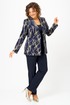 Жакет женский удлиненный, из текстильной ткани, на подкладке, полуприлегающего силуэта с центральной бортовой застежкой на пуговицы до линии перегиба лацкана. Спереди рельефные швы от плечевого шва, отрезной бочок и карман с клапаном. Спинка с рельефами от плечевого шва. Рукав втачной, двухшовный. Воротник пиджачного типа. Длина по спинке 66 см, длина рукава 62 см.