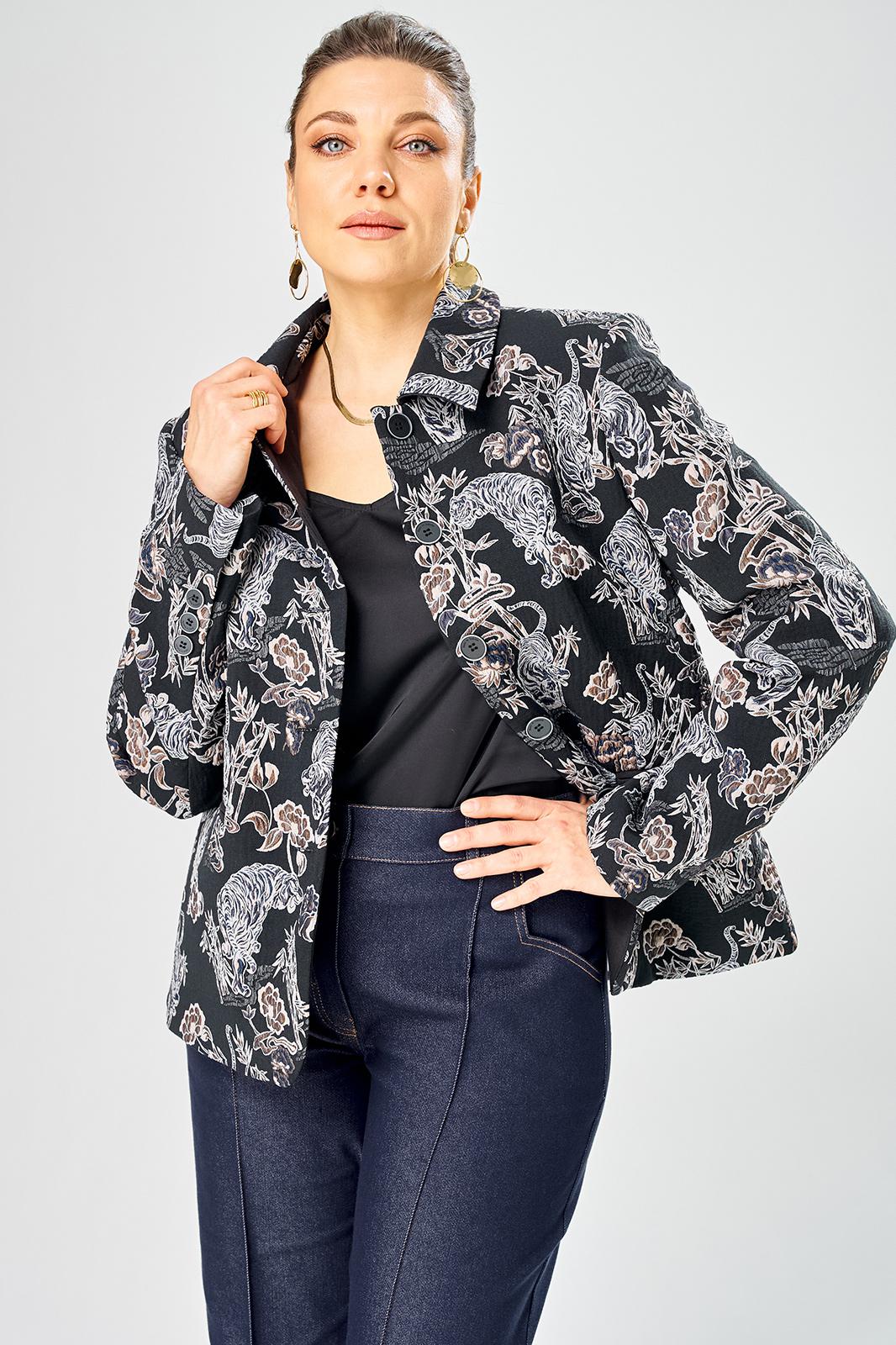 Стильный женский жакет из жаккардовой ткани с актуальным принтом.