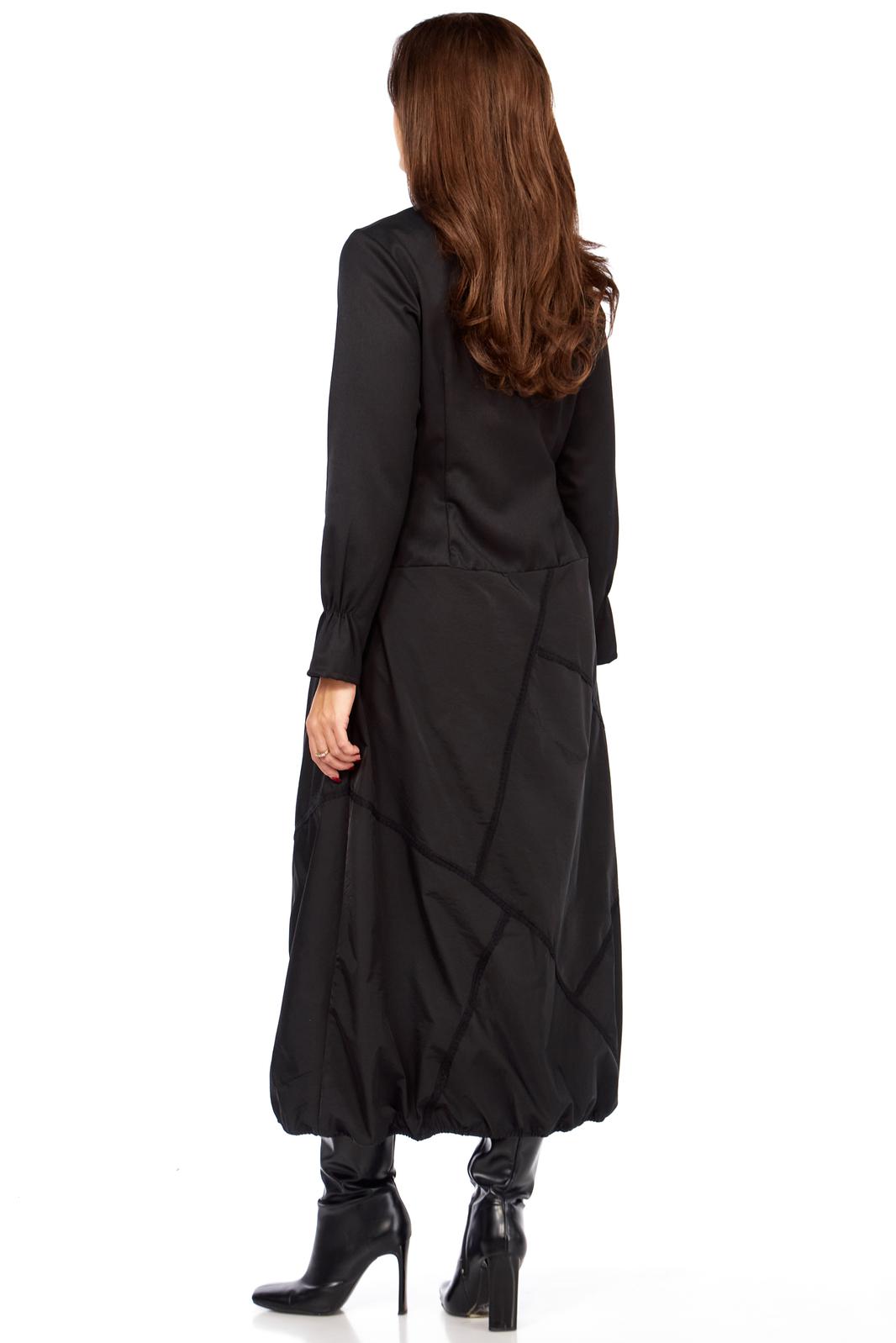 • Силуэт: Прямой, слегка расширяющийся к низу. Модель предполагает свободную посадку по фигуре. Нижняя часть платья имеет сложный крой, создающий эффект баллона или асимметричного многослойного объема.
