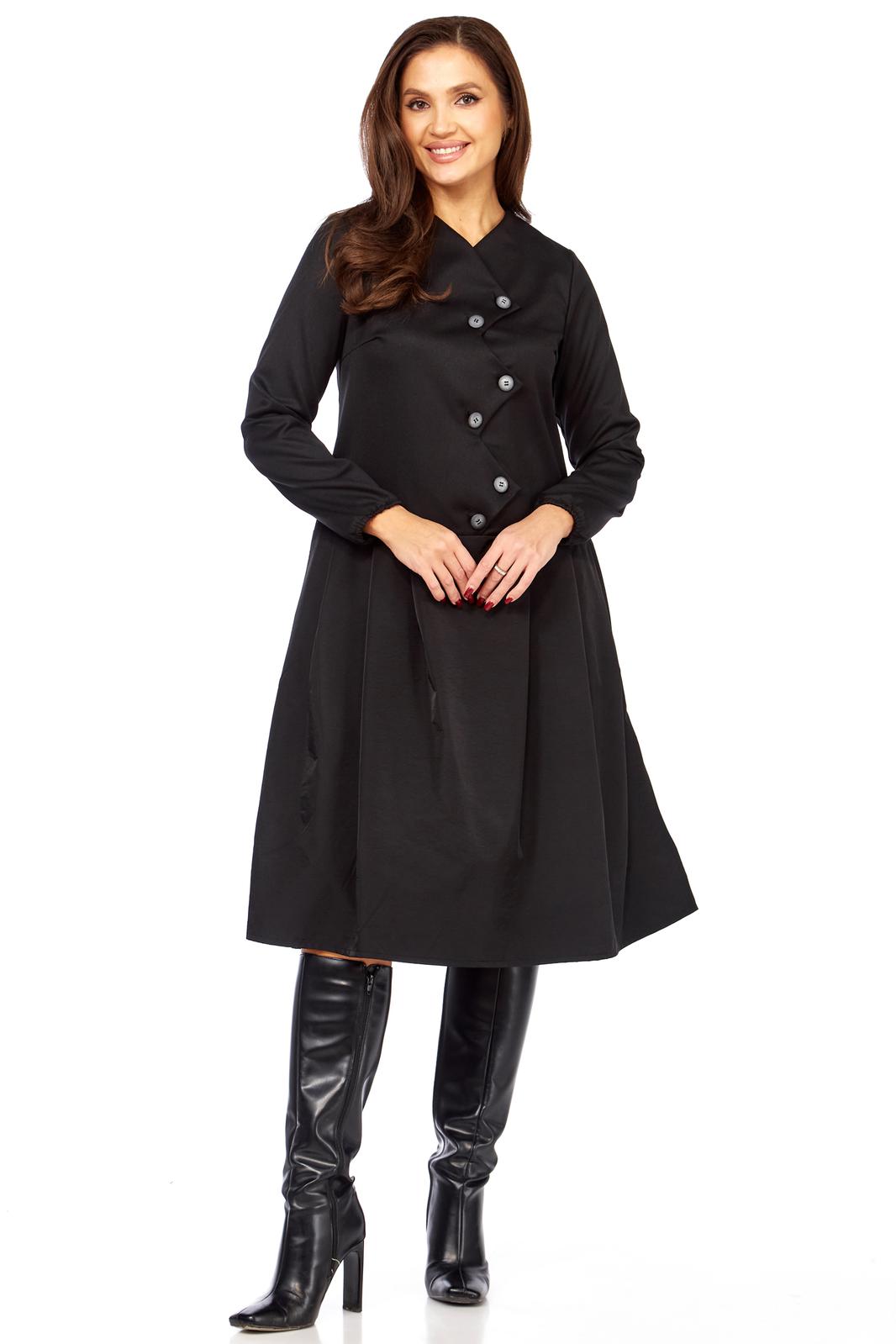 Это платье в глубоком черном цвете — настоящая находка для тех, кто ценит универсальность без компромиссов в стиле. Оно одинаково великолепно смотрится с лодочками для делового мероприятия, с ботильонами для похода в театр или с высокими сапогами для осенней прогулки.