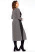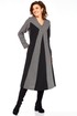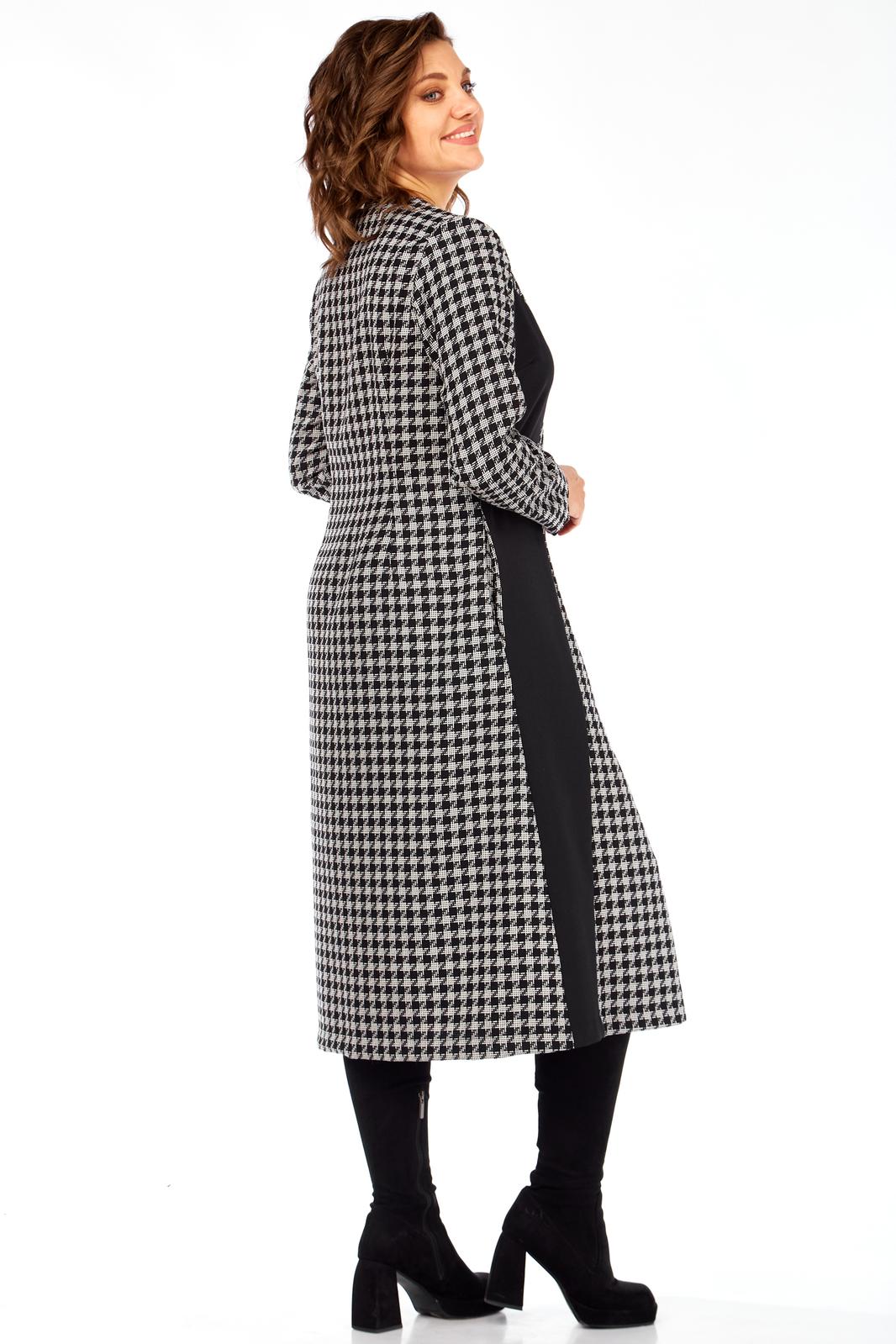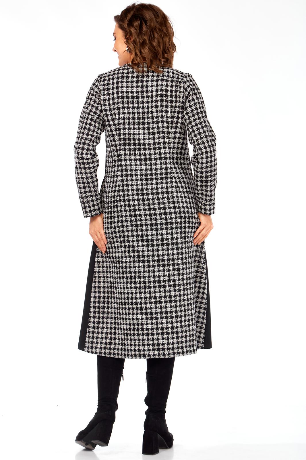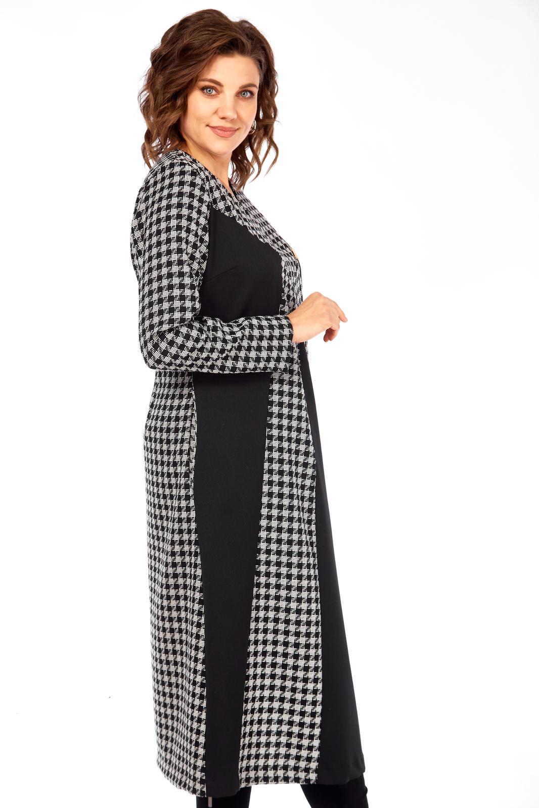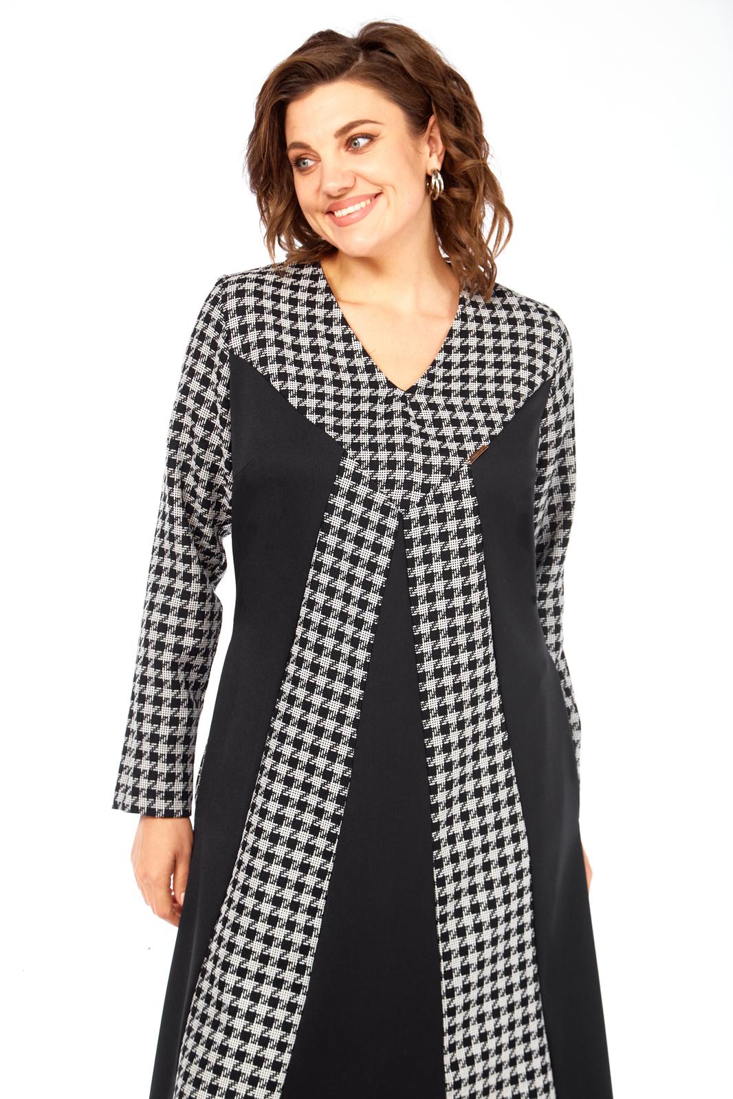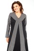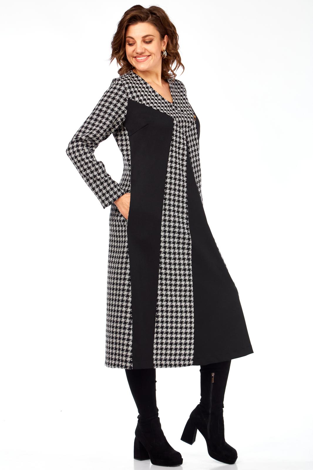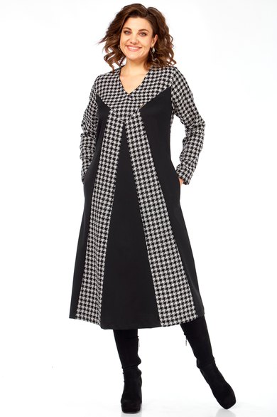 Платье миди в графичном дизайне в свободном А-силуэте, плавно расширяющийся от груди к низу, обеспечивающий максимальный комфорт и непринужденную элегантность. Классический V-образный вырез, который визуально удлиняет шею. Рукава и часть лифа (верхняя внешняя часть плеч и рук) выполнены из ткани с классическим черно-белым принтом гусиная лапка. Центральная часть лифа спереди оформлена двумя крупными, контрастными черными треугольными вставками, которые сходятся к вершине V-образного выреза. Эти вставки создают четкий, динамичный геометрический рисунок. Рукава длинные, втачные, из ткани гусиная лапка, без дополнительных декоративных элементов на манжетах. Спинка платья без центрального шва с выточками для лучшего прилегания модели. В платье имеются боковые карманы для большего удобства. Длина рукава 62 см длина платья 115см