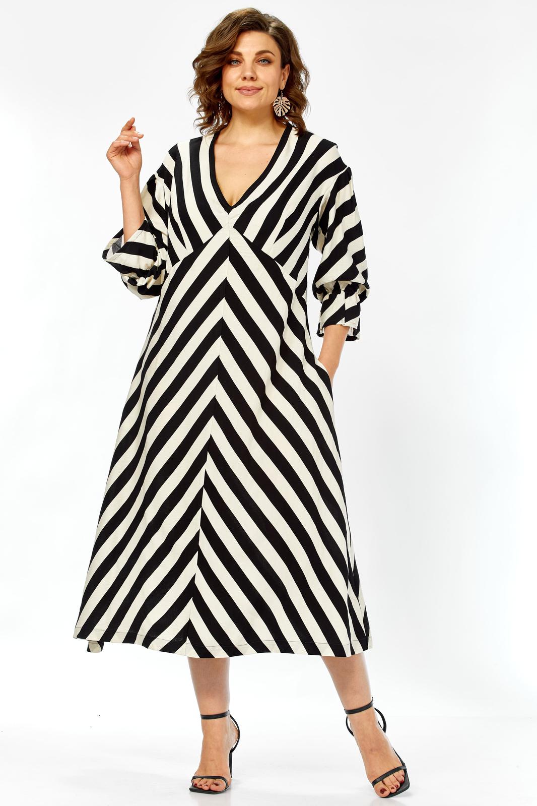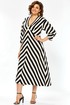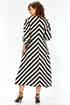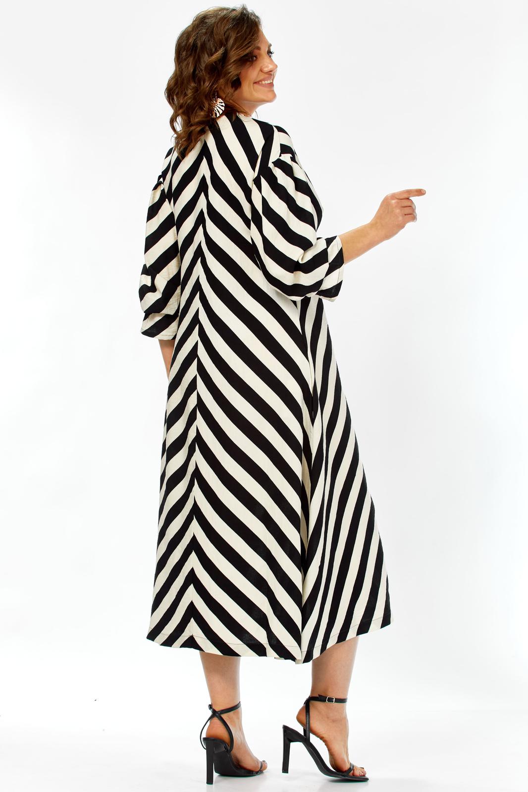 Главная изюминка модели — контрастный черно-молочный принт в широкую полоску. Уникальность ему придают особым образом расположенные полосы: на лифе они идут по диагонали, а на юбке — вертикально, сходясь по центру передней полочки (полоска не совмещается). Такое расположение полос придает платью графичность и визуально вытягивает силуэт.