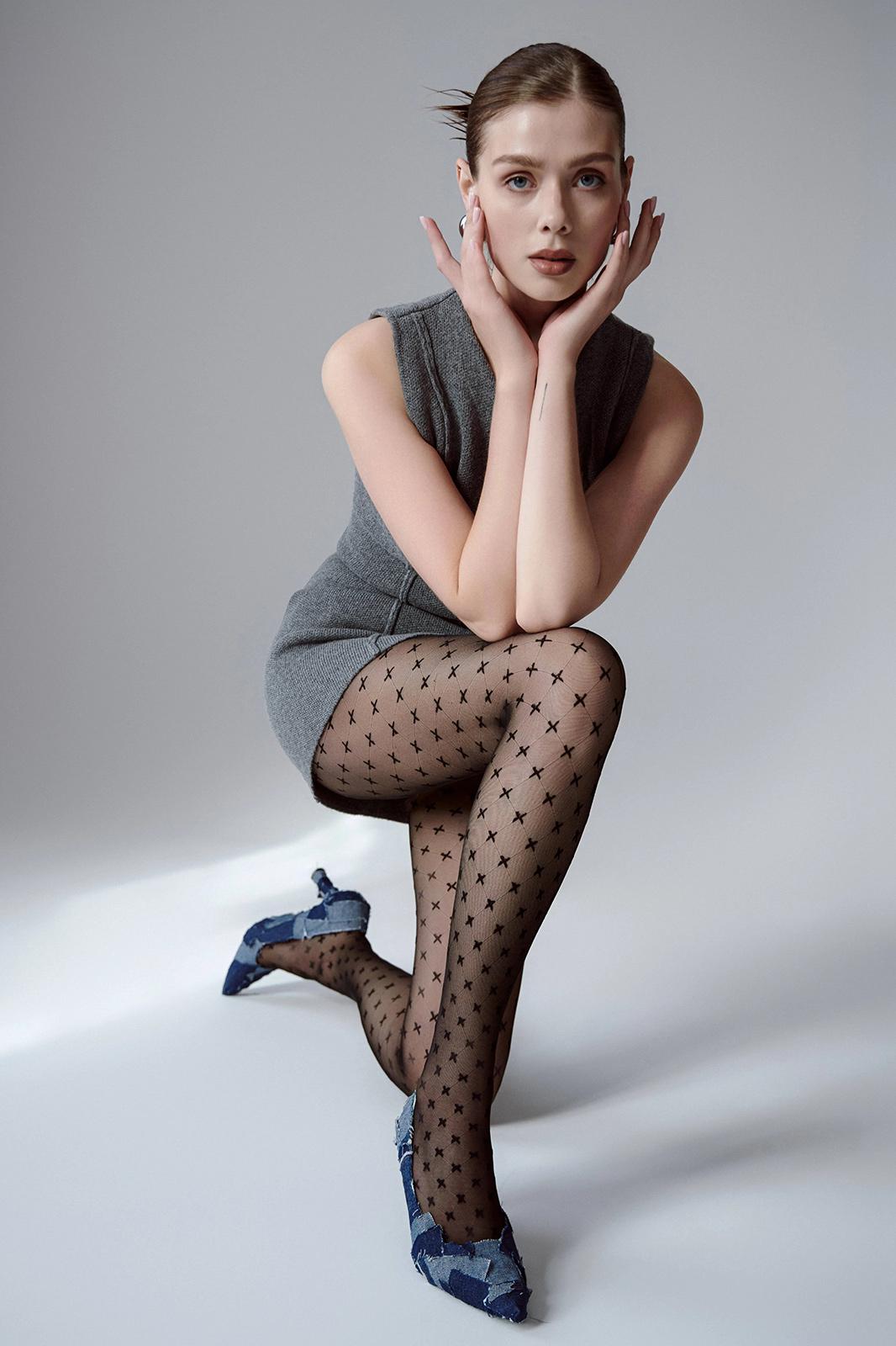 С геометрическими ромбами и рисунком «крестики» можно экспериментировать совершенно по-разному, используя эти лаконичные колготки как в вечерних, так и в деловых или повседневных образах.