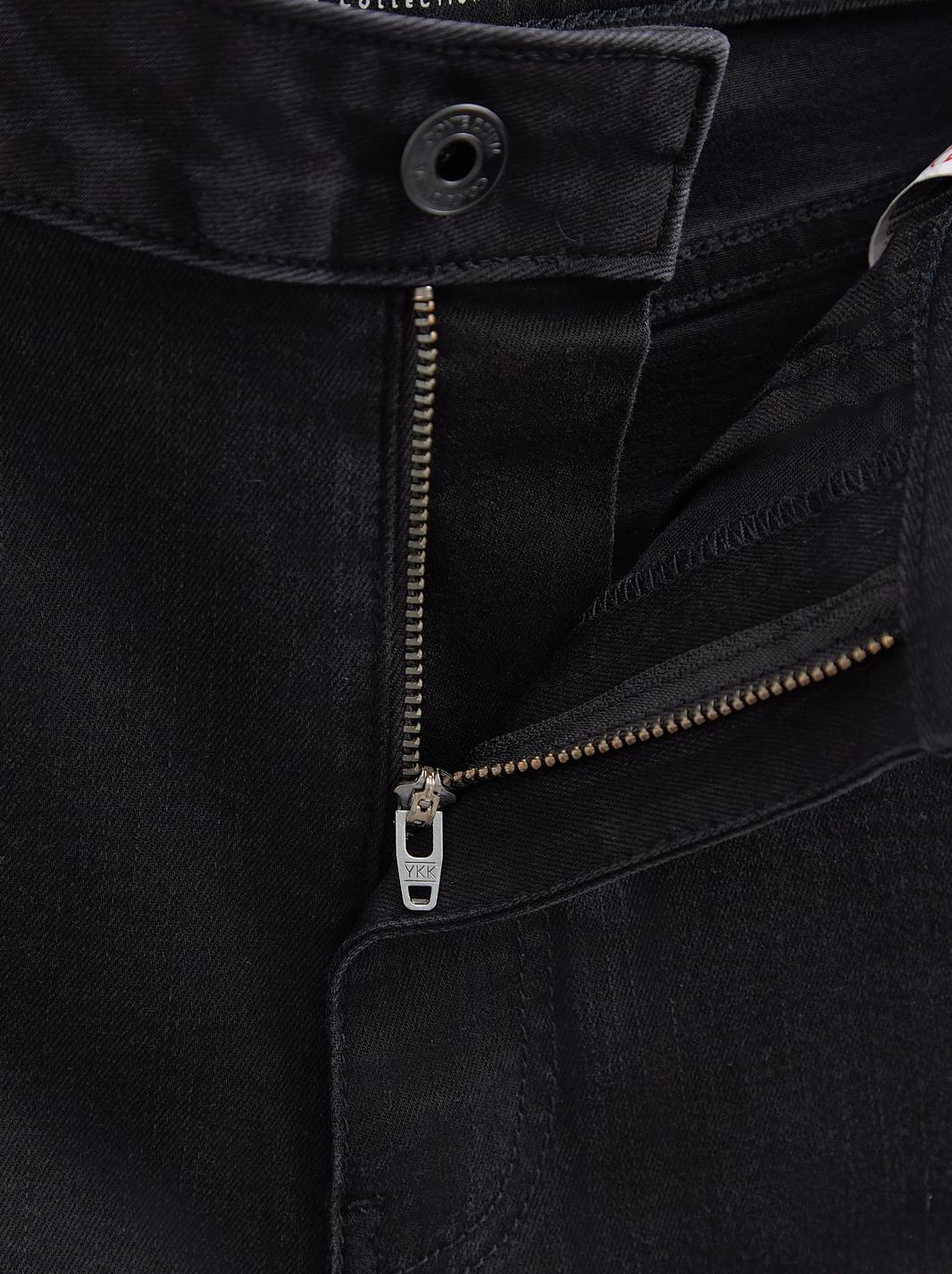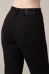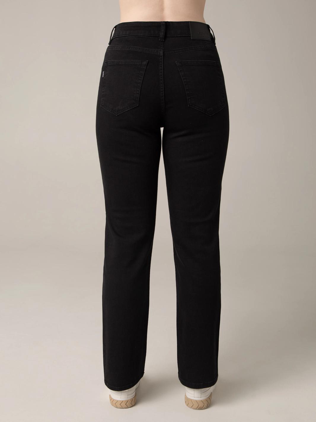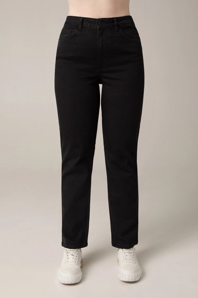 Джинсы с высокой посадкой из плотного, но эластичного денима красиво и комфортно садятся по фигуре, не добавляя силуэту ненужный объем.