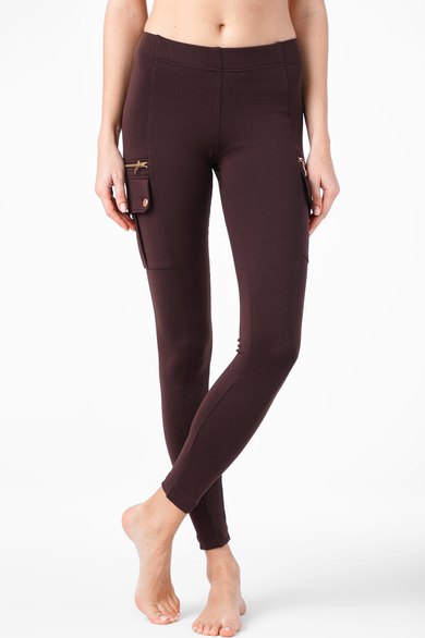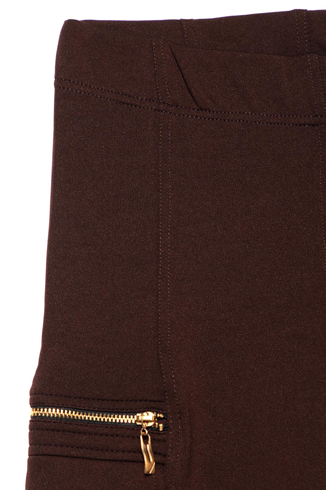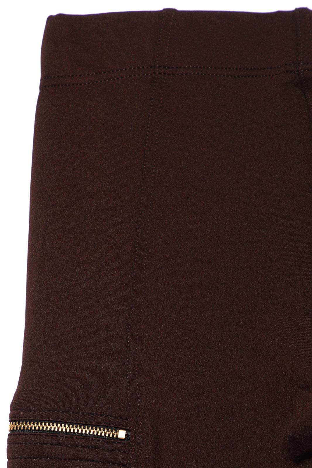Леггинсы женские облегающие из трикотажного полотна с рельефными швами по переду и спинке. На бочках изделия накладные карманы с бантовой складкой, с клапанами и декоративные молнии. Верх изделия обработан широкой эластичной тесьмой швом в подгибку.