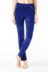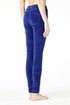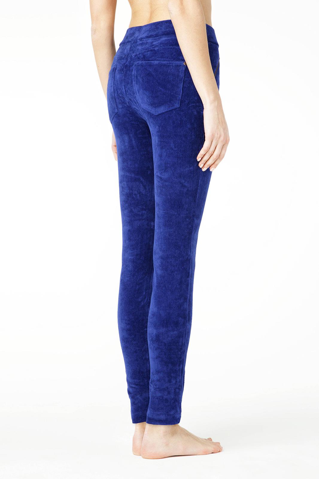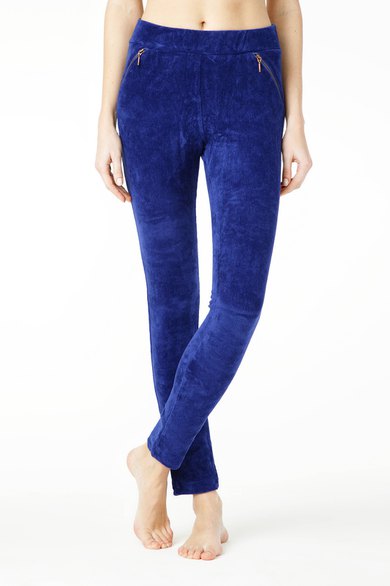 Леггинсы женские облегающие из трикотажного полотна вельвет, с боковыми карманами. По низу боковых швов - разрезы с декоративными молниями. По задней части - кокетки. Гульфик, кокетки переда и задней части, шов сидения с отделочными строчками. Верх изделия обработан широким поясом с широкой резинкой внутри.