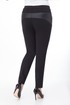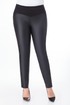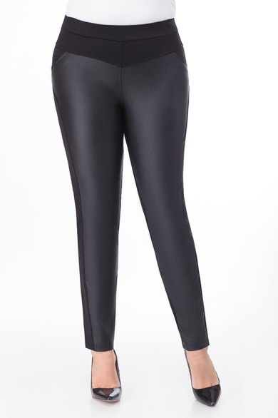 Длина изделия 98 см. Брюки зауженного кроя, выполнены из экокожи и плотного трикотажного полотна.