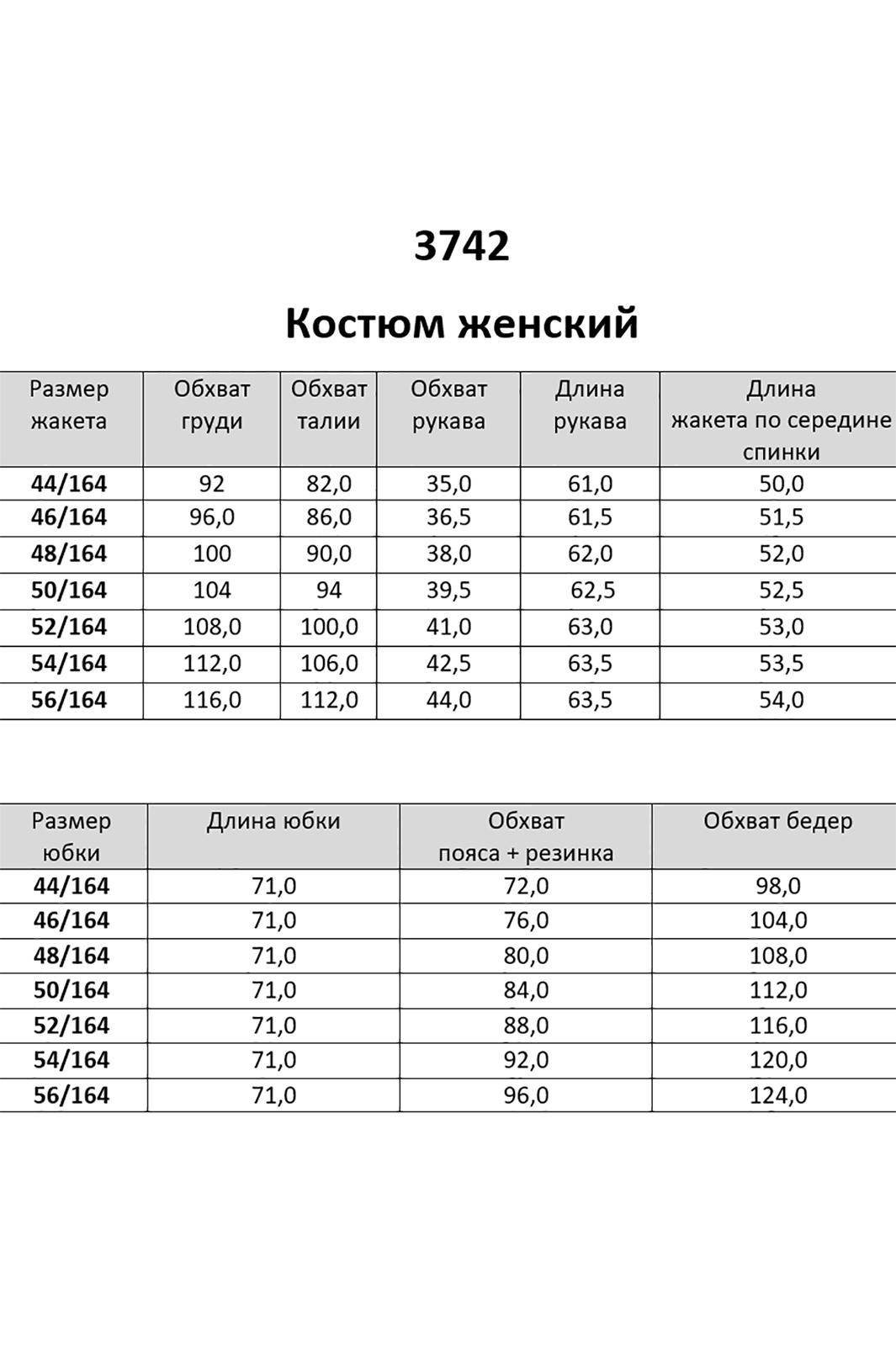 Костюм женский состоящий из двух предметов жакета и юбки на подкладке. Жакет приталенного силуэта, с втачным рукавом и центральной застежкой на пуговицы и петли. По переду жакета расположены клапаны, имитирующие карман. Украшением жакета является оборка из отделочной ткани по горловине, краю борта и низу рукава. По переду и спинке жакета расположены вытачки. Рукав двухшовный, длинный на шлице рукава. По переду и спинке жакета расположены вытачки. Рукав двухшовный, длинный на шлице рукава пришиты декоративные пуговицы.