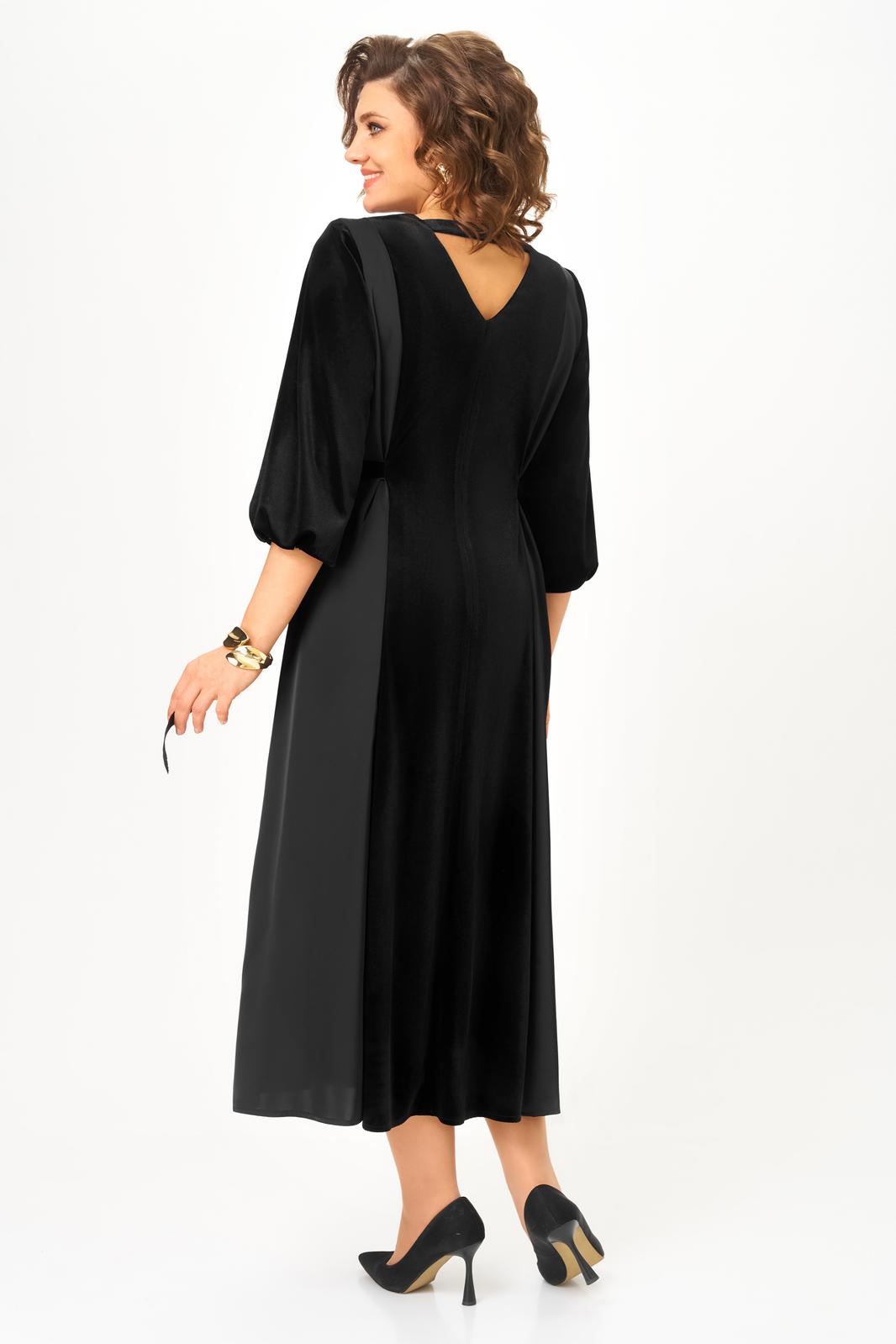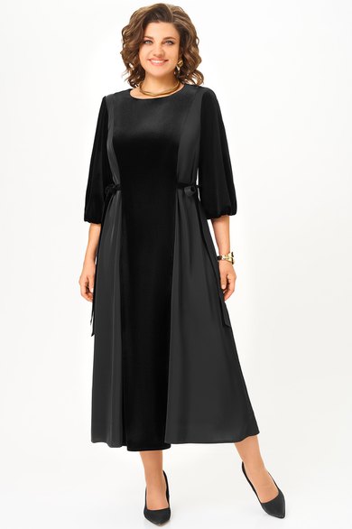 Платье женское, полуприлегающего силуэта, расширенное к низу. Состоит из двух видов ткани: трикотажа (велюр) и атласа.