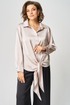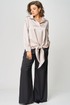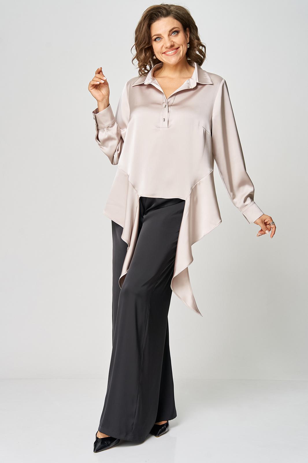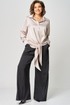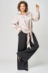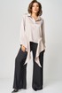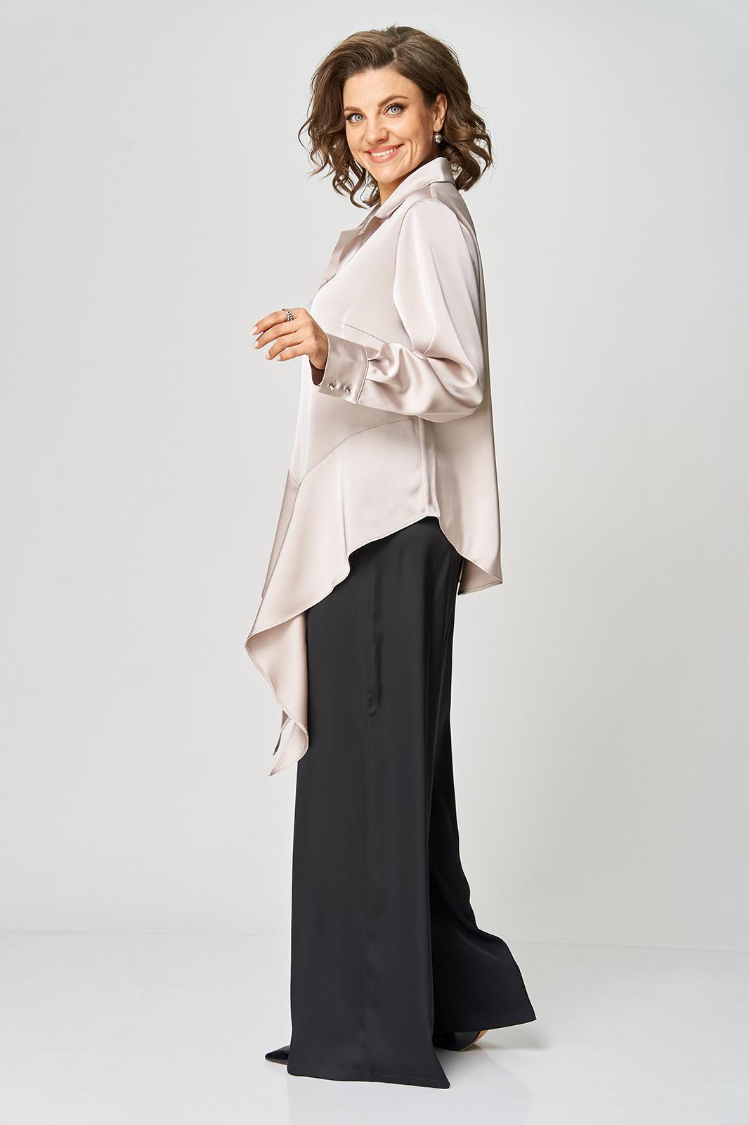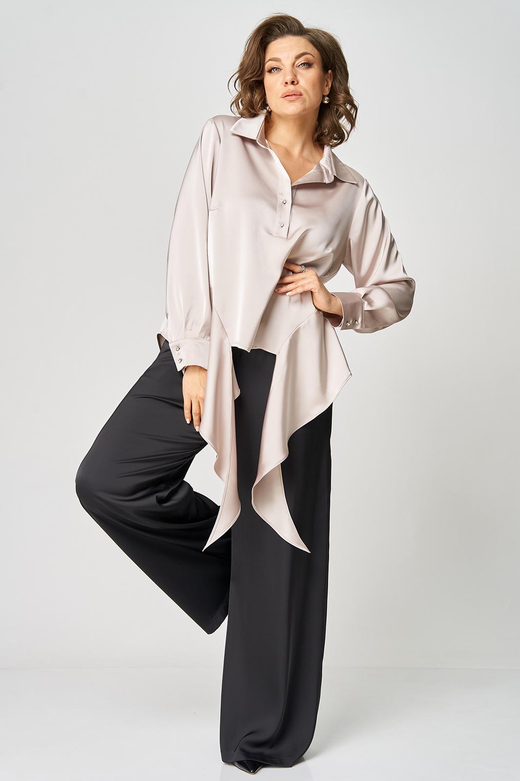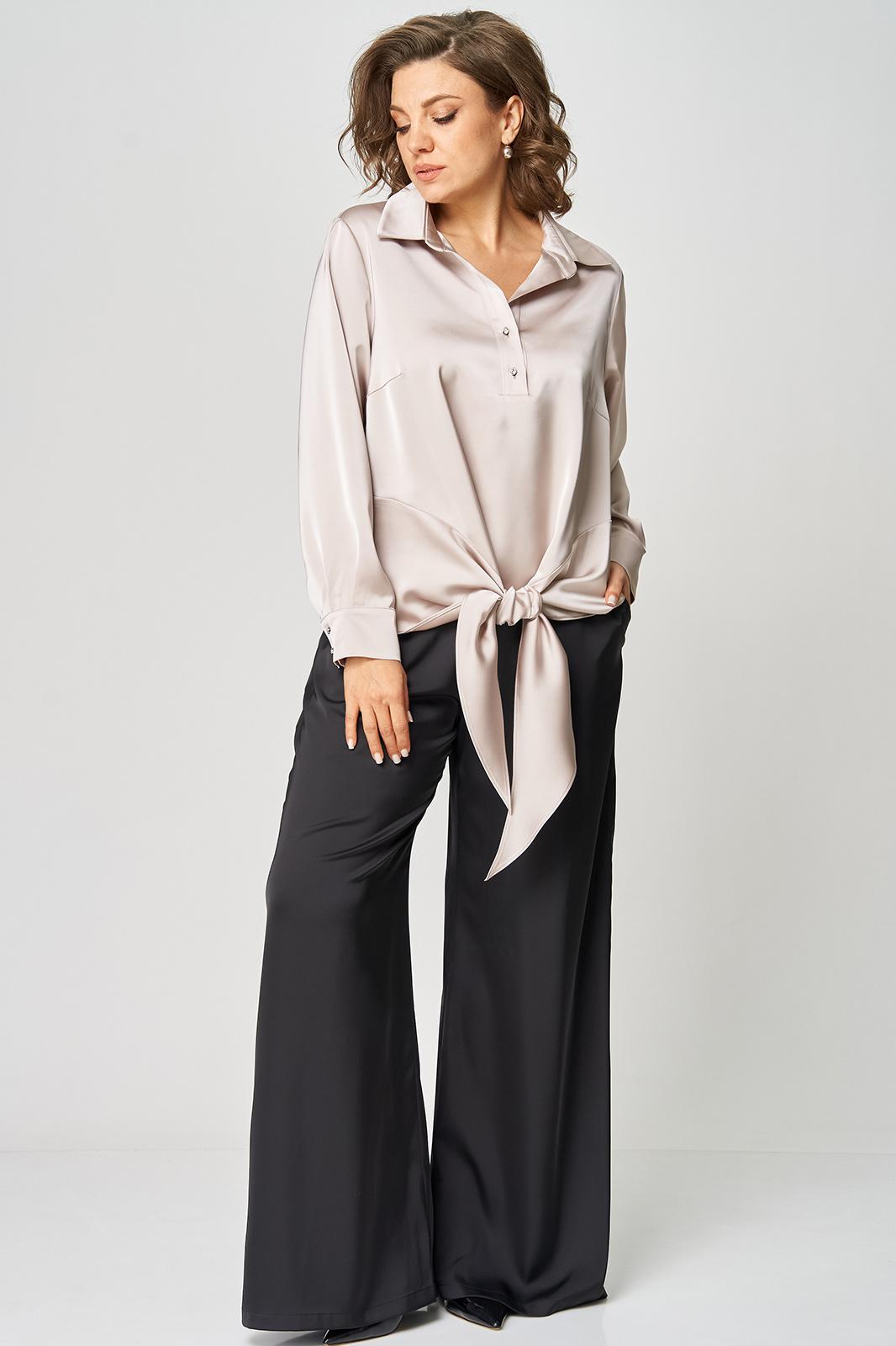 Роскошная двойка состоит из невероятно оригинальной блузки и брюк - палаццо. Наша блузка свободного силуэта средней длины, дополнена планкой по переду. Рукава втачные с естественным положением плеча на манжете. Горловина обработана рубашечным воротником. Пикантно смотрятся на блузке декоративные передние воланы-завязки, придавая образу игривость и кокетливость.