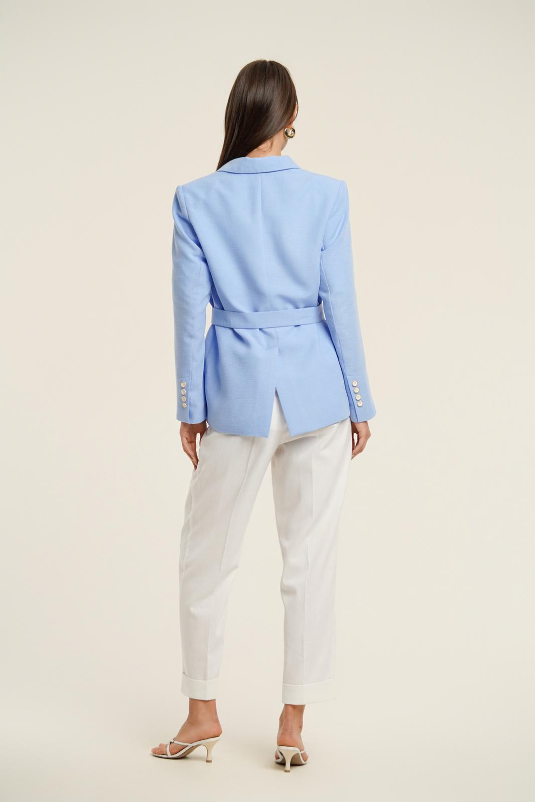 Жакет женский полуприлегающего силуэта, на подкладке. Воротник пиджачного типа, застежка на петлю и пуговицу. По переду в рельефах функциональные карманы. На спинке шлица. Рукав втачной двухшовный, с шлицей. Изделие дополнено съемным поясом.