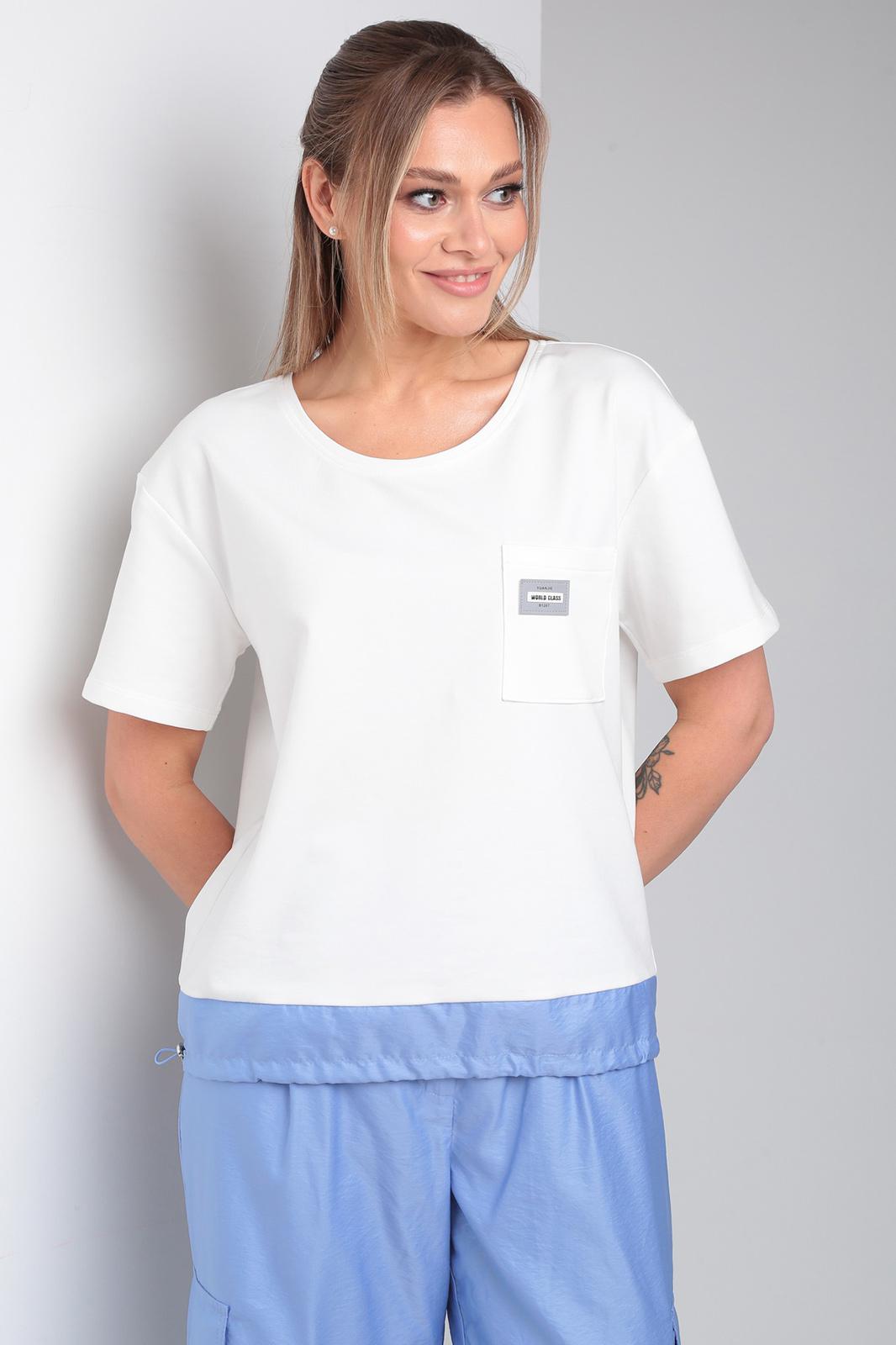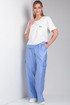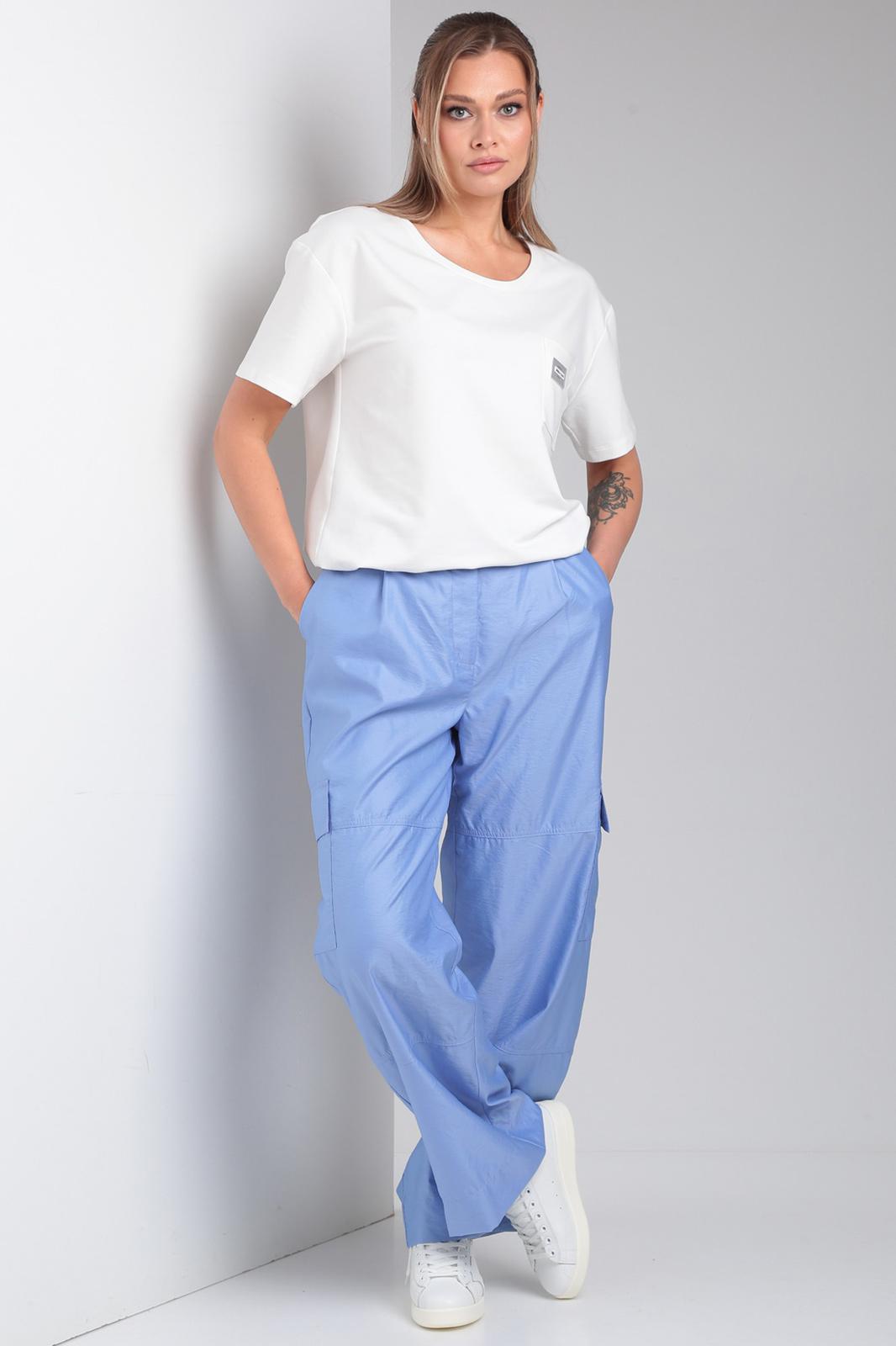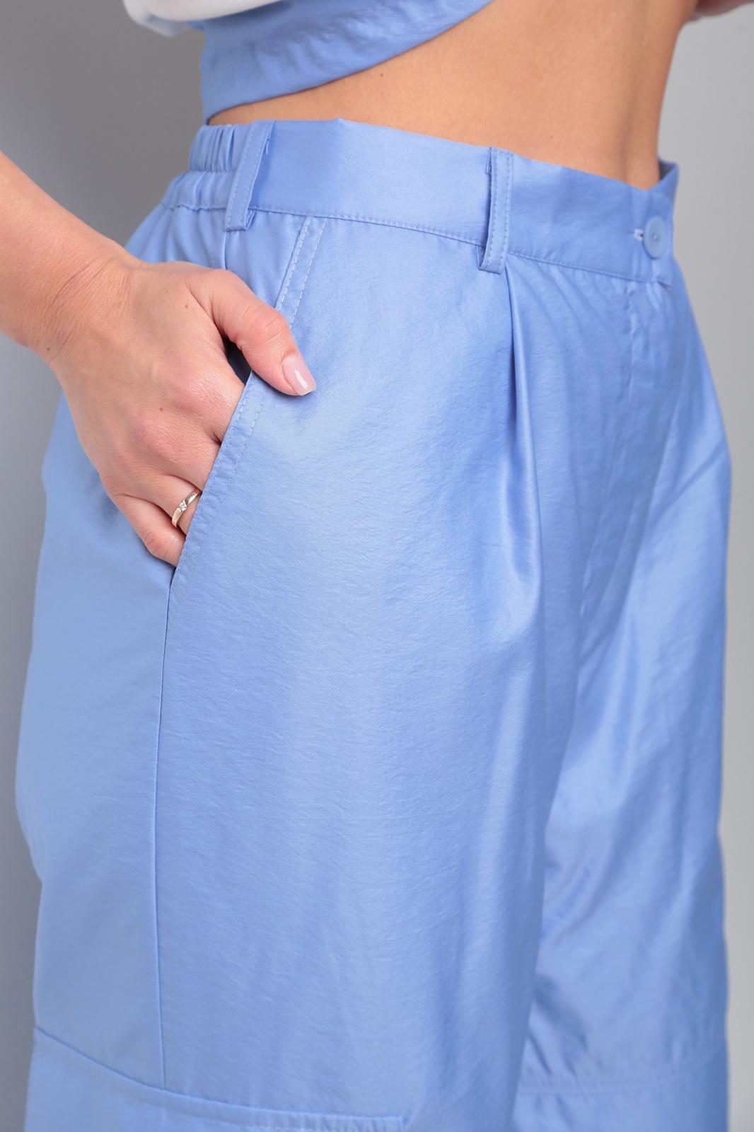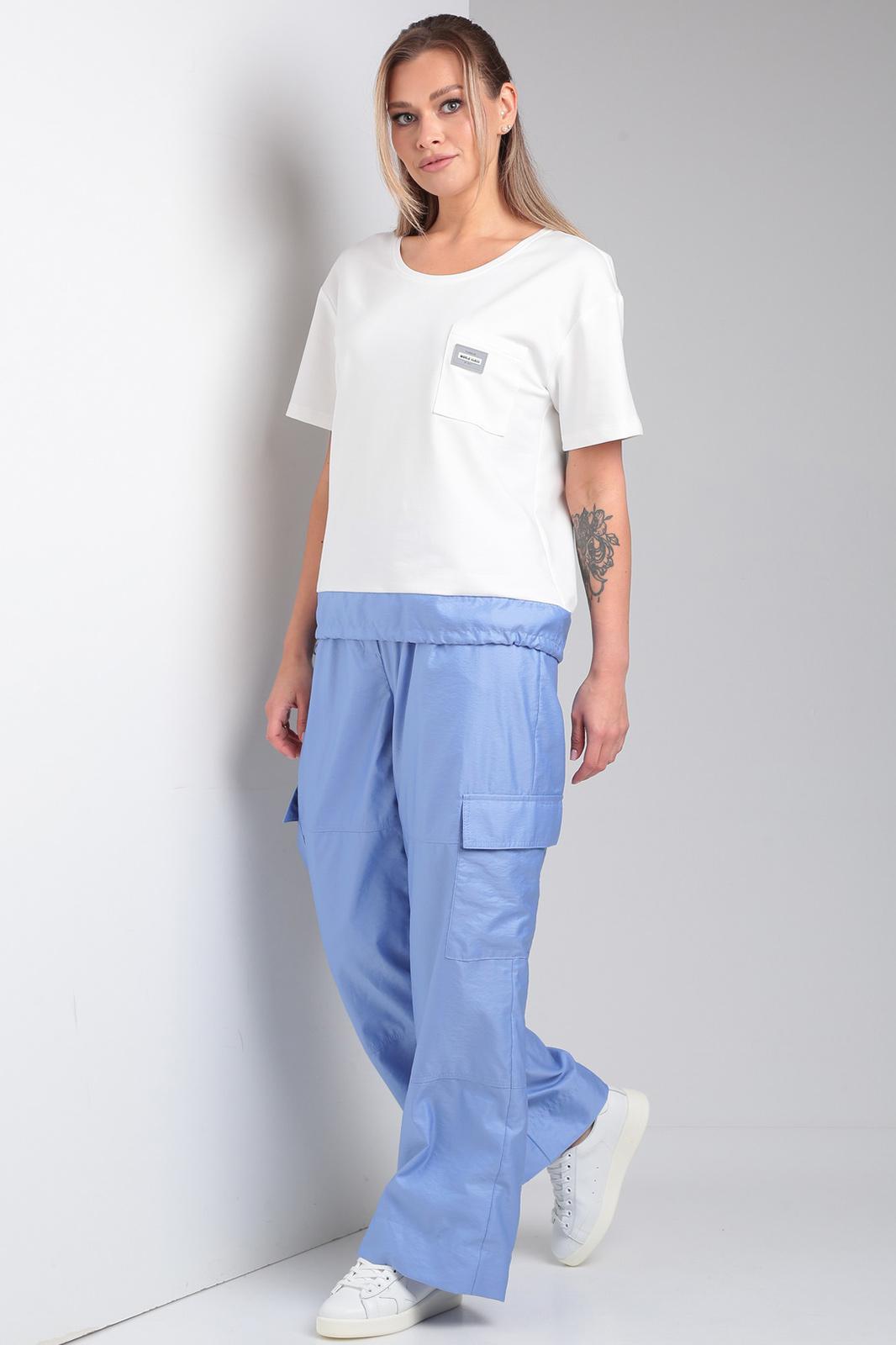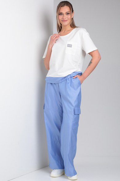 Комплект брючный(майка+брюки). Майка прямого силуэта. Линия плеча спущена, рукав втачной одношовный. Горловина обработана бейкой из отделочной ткани. По низу притачной манжет с кулисой (резинка с фиксатором). Накладной карман. P.S: фурнитура может отличаться от представленной на фото.Брюки пярмые с рельефными поперечными швами. В боковых швах прорезаны карманы. Накладные карманы с клапаном в боковых швах. Застежка на молнию. Верхний срез обработан поясом с резинкой по спинке. Брюки на подкладке. Используется две ткани.