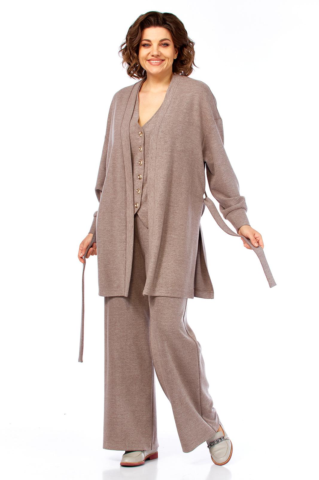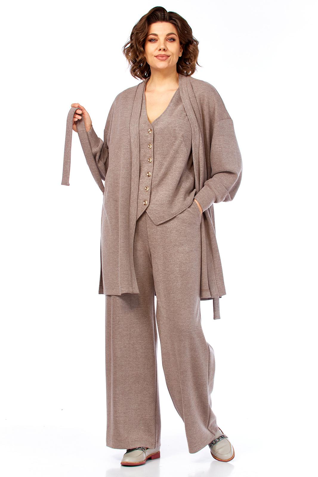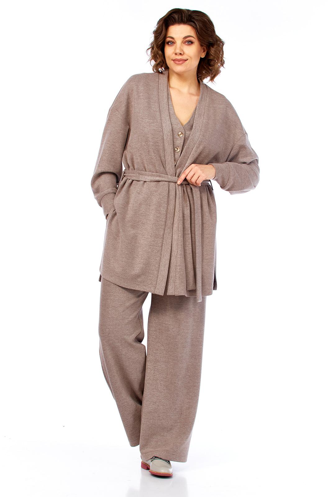 Комплект брючный состоит из брюк, жилетки и кардигана и выполнен из трикотажного полотна. Брюки прямые, широкие с боковыми карманами и поясом на резинке. Жилетка короткая с застежкоц на петли и пуговицы. Перед жилетки с косыми нагрудными вытачками. Жилетка на шелковой подкладке. Кардиган длиной до середины бедра без застежки, по бокам разрезы. Пояс съмный. Рукав втачной с притачными манжетами. Фурнитура может отличаться от заявленной на фото.