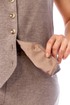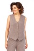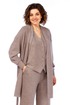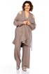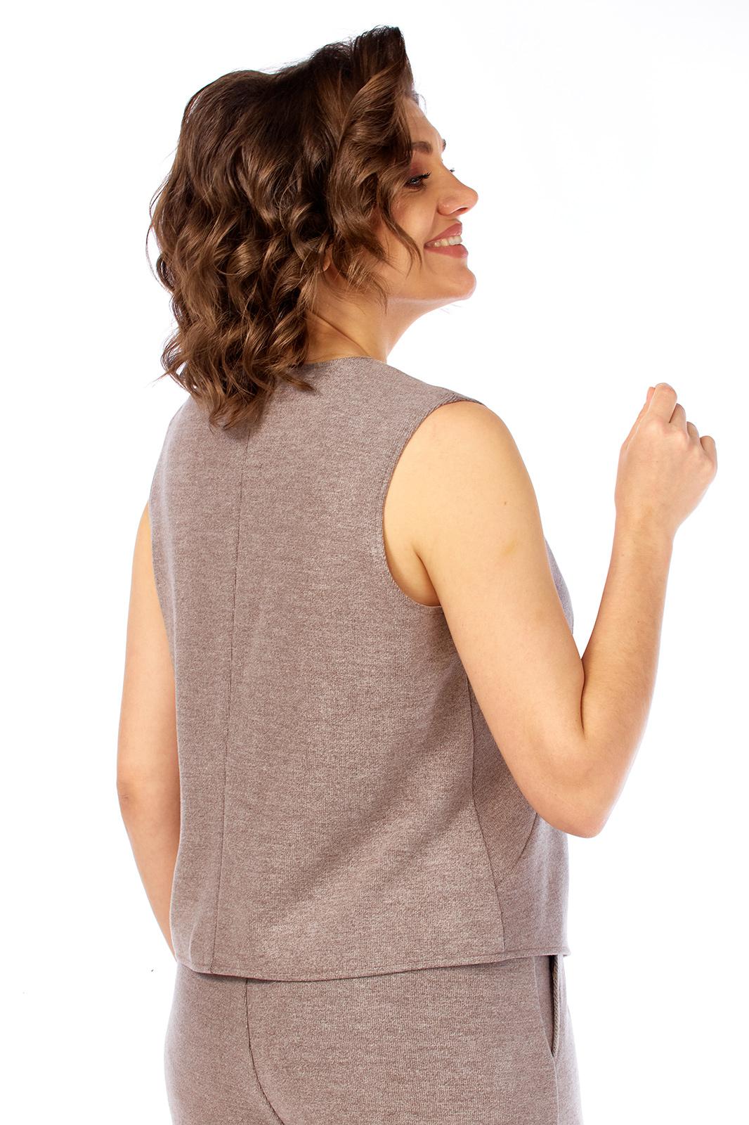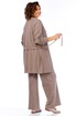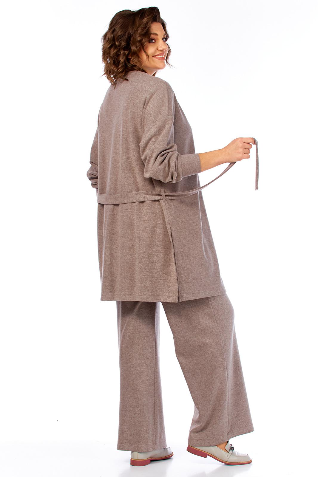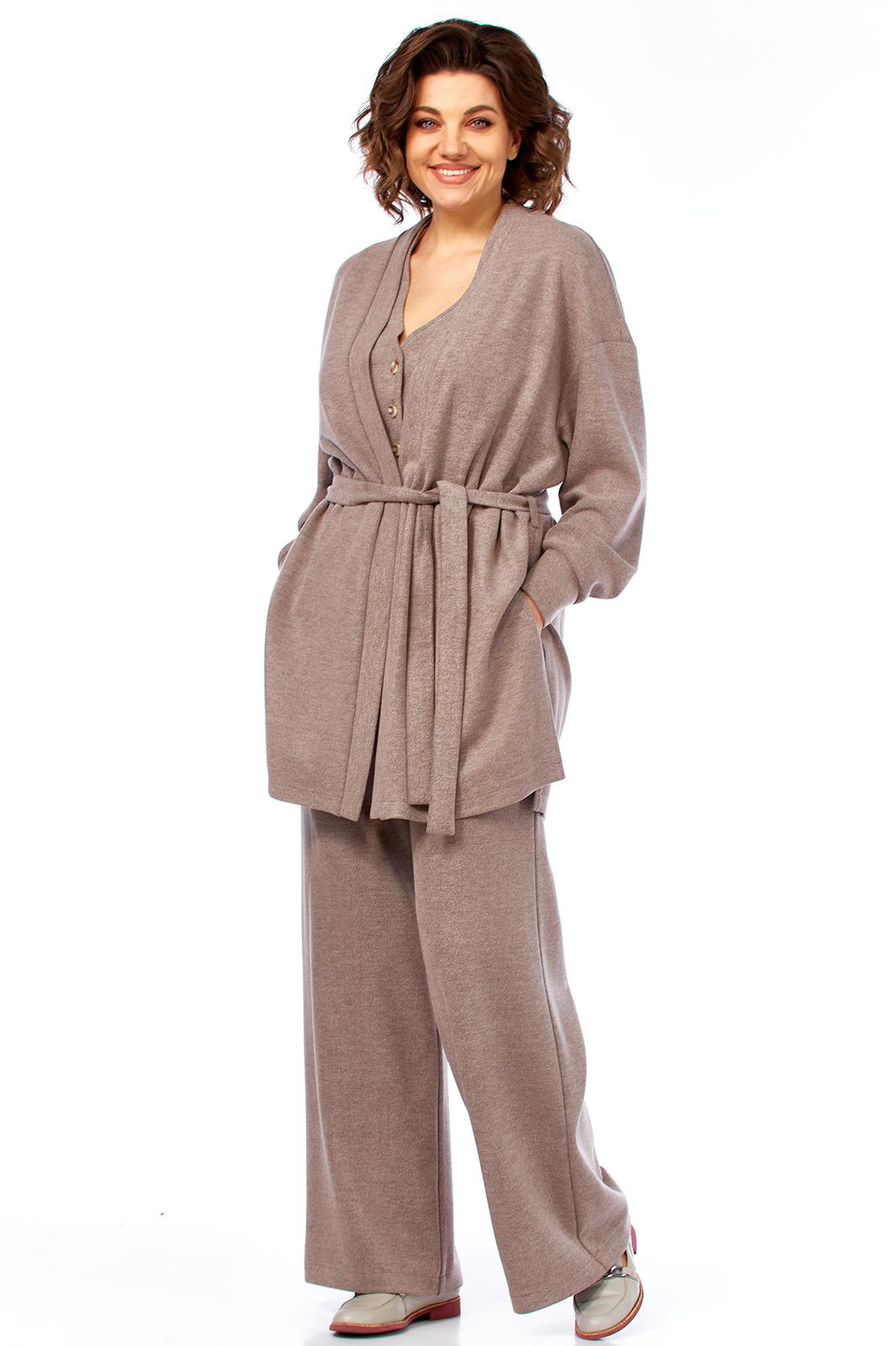 Комплект брючный состоит из брюк, жилетки и кардигана и выполнен из трикотажного полотна. Брюки прямые, широкие с боковыми карманами и поясом на резинке. Жилетка короткая с застежкоц на петли и пуговицы. Перед жилетки с косыми нагрудными вытачками. Жилетка на шелковой подкладке. Кардиган длиной до середины бедра без застежки, по бокам разрезы. Пояс съмный. Рукав втачной с притачными манжетами. Фурнитура может отличаться от заявленной на фото.