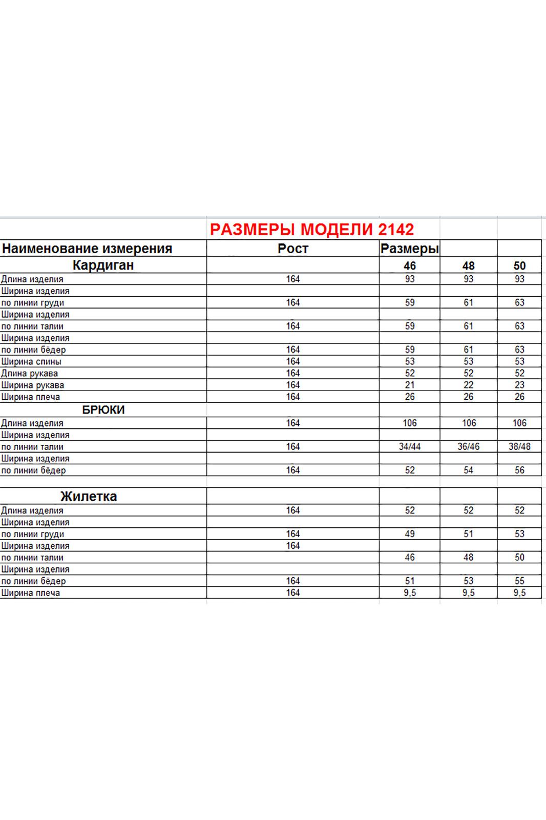 Длина кардигана по спинке 93 см, длина рукава 52 см. Длина брюк 106 см. Длина жилетки по спинке 52 см.