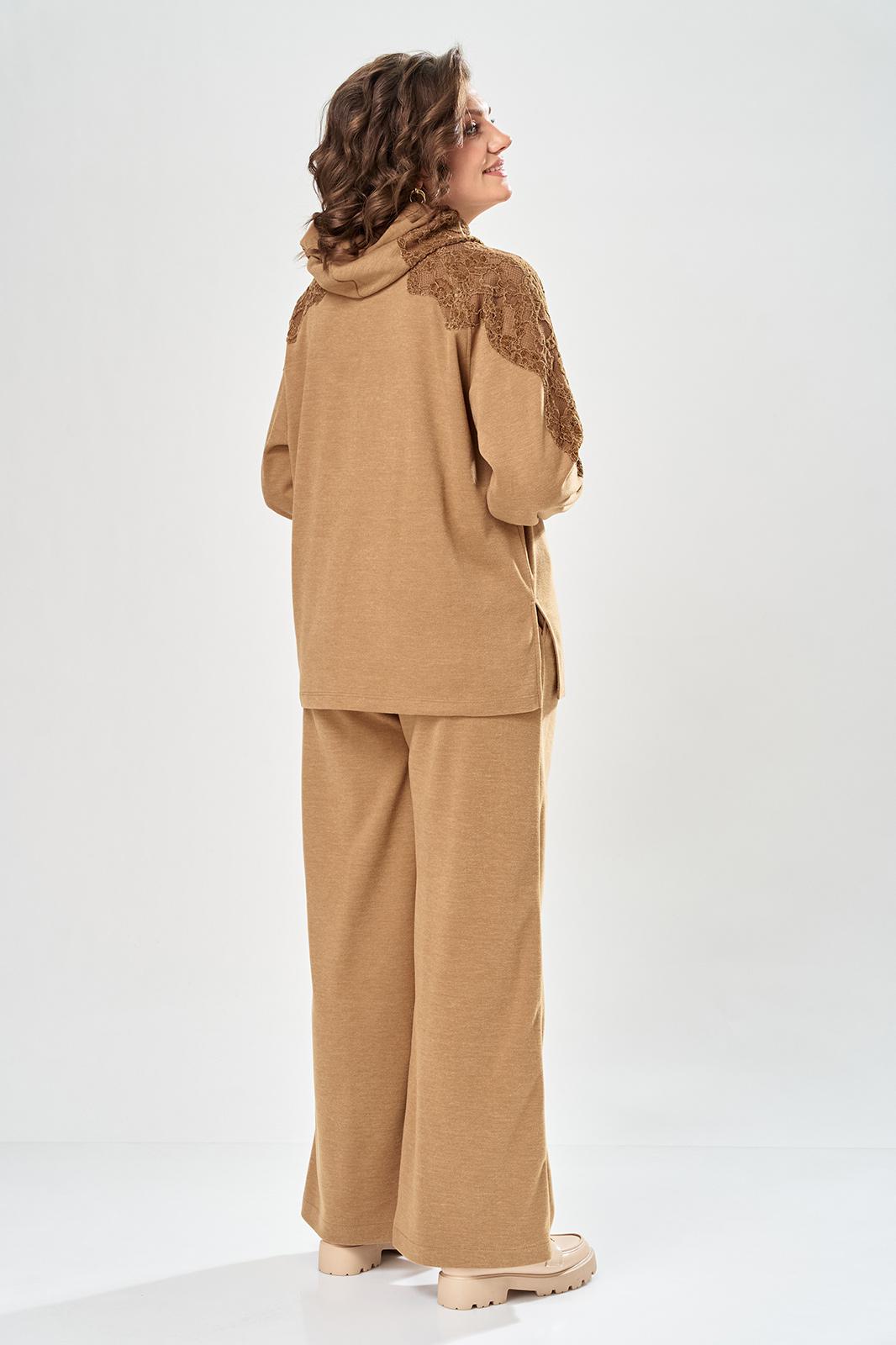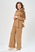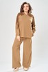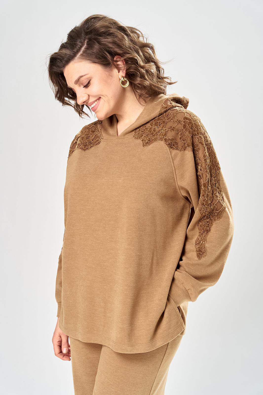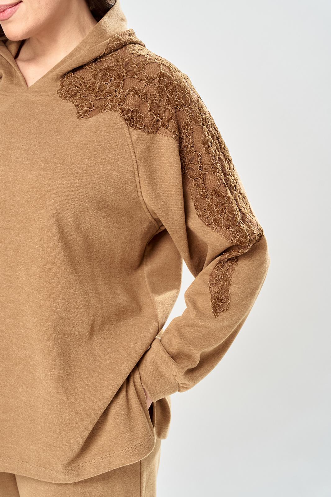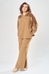 Комплект брючный состоит из кофты и брюк. Кофта свободного кроя покроя реглан. По низу рукава манжет. Капюшон с центральным швом. По боковым швам разрезы. В качестве отделки используется кружево по рукаву и капюшону. Брюки широкие, в боковых швах обработаны карманы. Верхний срез обработан поясом с резинкой. Длина кофты по спинке 65 см, длина рукава 70 см. Длина брюк 109 см.