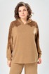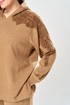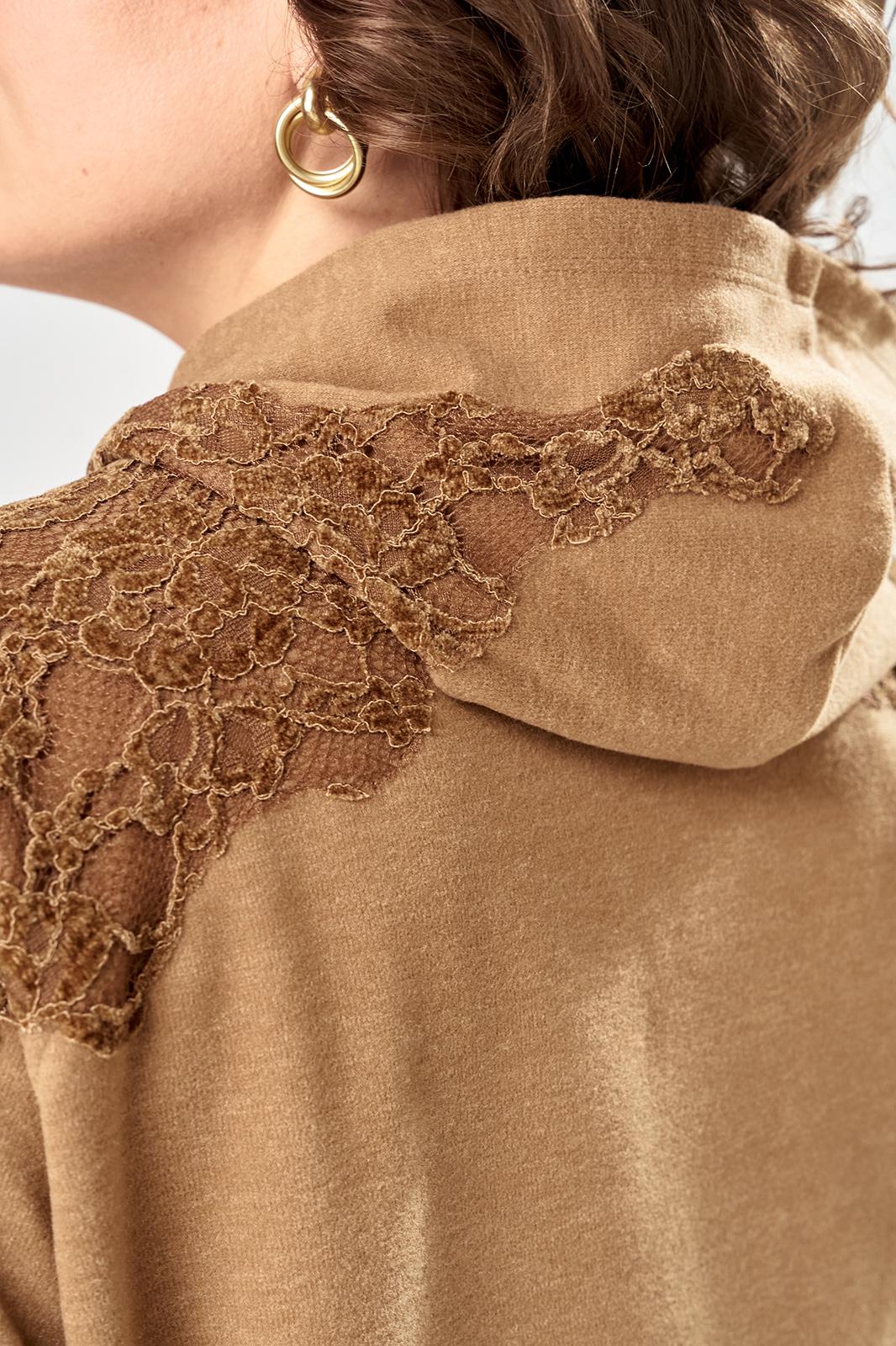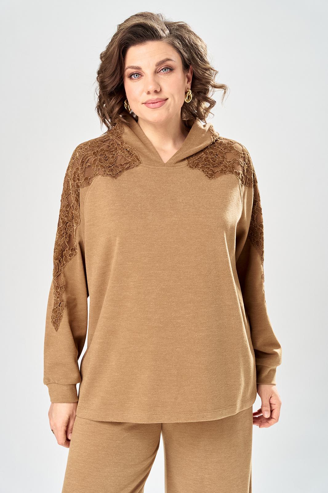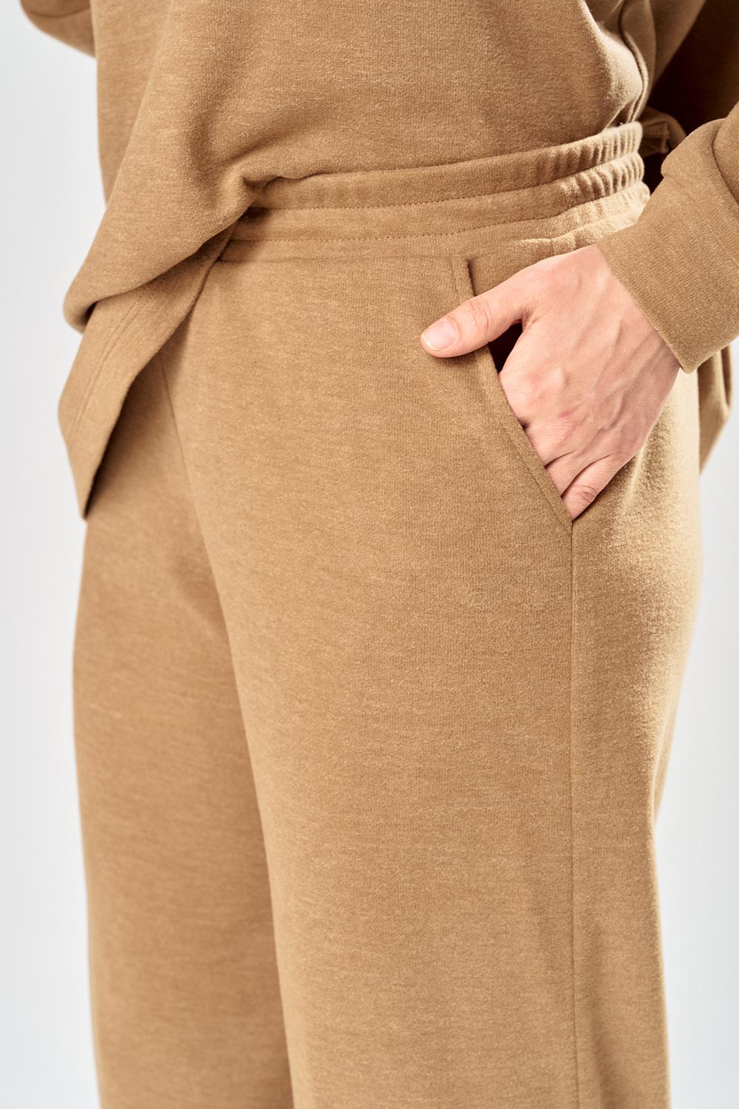 Комплект брючный состоит из кофты и брюк. Кофта свободного кроя покроя реглан. По низу рукава манжет. Капюшон с центральным швом. По боковым швам разрезы. В качестве отделки используется кружево по рукаву и капюшону. Брюки широкие, в боковых швах обработаны карманы. Верхний срез обработан поясом с резинкой. Длина кофты по спинке 65 см, длина рукава 70 см. Длина брюк 109 см.