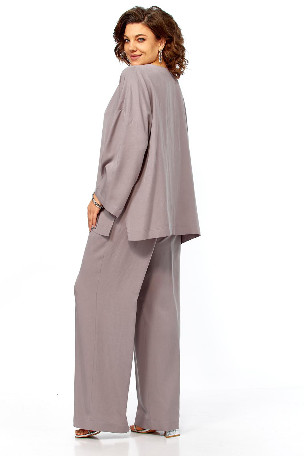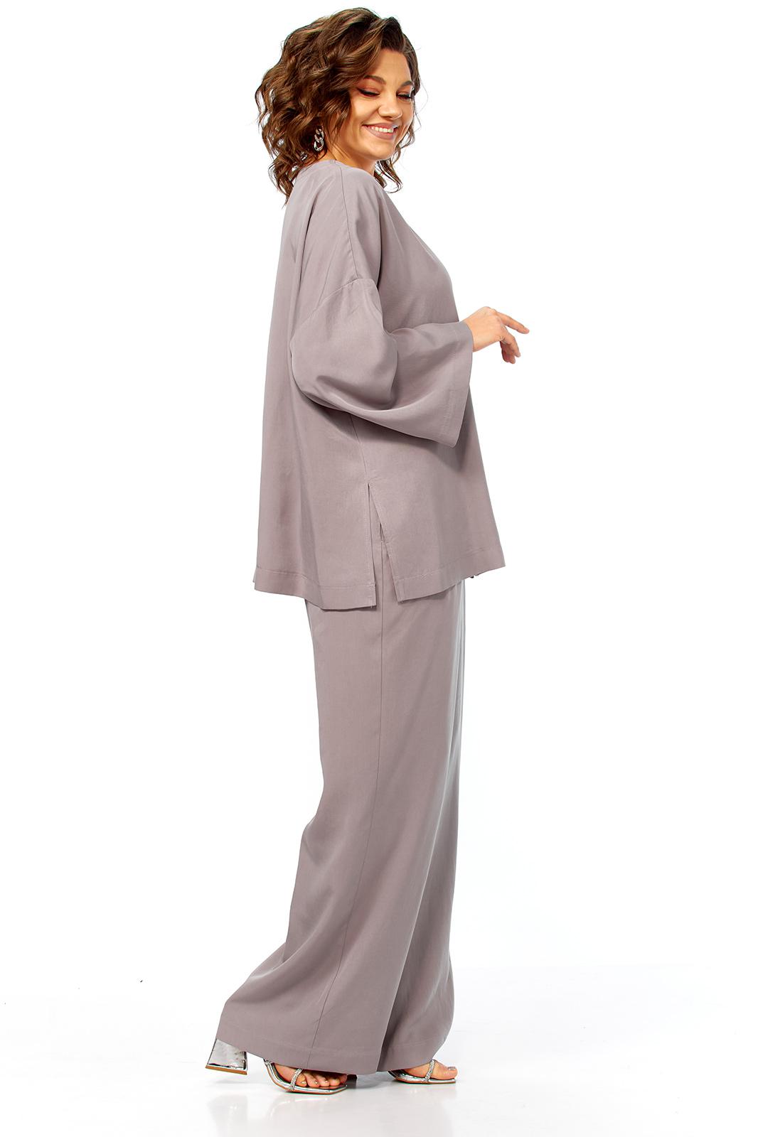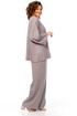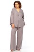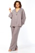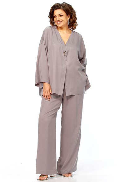 Комплект брючный свободного кроя состоит из кардигана и брюк. Брюки свободного кроя прямые с карманами в боковых швах и поясом на резинке. Кардиган с центральной застежкой на 2 потайные кнопки. Перед с V-образной горловиной, украшен брошью. Рукав втачной одношовный со спущенной линией плеча. По боковым швам разрезы. По бортам широкая отделочная полочка. Фурнитура может отличаться от заявленной на фото.