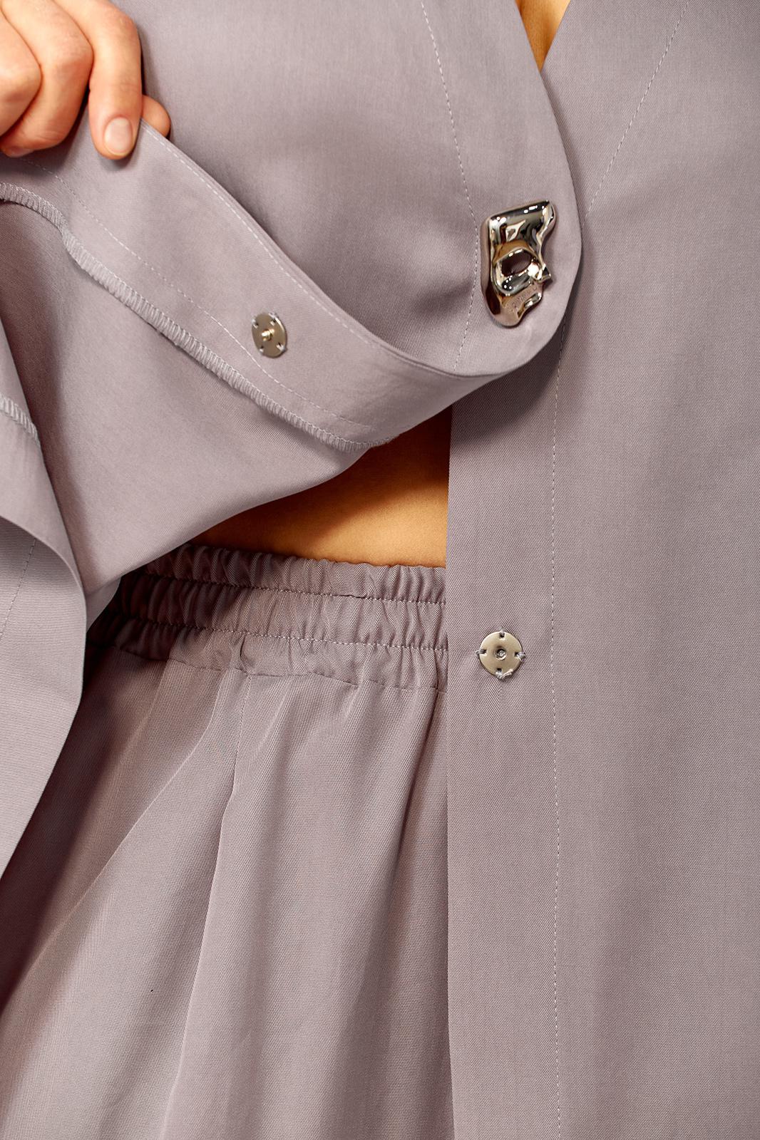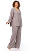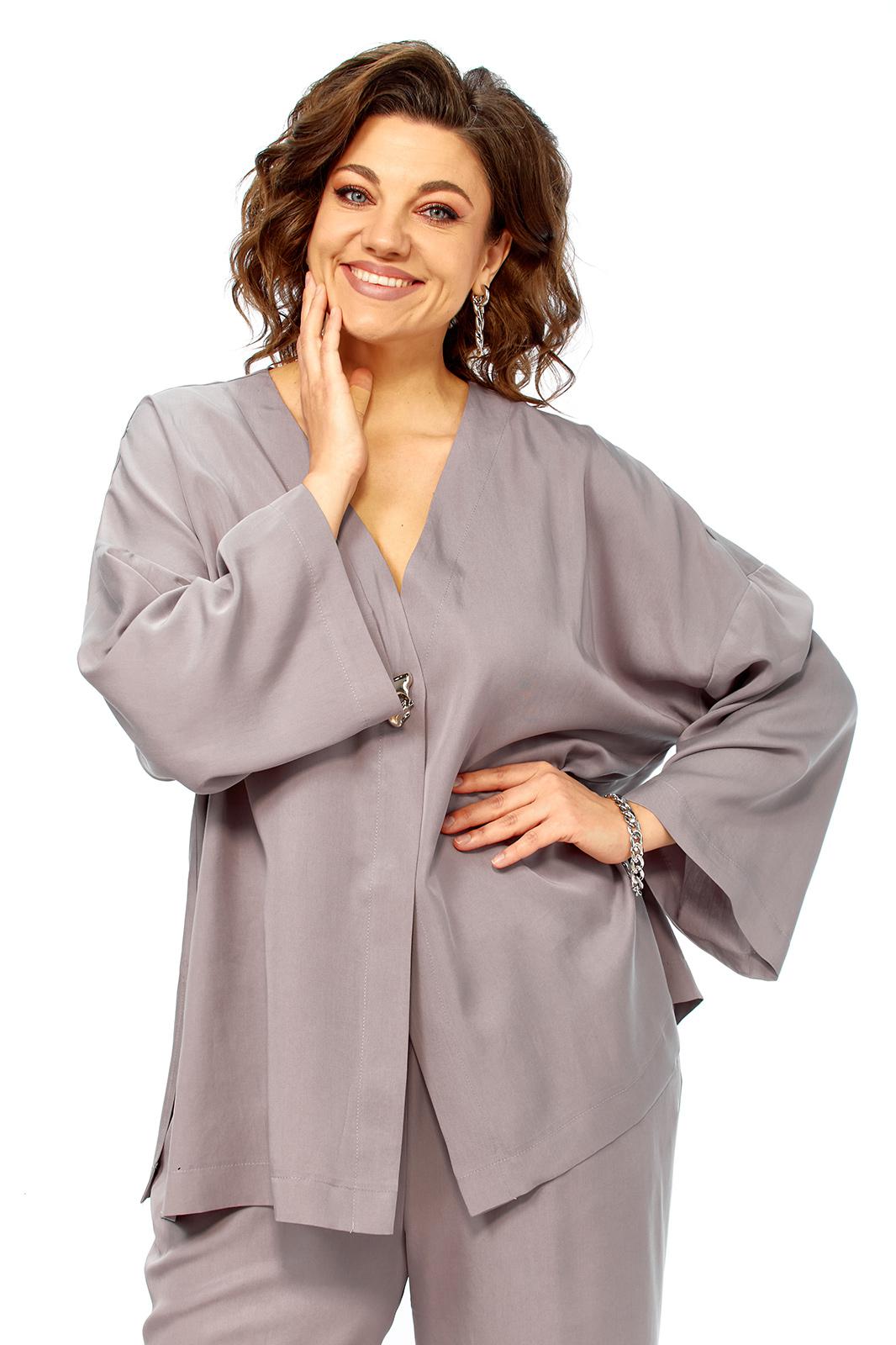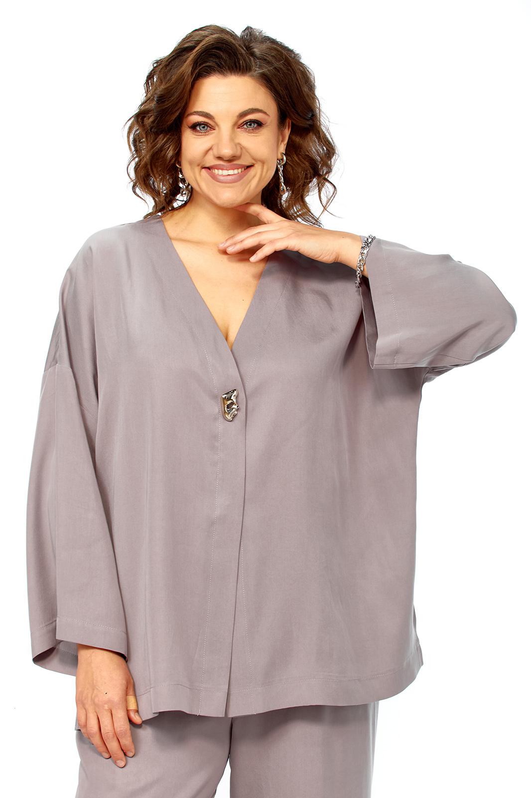 Комплект брючный свободного кроя состоит из кардигана и брюк. Брюки свободного кроя прямые с карманами в боковых швах и поясом на резинке. Кардиган с центральной застежкой на 2 потайные кнопки. Перед с V-образной горловиной, украшен брошью. Рукав втачной одношовный со спущенной линией плеча. По боковым швам разрезы. По бортам широкая отделочная полочка. Фурнитура может отличаться от заявленной на фото.