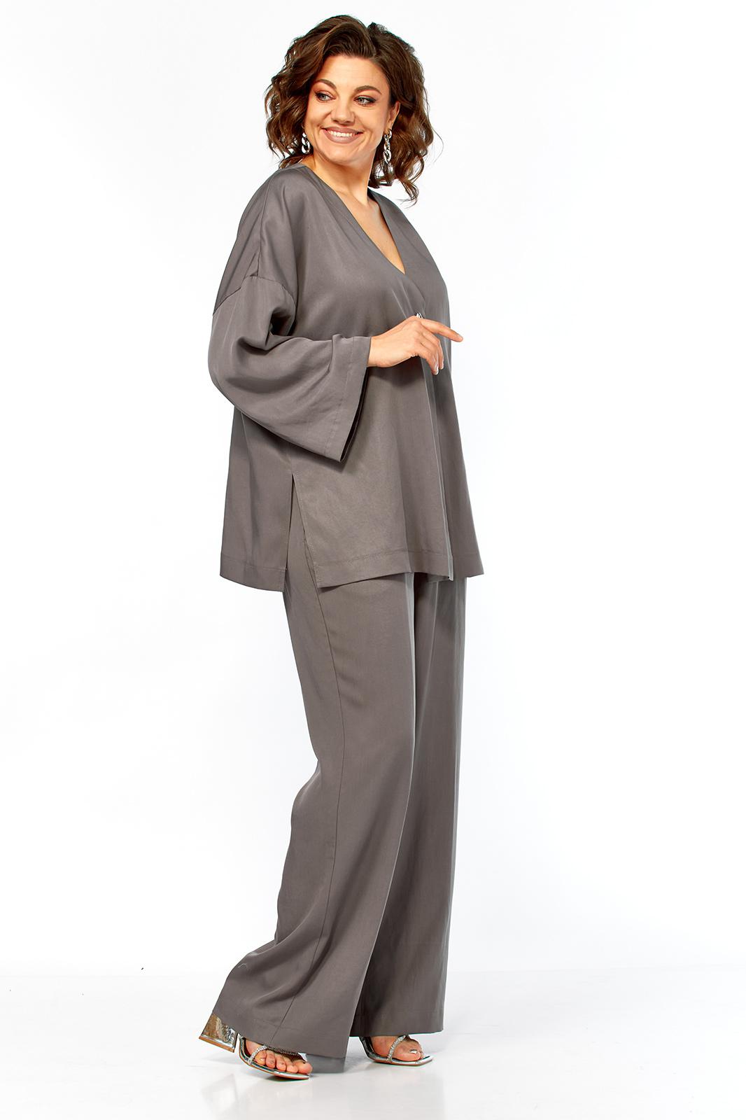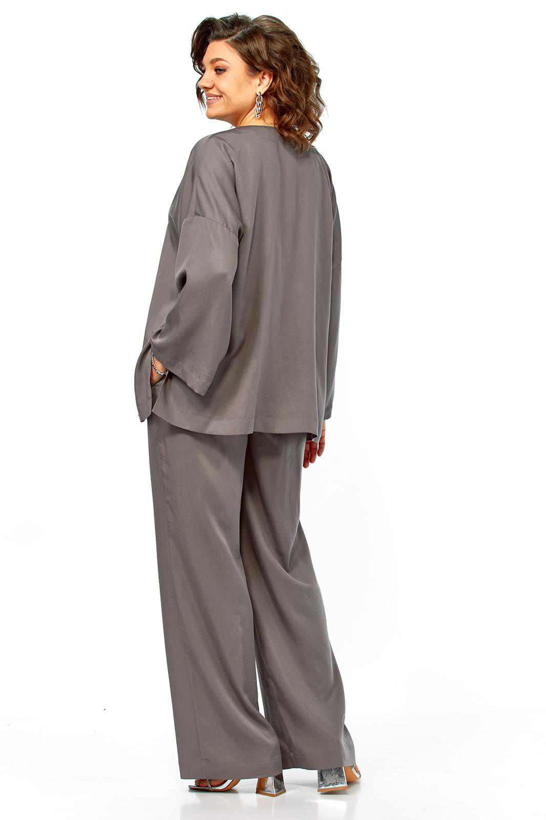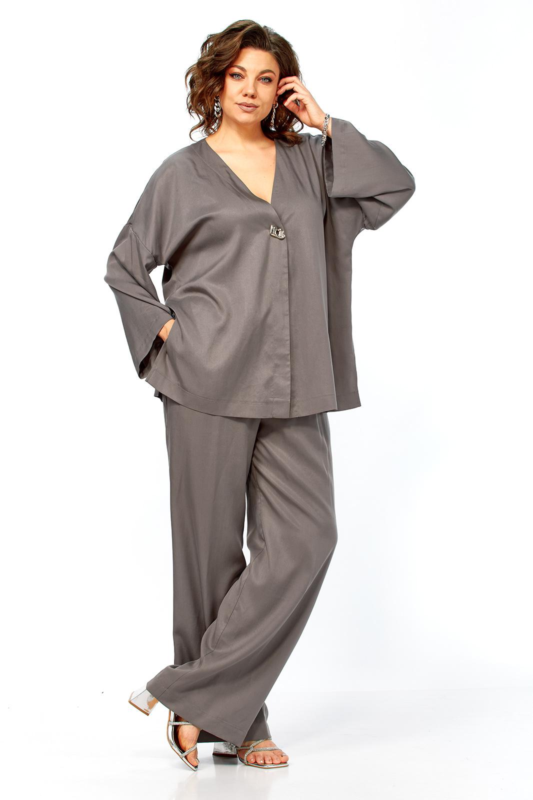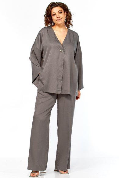 Комплект брючный свободного кроя состоит из кардигана и брюк. Брюки свободного кроя прямые с карманами в боковых швах и поясом на резинке. Кардиган с центральной застежкой на 2 потайные кнопки. Перед с V-образной горловиной, украшен брошью. Рукав втачной одношовный со спущенной линией плеча. По боковым швам разрезы. По бортам широкая отделочная полочка. Фурнитура может отличаться от заявленной на фото.