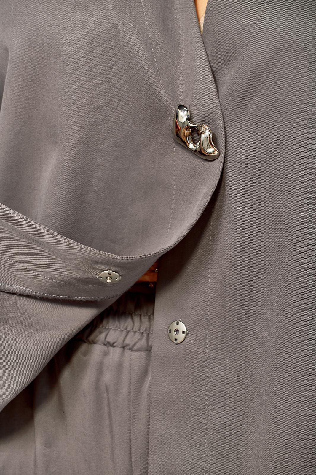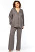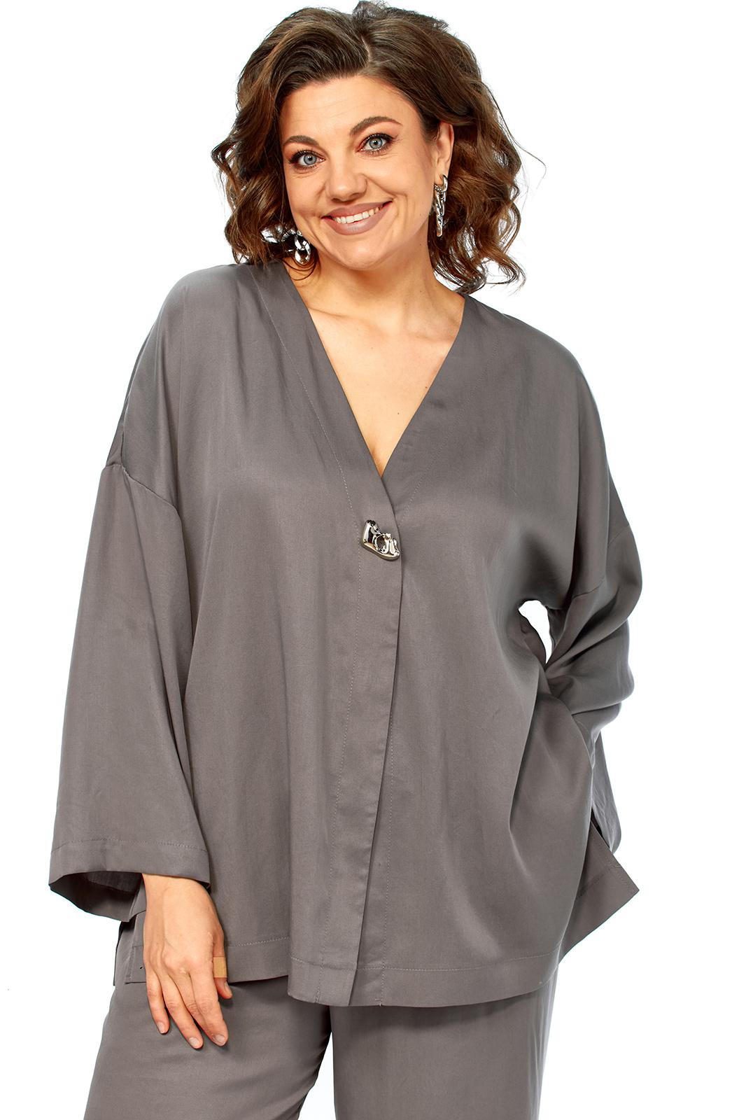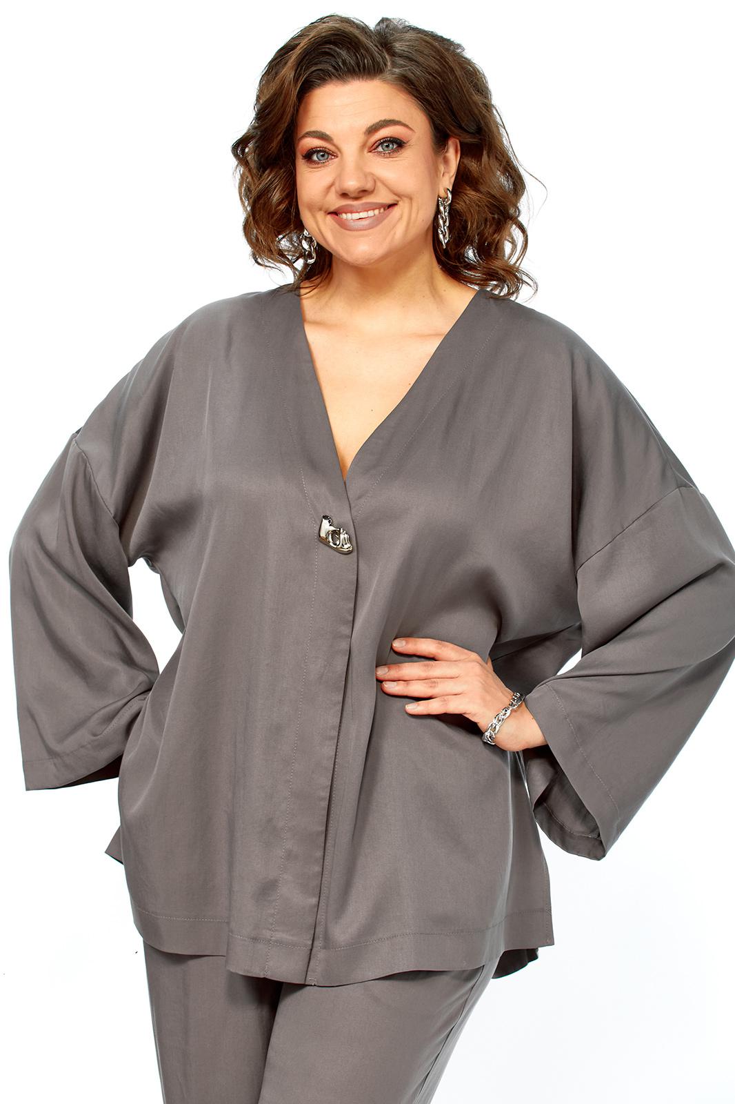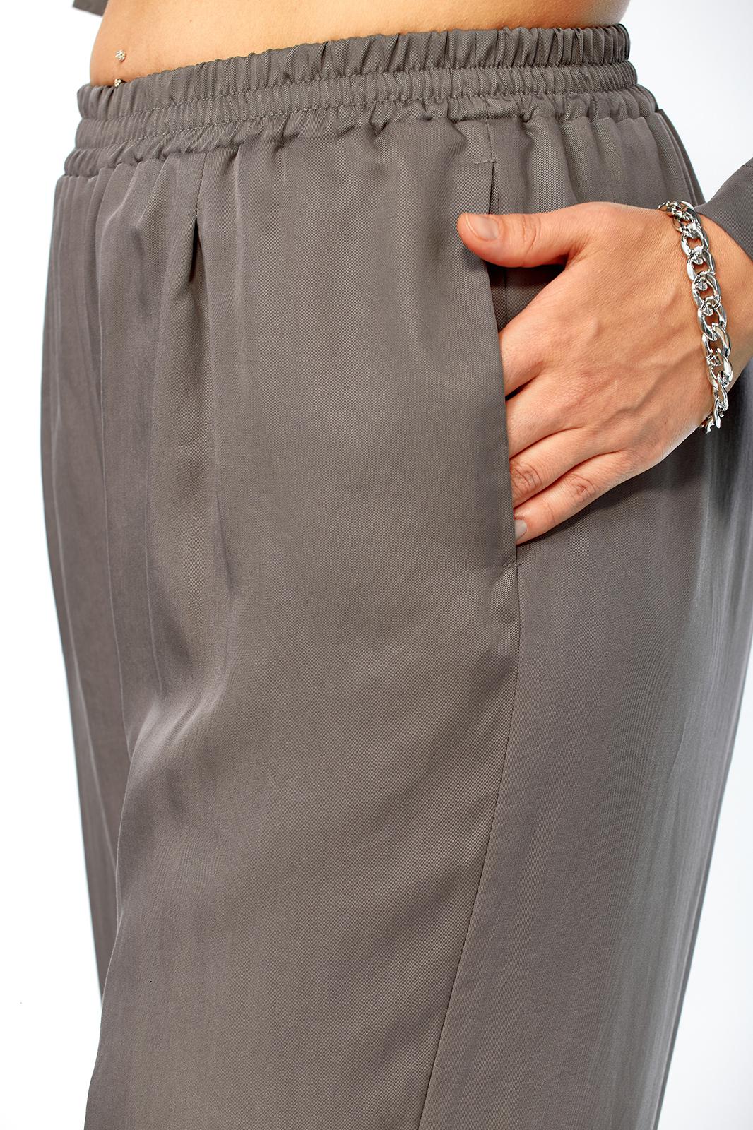Комплект брючный свободного кроя состоит из кардигана и брюк. Брюки свободного кроя прямые с карманами в боковых швах и поясом на резинке. Кардиган с центральной застежкой на 2 потайные кнопки. Перед с V-образной горловиной, украшен брошью. Рукав втачной одношовный со спущенной линией плеча. По боковым швам разрезы. По бортам широкая отделочная полочка. Фурнитура может отличаться от заявленной на фото.