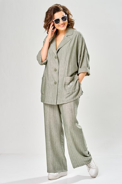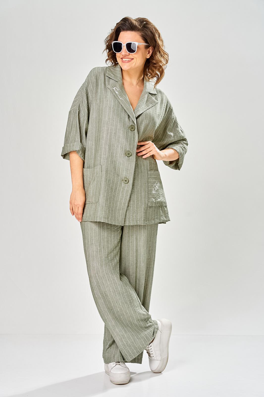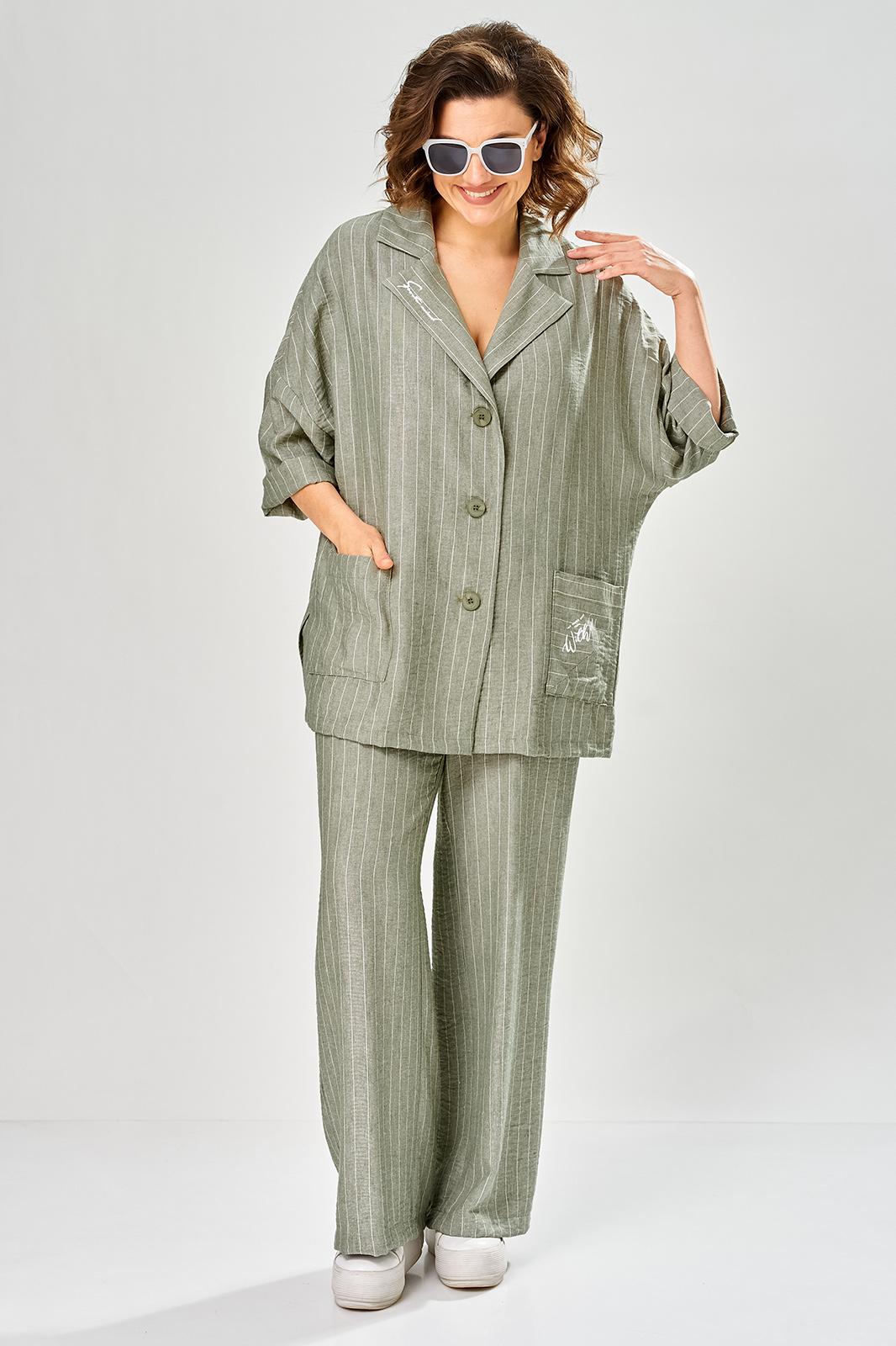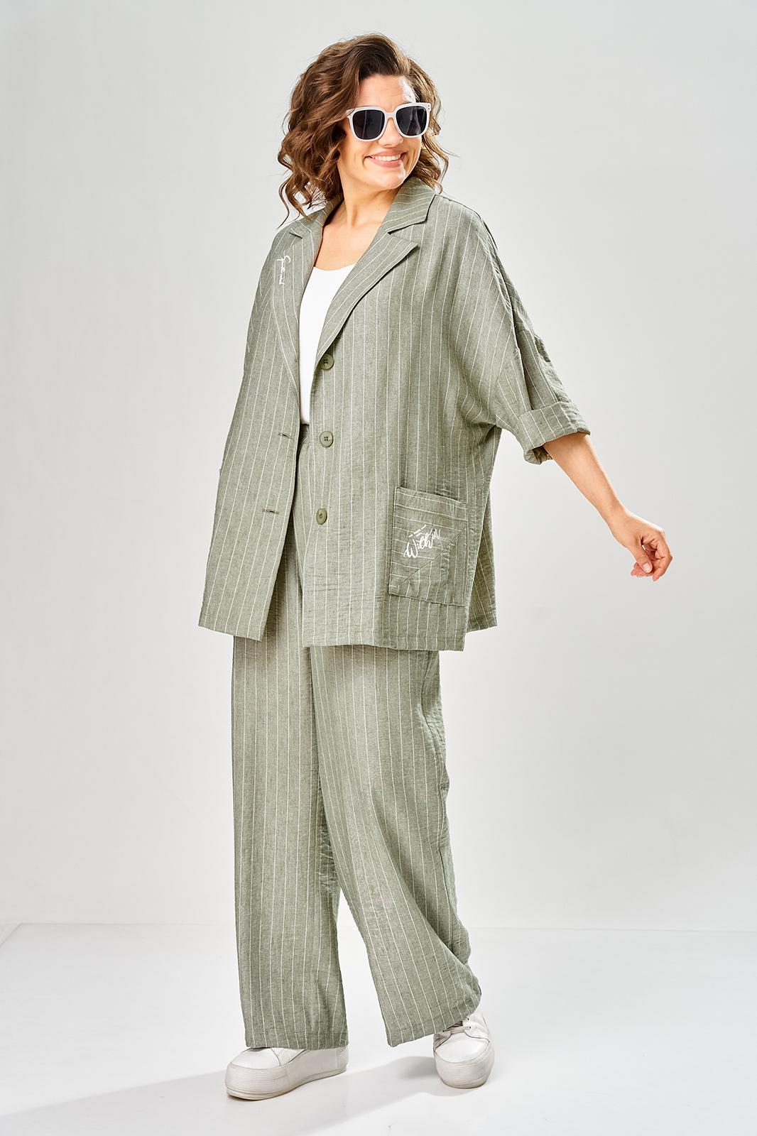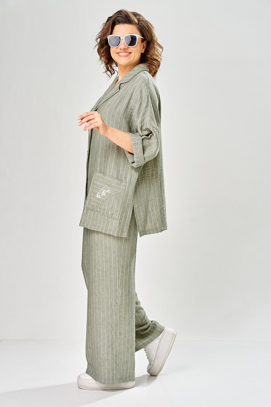 Комплект женский состоит из брюк и жакета. Брюки прямые, свободного кроя с карманам в боковых швах и поясом на резинке. Жакет прямого кроя с центральной застежкой на 3 петли и пуговицы. Перед с боковыми накладными карманами, левый карман украшен печатью. Воротник отложной с лацканами, правый лацкан украшен печатью. Рукав втачной со спущенной линией плеча. В боковых швах обработаны разрезы.