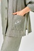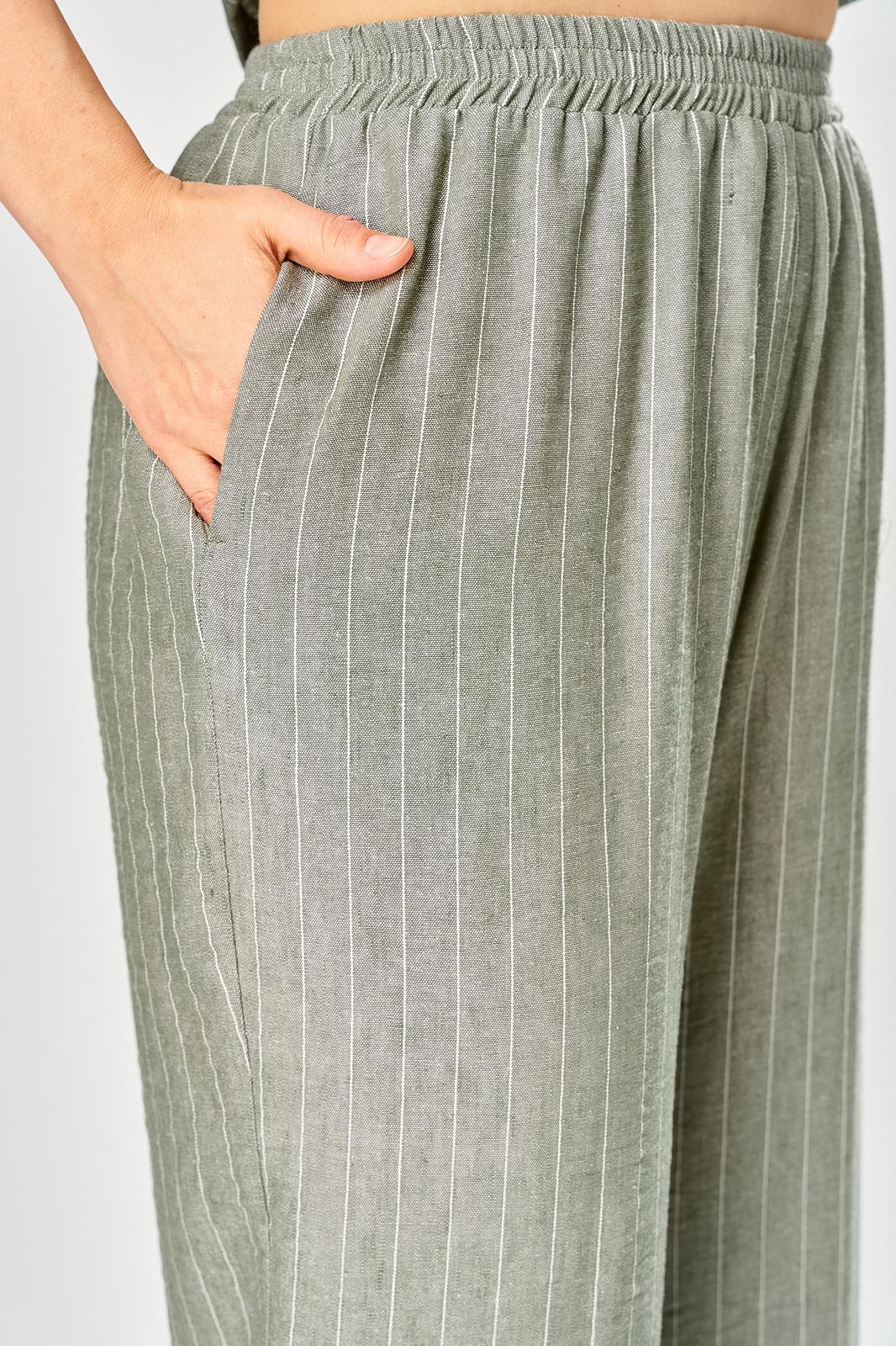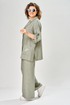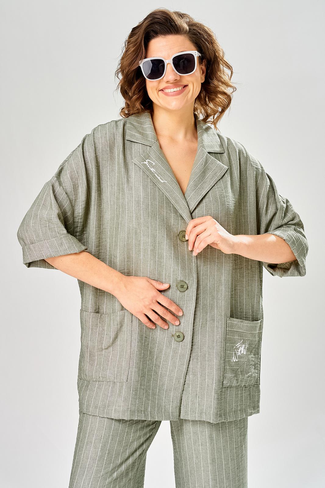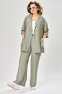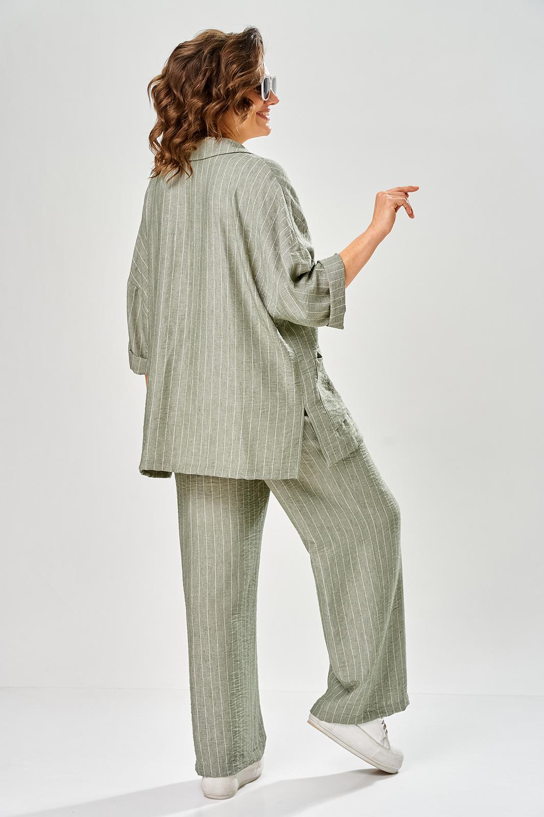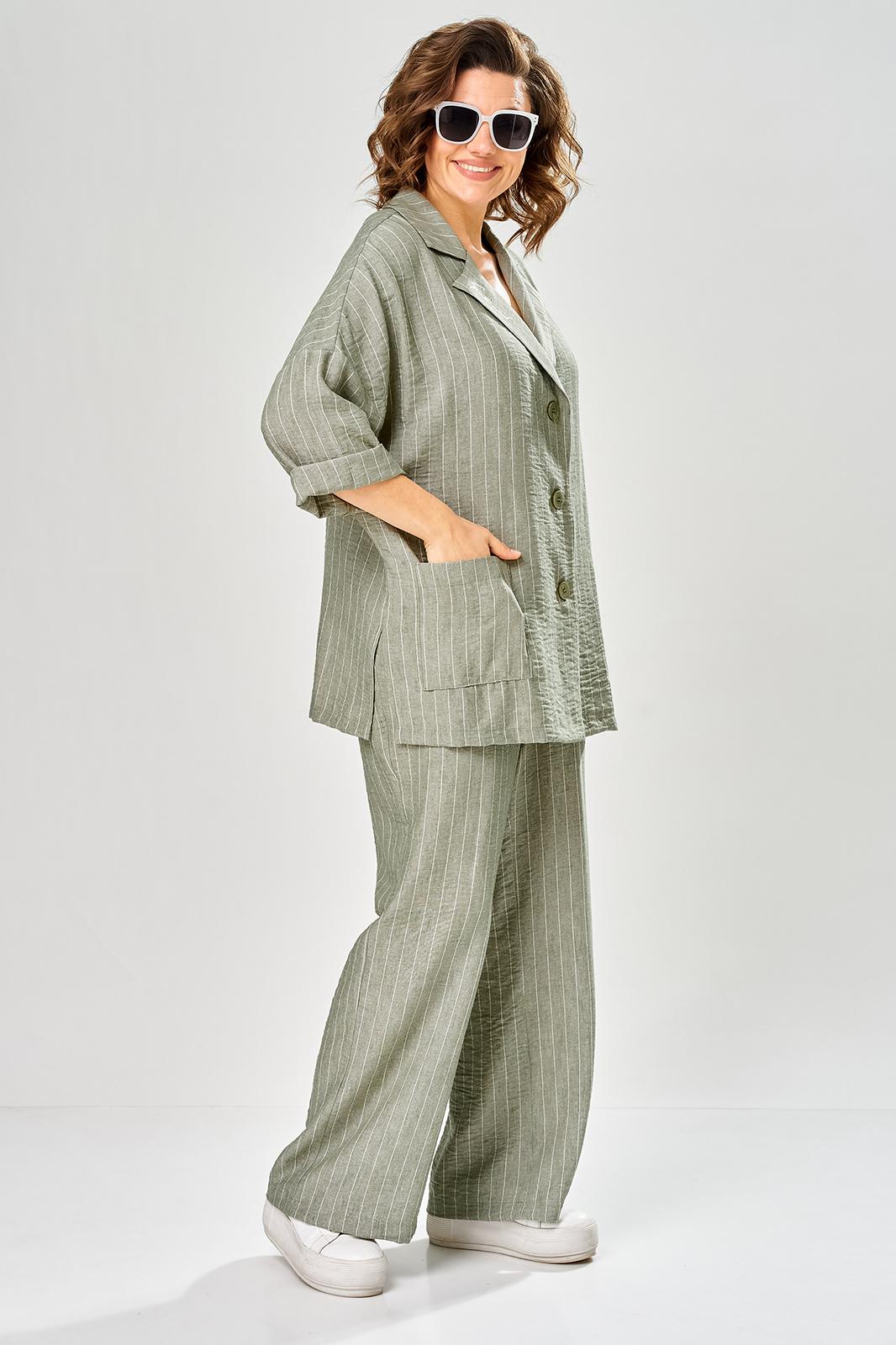 Комплект женский состоит из брюк и жакета. Брюки прямые, свободного кроя с карманам в боковых швах и поясом на резинке. Жакет прямого кроя с центральной застежкой на 3 петли и пуговицы. Перед с боковыми накладными карманами, левый карман украшен печатью. Воротник отложной с лацканами, правый лацкан украшен печатью. Рукав втачной со спущенной линией плеча. В боковых швах обработаны разрезы.