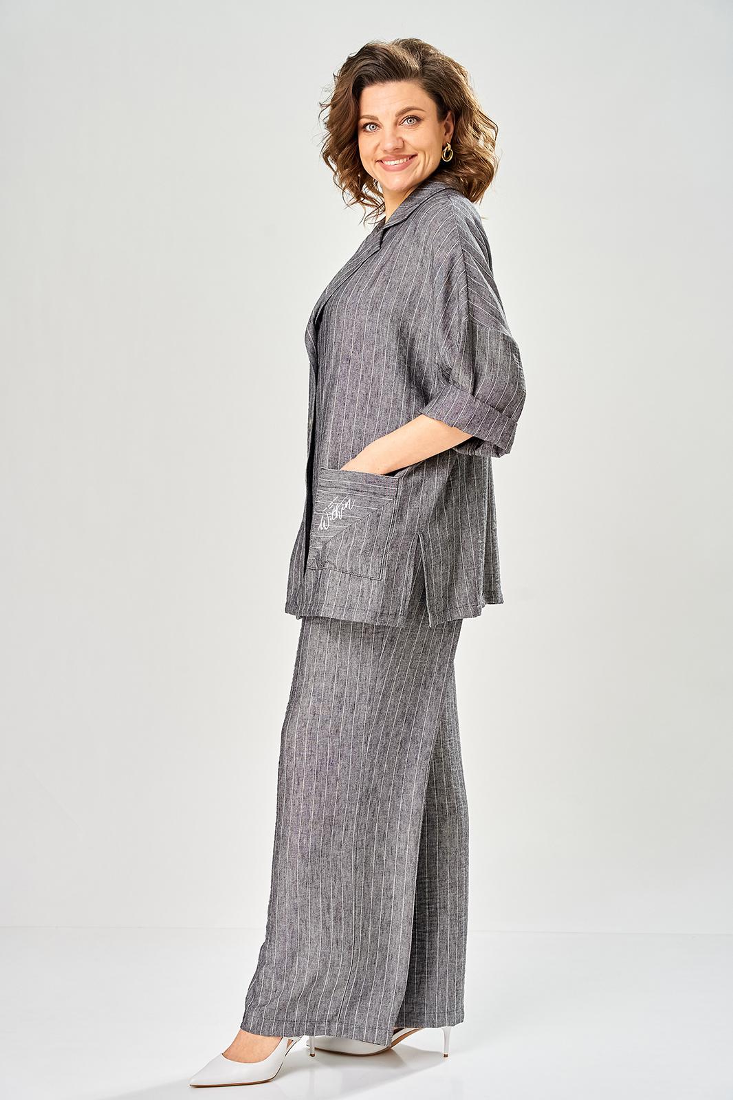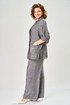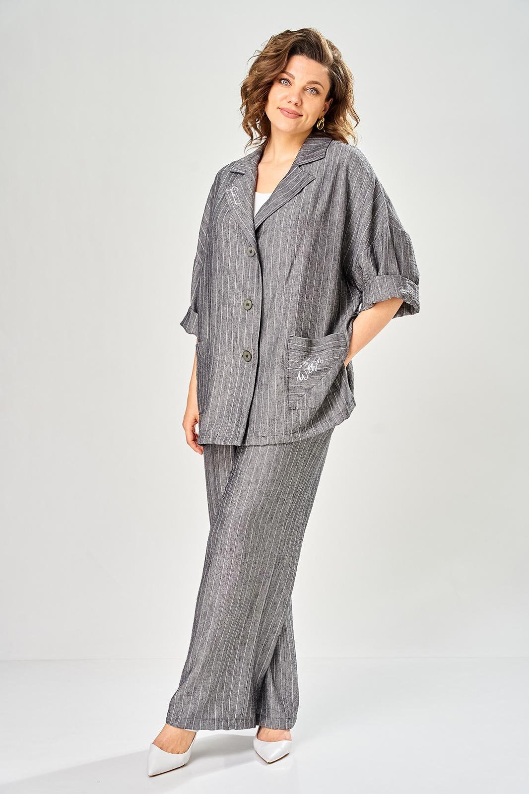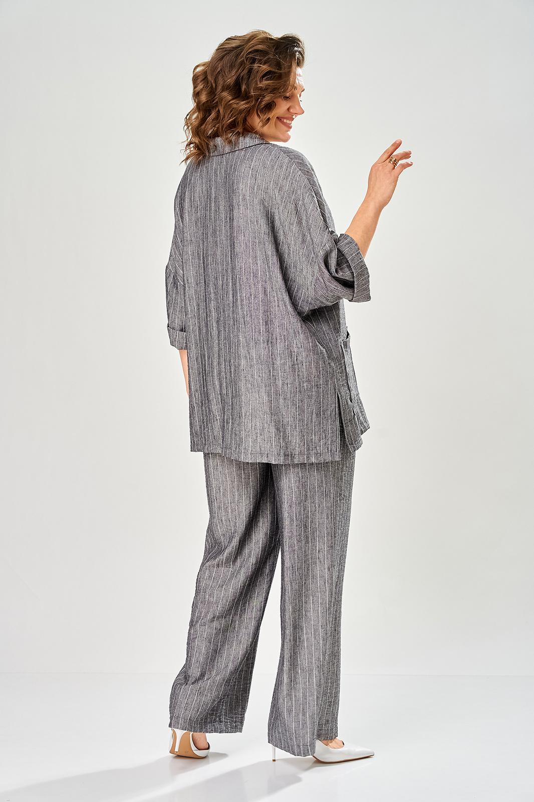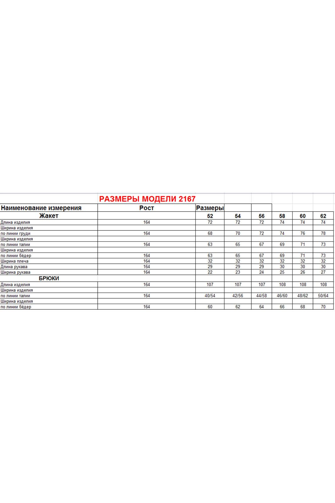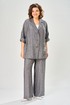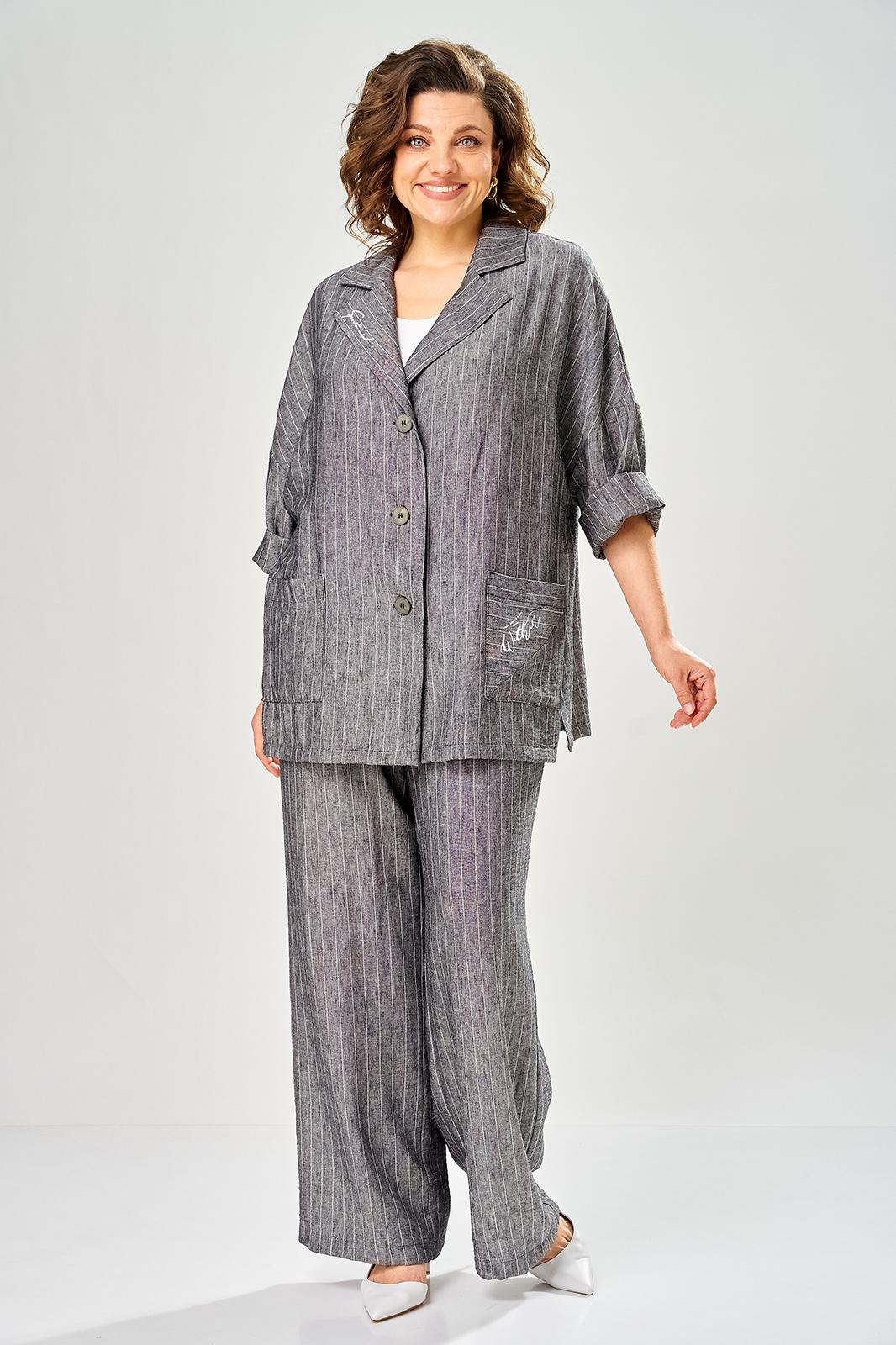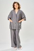 Комплект женский состоит из брюк и жакета. Брюки прямые, свободного кроя с карманам в боковых швах и поясом на резинке. Жакет прямого кроя с центральной застежкой на 3 петли и пуговицы. Перед с боковыми накладными карманами, левый карман украшен печатью. Воротник отложной с лацканами, правый лацкан украшен печатью. Рукав втачной со спущенной линией плеча. В боковых швах обработаны разрезы.