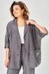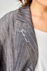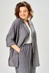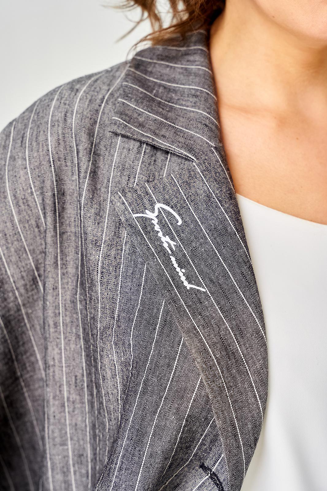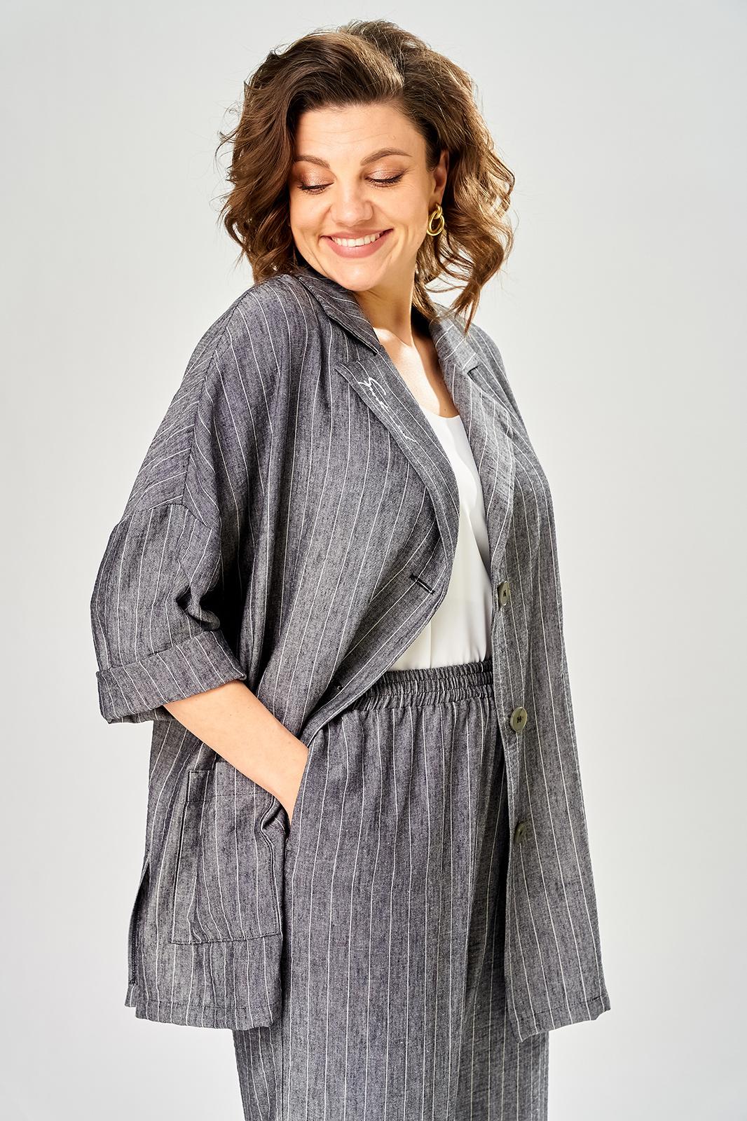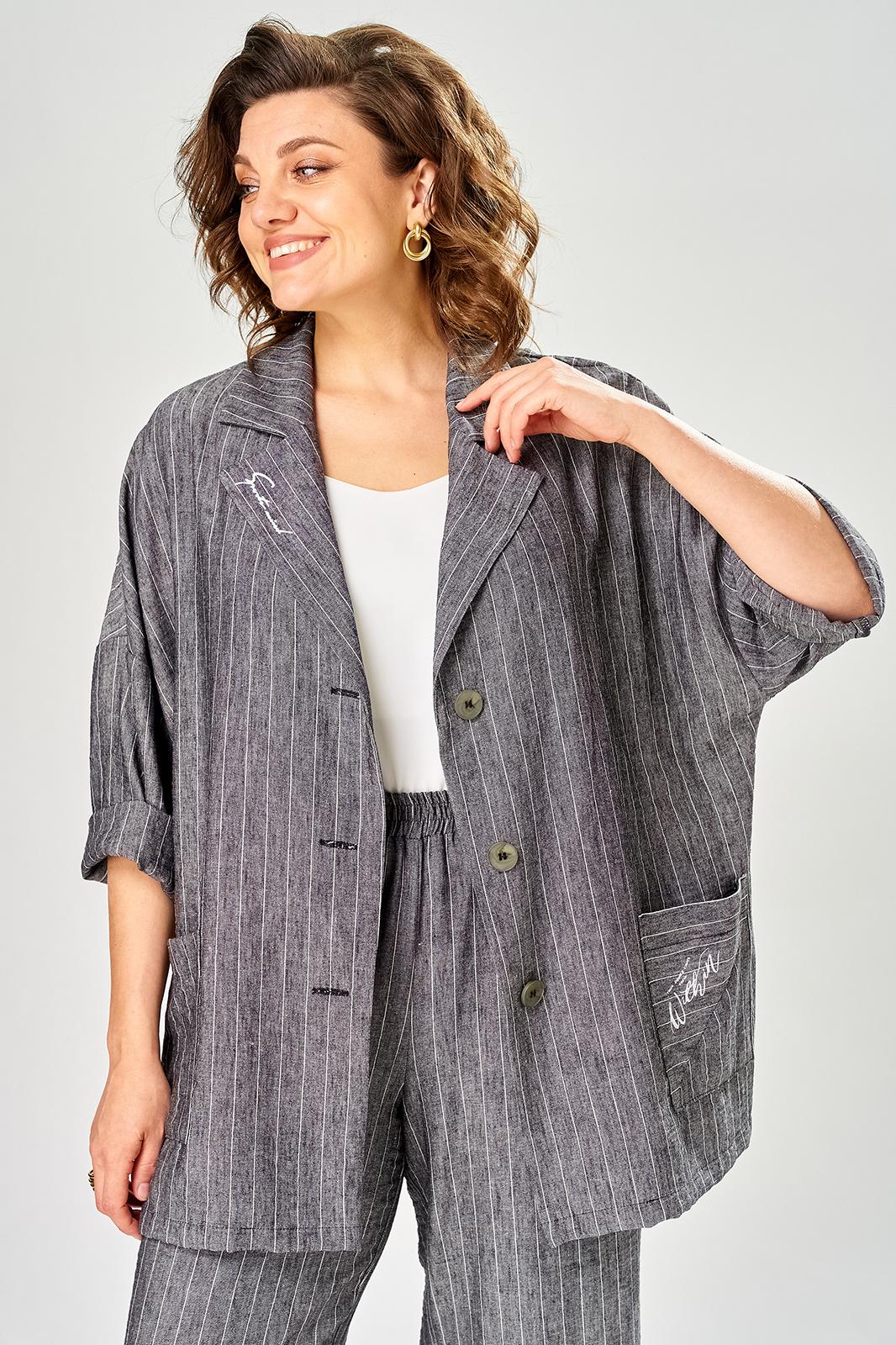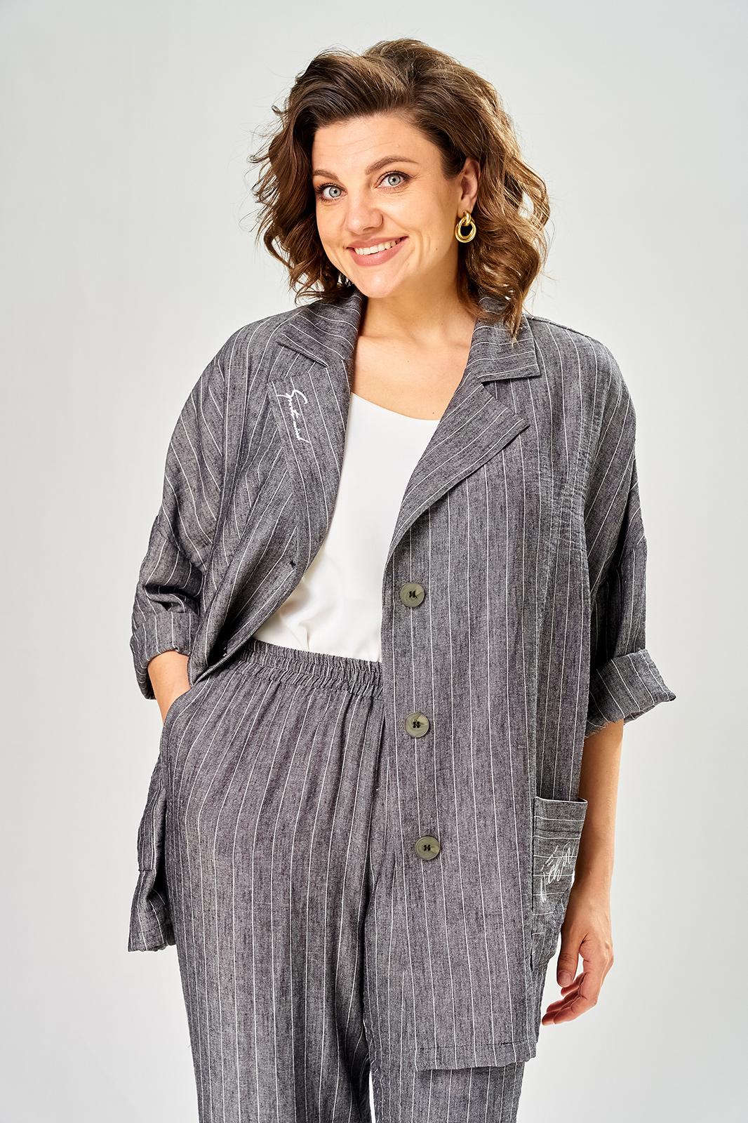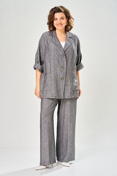Комплект женский состоит из брюк и жакета. Брюки прямые, свободного кроя с карманам в боковых швах и поясом на резинке. Жакет прямого кроя с центральной застежкой на 3 петли и пуговицы. Перед с боковыми накладными карманами, левый карман украшен печатью. Воротник отложной с лацканами, правый лацкан украшен печатью. Рукав втачной со спущенной линией плеча. В боковых швах обработаны разрезы.