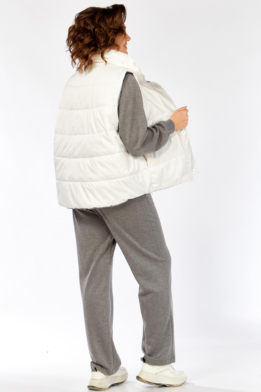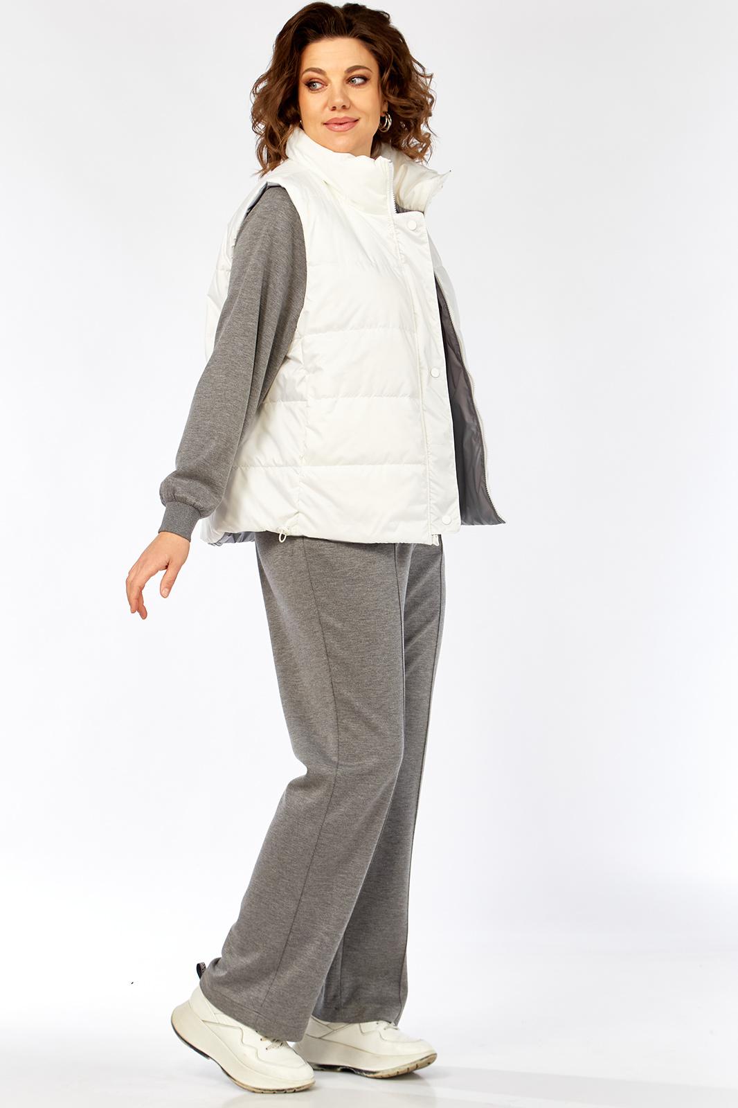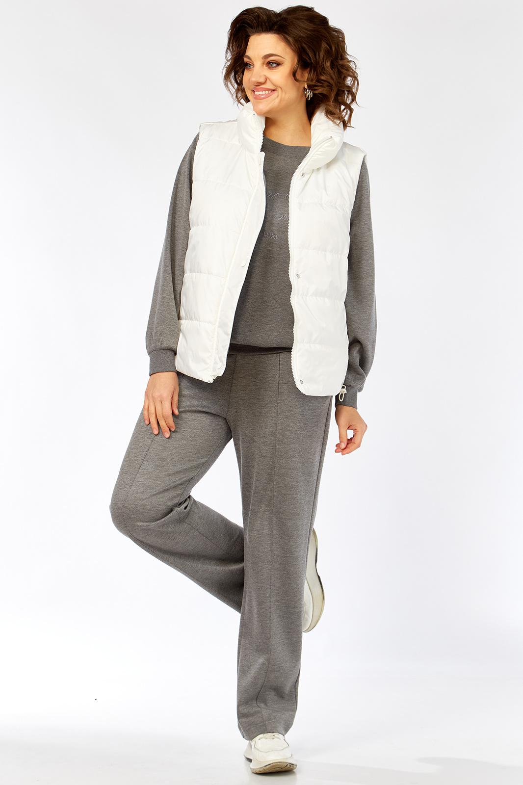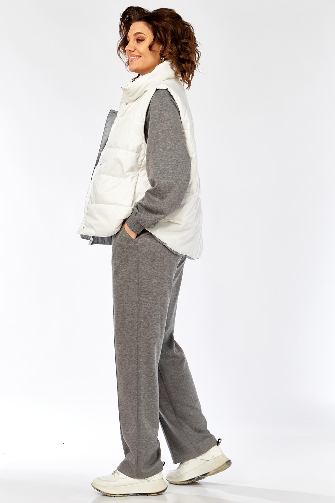 Комплект брючный( кофта+брюки+жилетка). Кофта прямого силуэта с притачным манжетом из отделочной ткани. Рукав покроя реглан с притачным манжетом по низу. В качестве отделки используется вышивка на центральной части переда. Брюки прямые. Верхний срез обработан поясом с резинкой. В боковых швах обработаны карманы. На передних половинках застрочены стрелки. Жилетка женская прямого силуэта с центральной застежкой на тесьму-молнию и отделочную планку на кнопки. Боковой шов смещенный на перед, в шве обработаны карманы. Воротник-стойка со складками по линии горловины. Жилетка двухсторонняя. Температурный режим до +5 градусов.