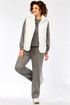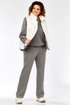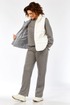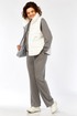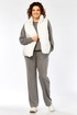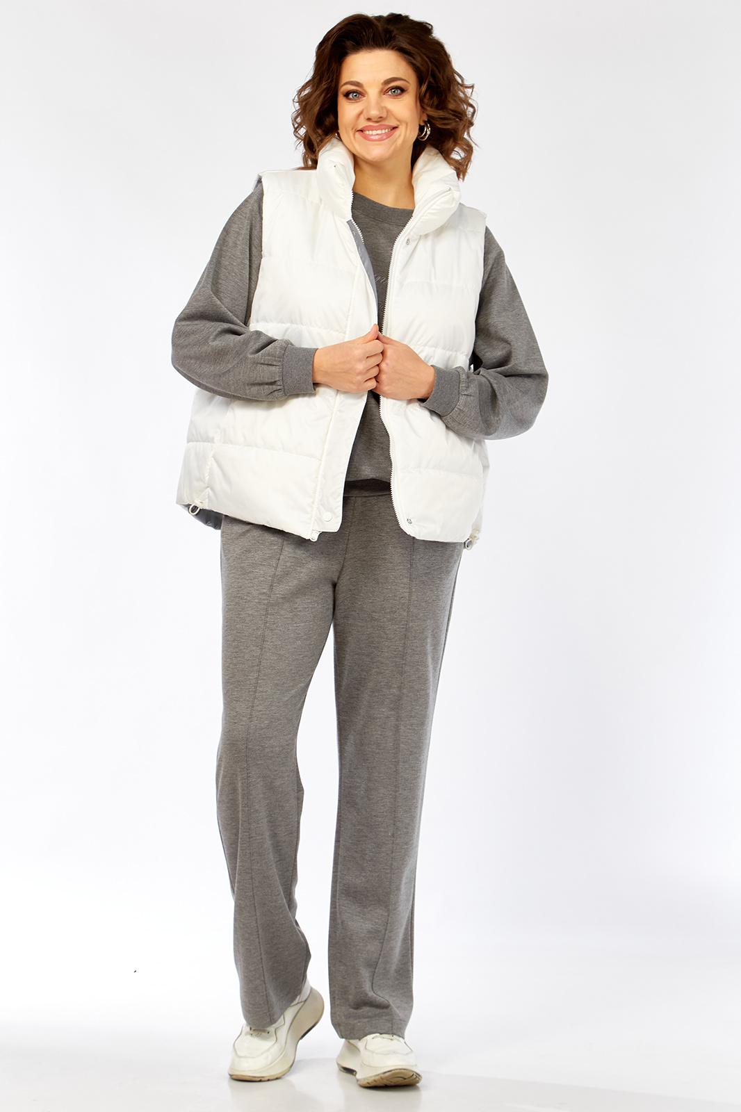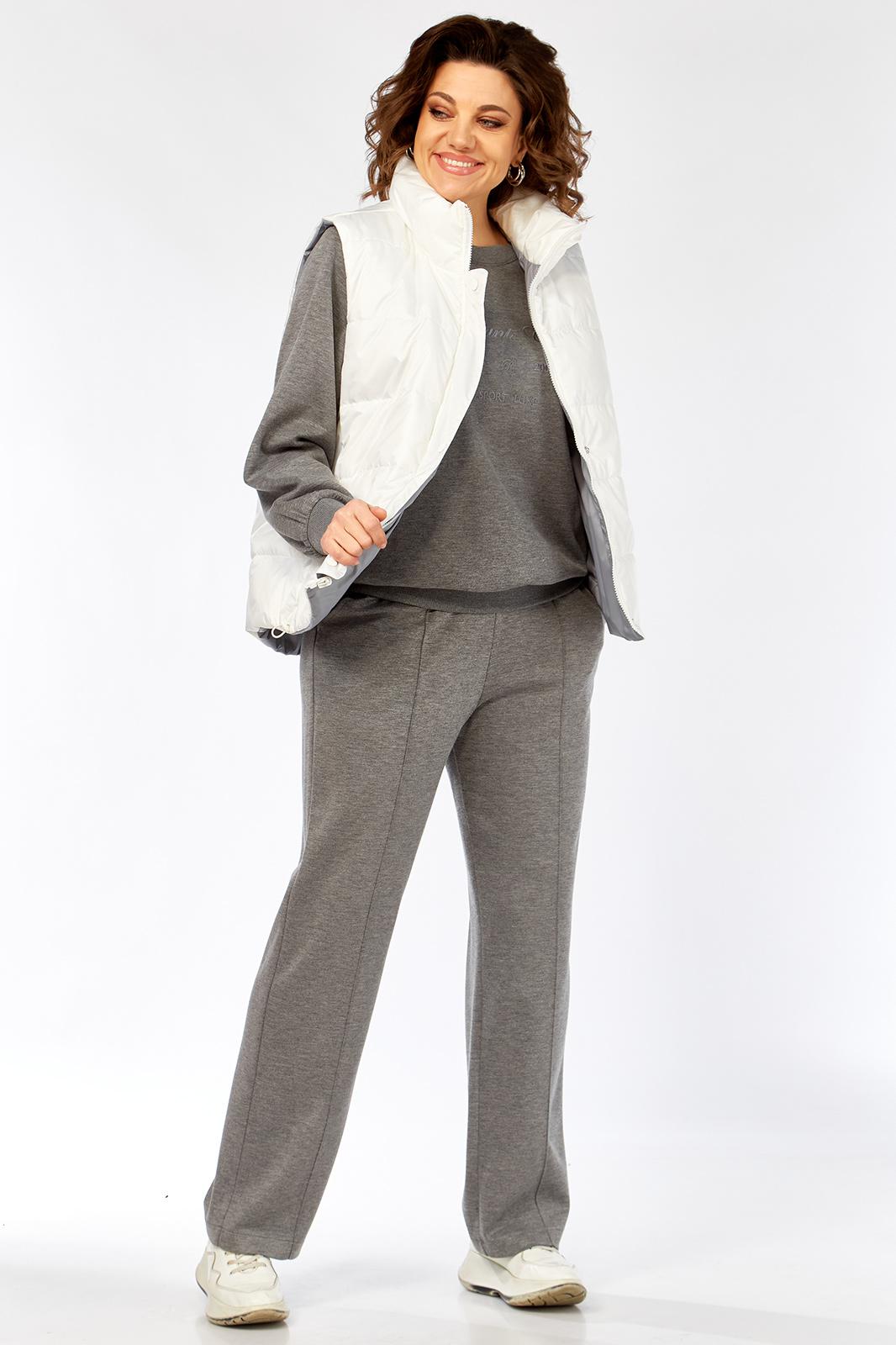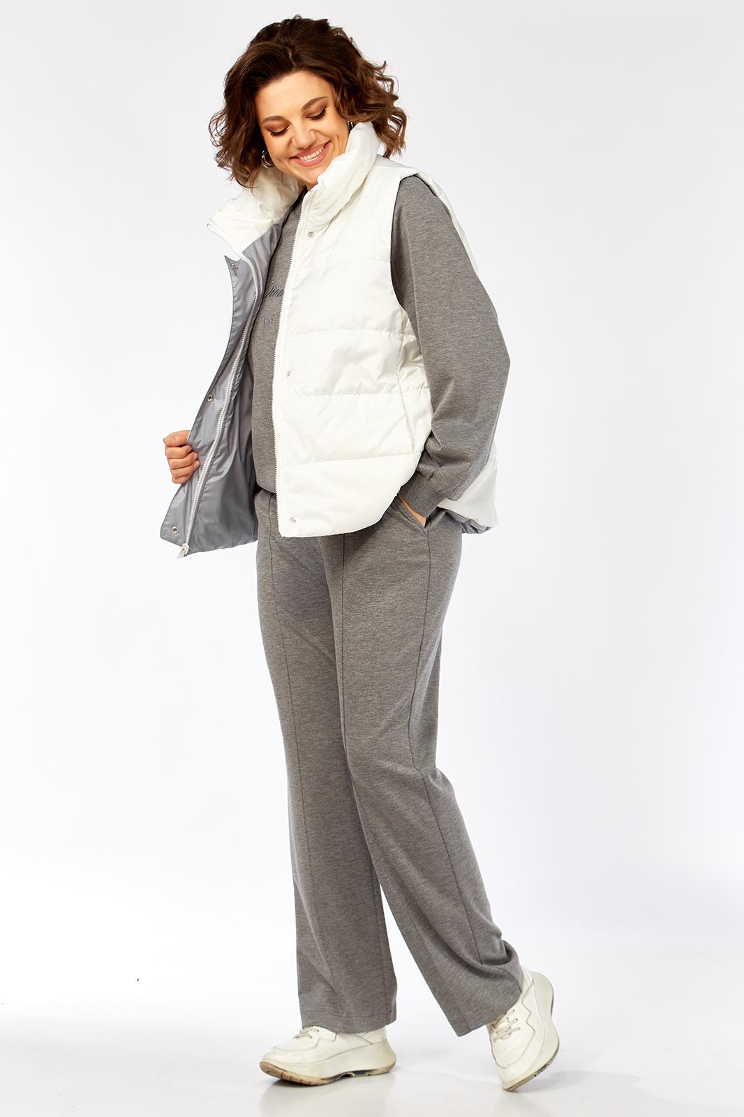 Комплект брючный( кофта+брюки+жилетка). Кофта прямого силуэта с притачным манжетом из отделочной ткани. Рукав покроя реглан с притачным манжетом по низу. В качестве отделки используется вышивка на центральной части переда. Брюки прямые. Верхний срез обработан поясом с резинкой. В боковых швах обработаны карманы. На передних половинках застрочены стрелки. Жилетка женская прямого силуэта с центральной застежкой на тесьму-молнию и отделочную планку на кнопки. Боковой шов смещенный на перед, в шве обработаны карманы. Воротник-стойка со складками по линии горловины. Жилетка двухсторонняя. Температурный режим до +5 градусов.
