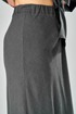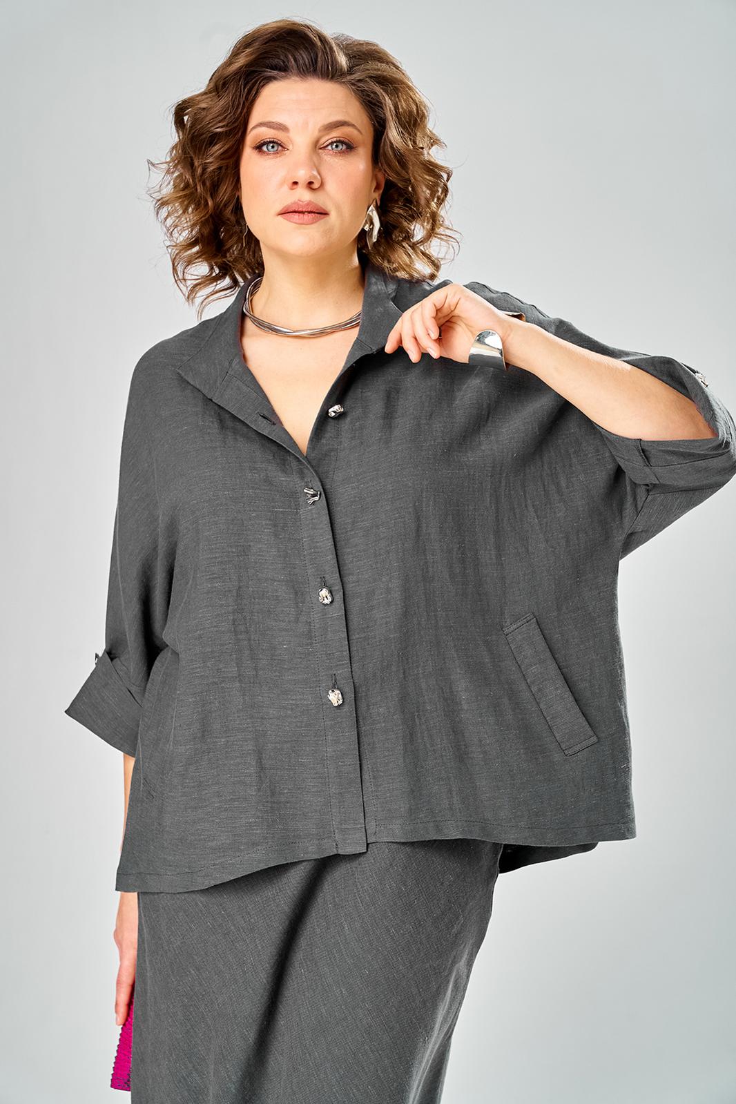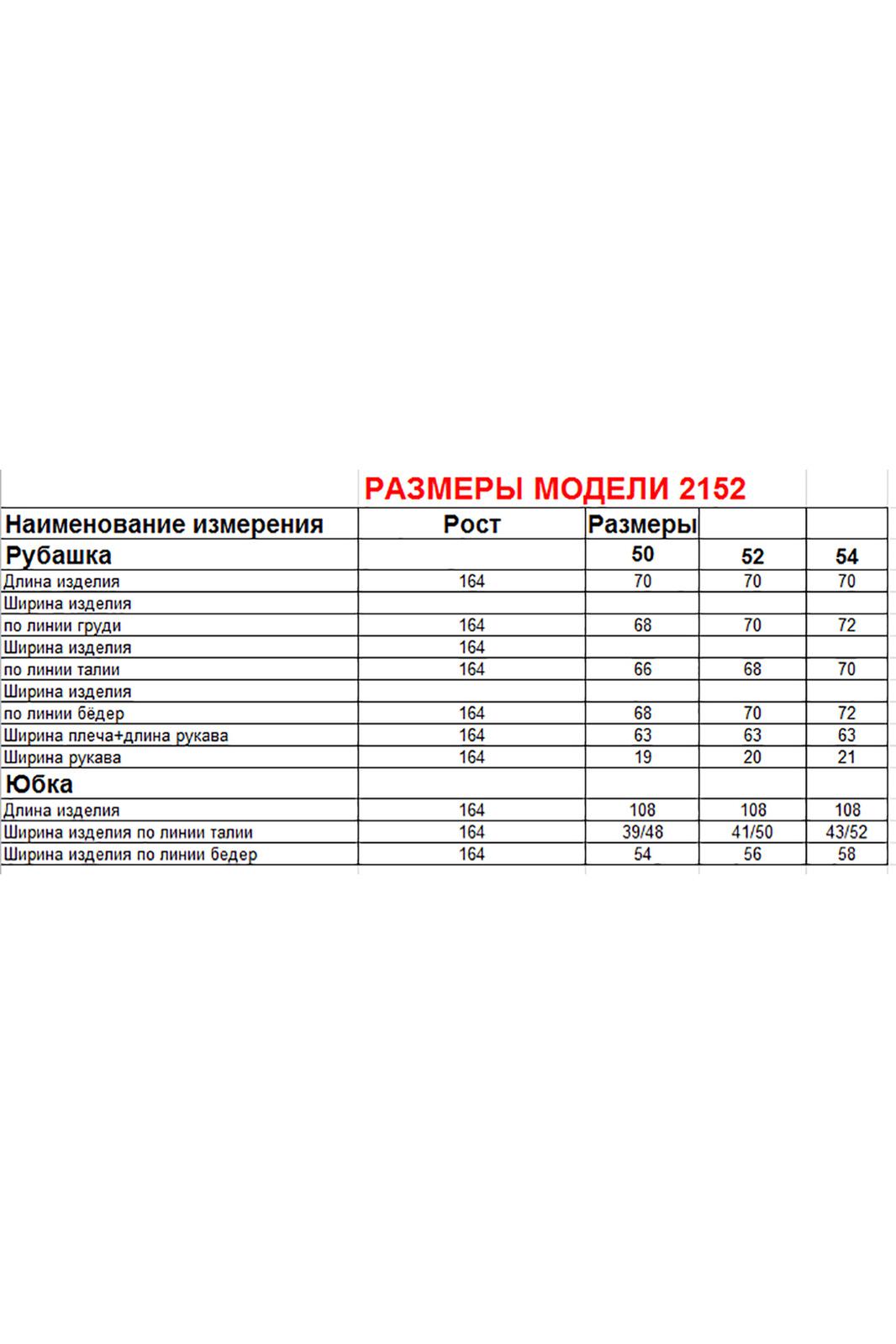 Комплект женский состоит из юбки и рубашки. Рубашка свободного кроя с центральной застежкой на петли-пуговицы. Спущенное плечо, втачной одношовный рукав (фиксируется отворот на петлю и пуговицу) по переду прорезные карманы с листочкой. Воротник-стойка. Юбка длинная, верхний срез обработан поясом на резинке с застежкой на петлю и пуговицу в левом боковом шве с потайной тесьмой-молнией. Юбка кроенная по косой. На заднем полотнище талиевые вытачки. Длина по спинке 70 см, ширина плеча+длина рукава 63 см. Длина юбки 108 см.
