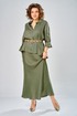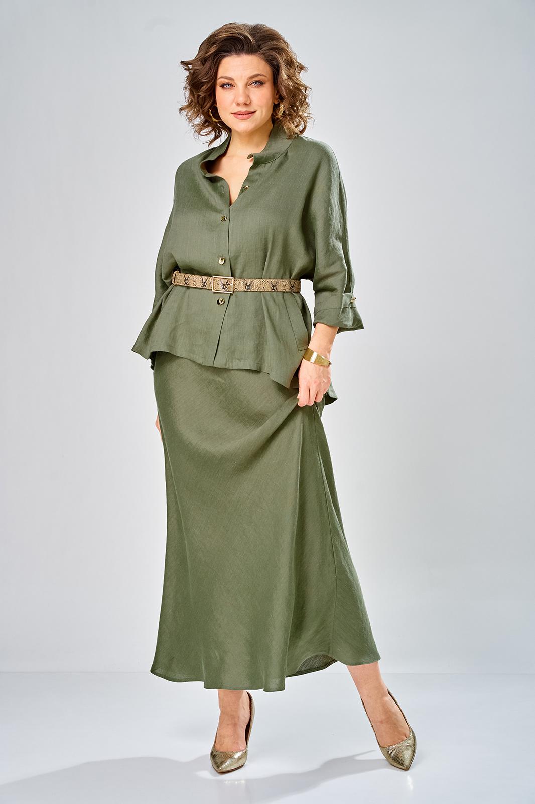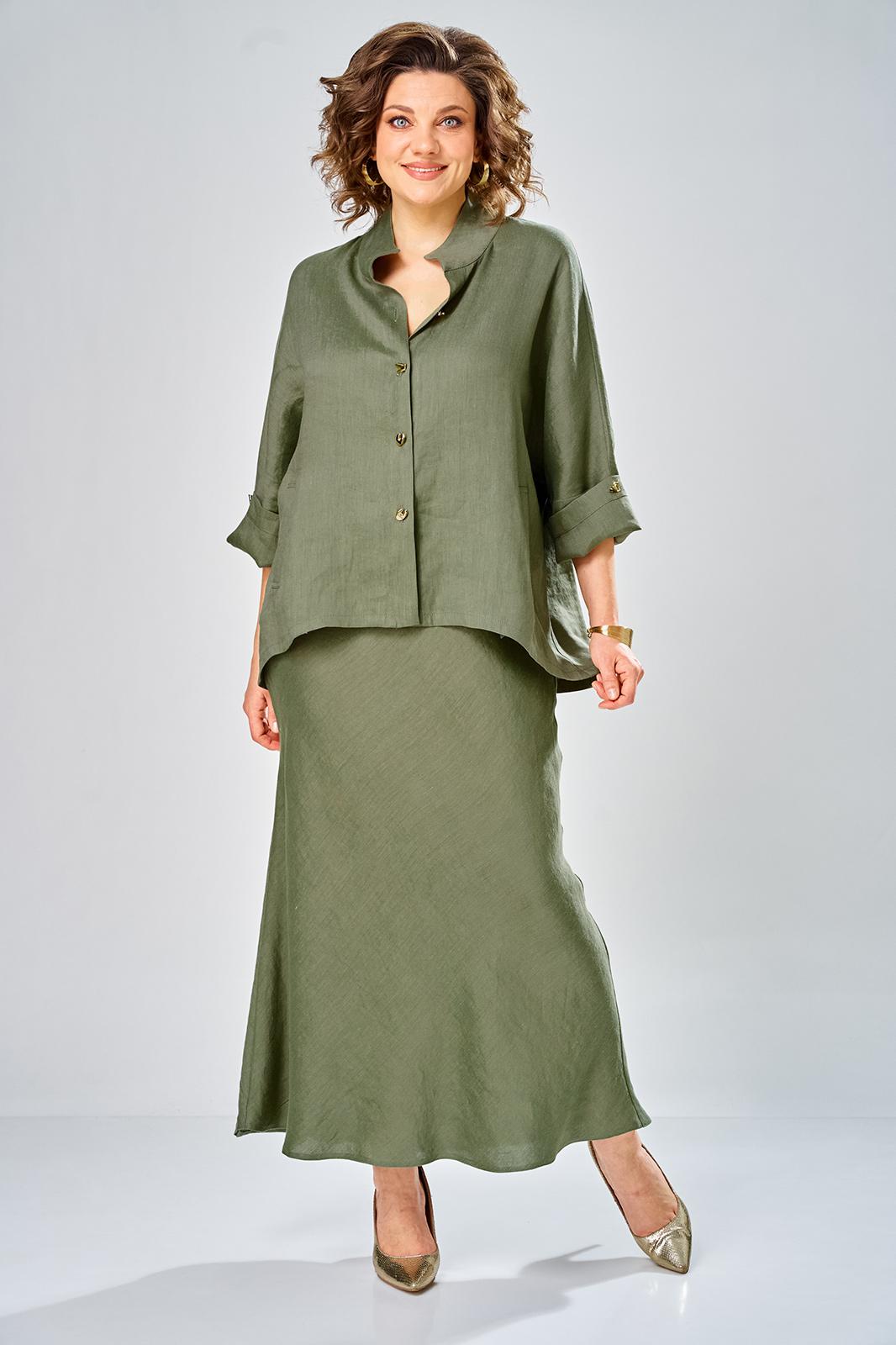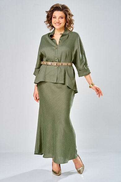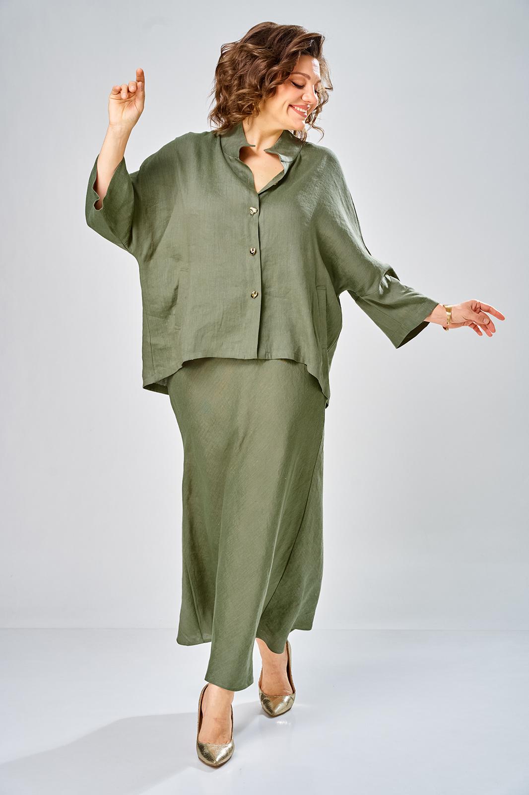 Комплект женский состоит из юбки и рубашки. Рубашка свободного кроя с центральной застежкой на петли-пуговицы. Спущенное плечо, втачной одношовный рукав (фиксируется отворот на петлю и пуговицу) по переду прорезные карманы с листочкой. Воротник-стойка. Юбка длинная, верхний срез обработан поясом на резинке с застежкой на петлю и пуговицу в левом боковом шве с потайной тесьмой-молнией. Юбка кроенная по косой. На заднем полотнище талиевые вытачки. Длина по спинке 70 см, ширина плеча+длина рукава 63 см. Длина юбки 108 см.