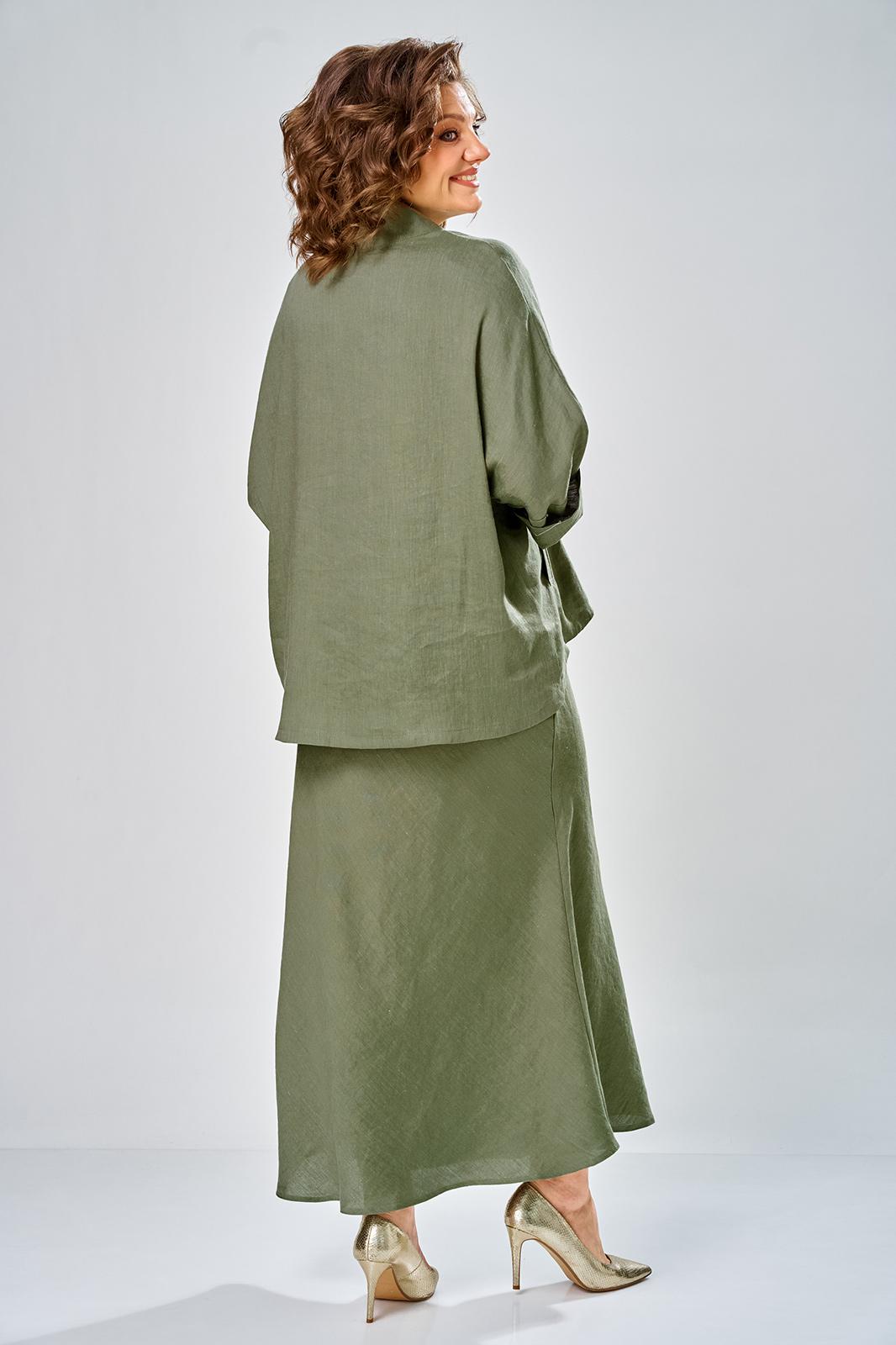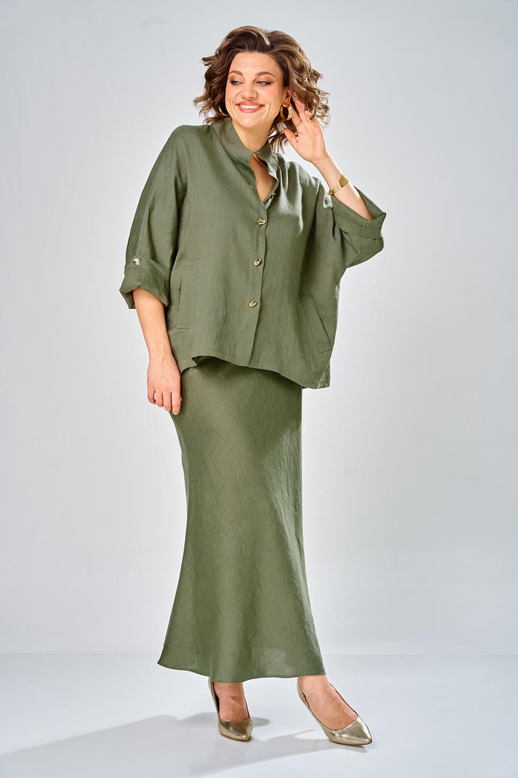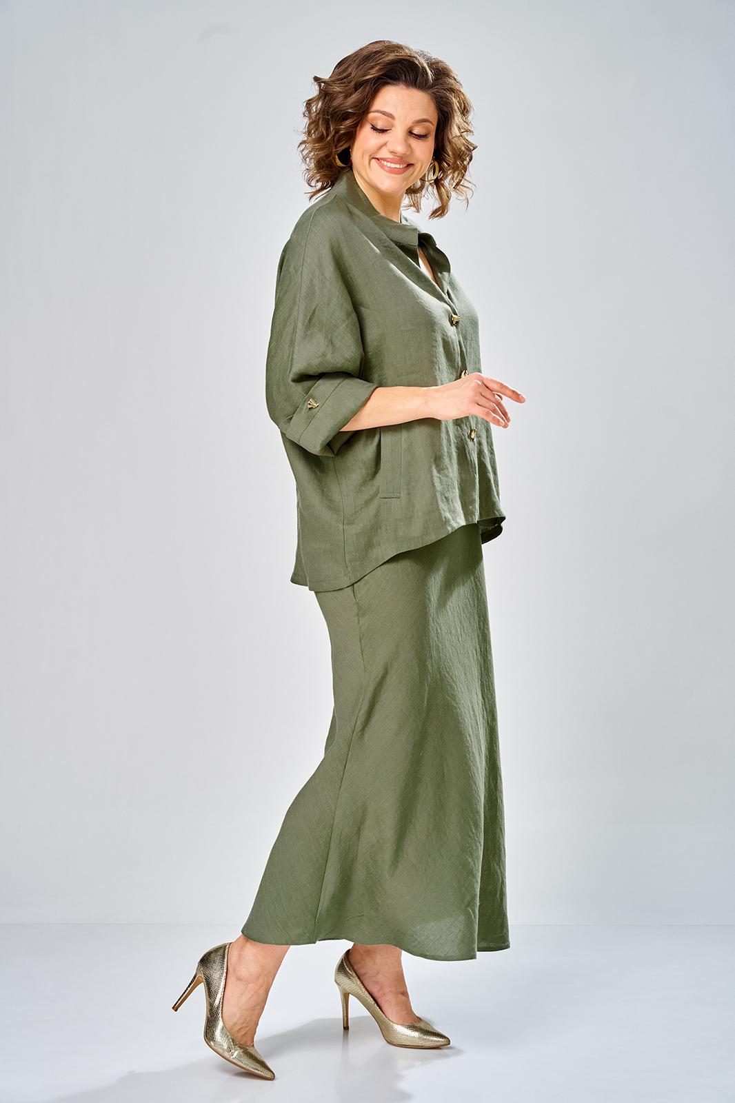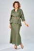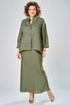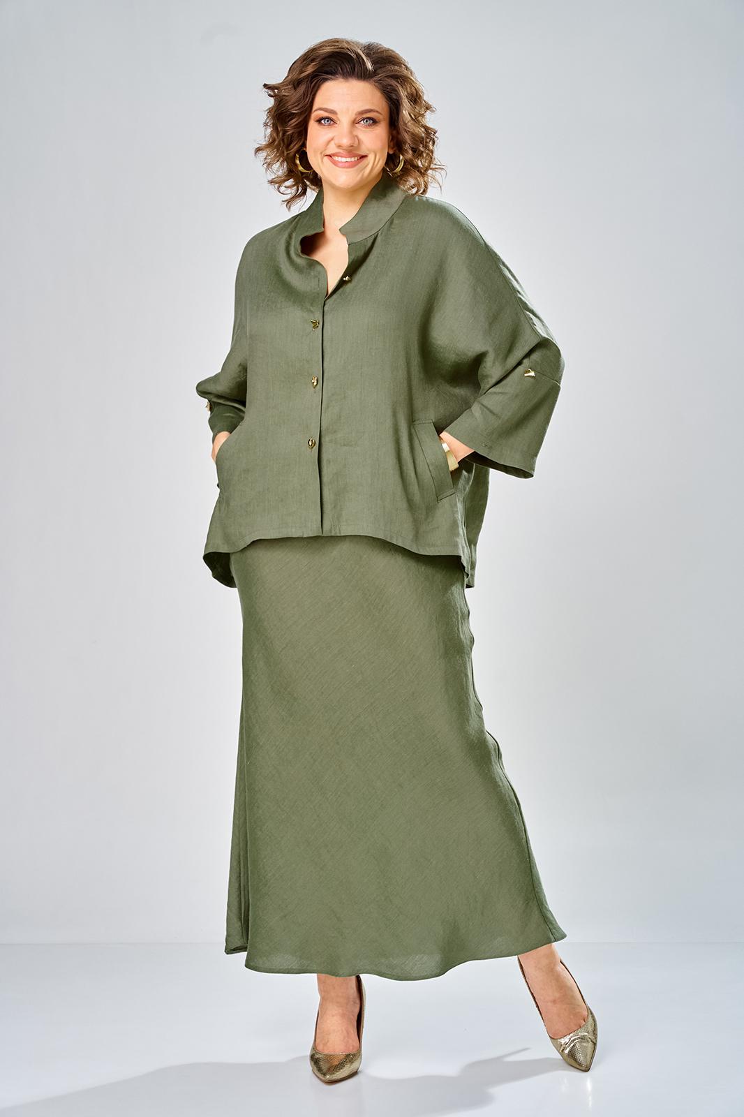 Комплект женский состоит из юбки и рубашки. Рубашка свободного кроя с центральной застежкой на петли-пуговицы. Спущенное плечо, втачной одношовный рукав (фиксируется отворот на петлю и пуговицу) по переду прорезные карманы с листочкой. Воротник-стойка. Юбка длинная, верхний срез обработан поясом на резинке с застежкой на петлю и пуговицу в левом боковом шве с потайной тесьмой-молнией. Юбка кроенная по косой. На заднем полотнище талиевые вытачки. Длина по спинке 70 см, ширина плеча+длина рукава 63 см. Длина юбки 108 см.