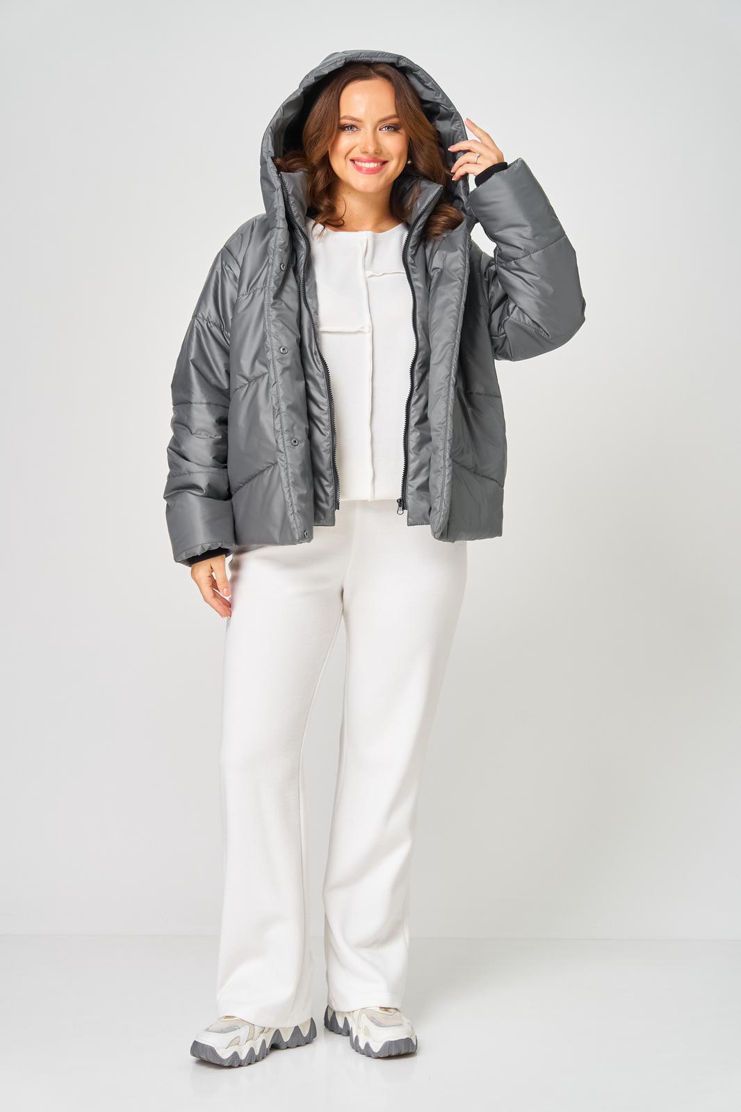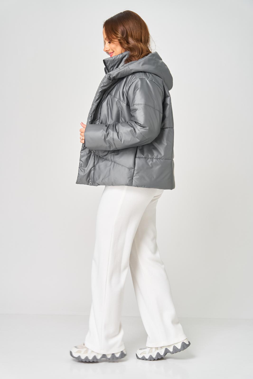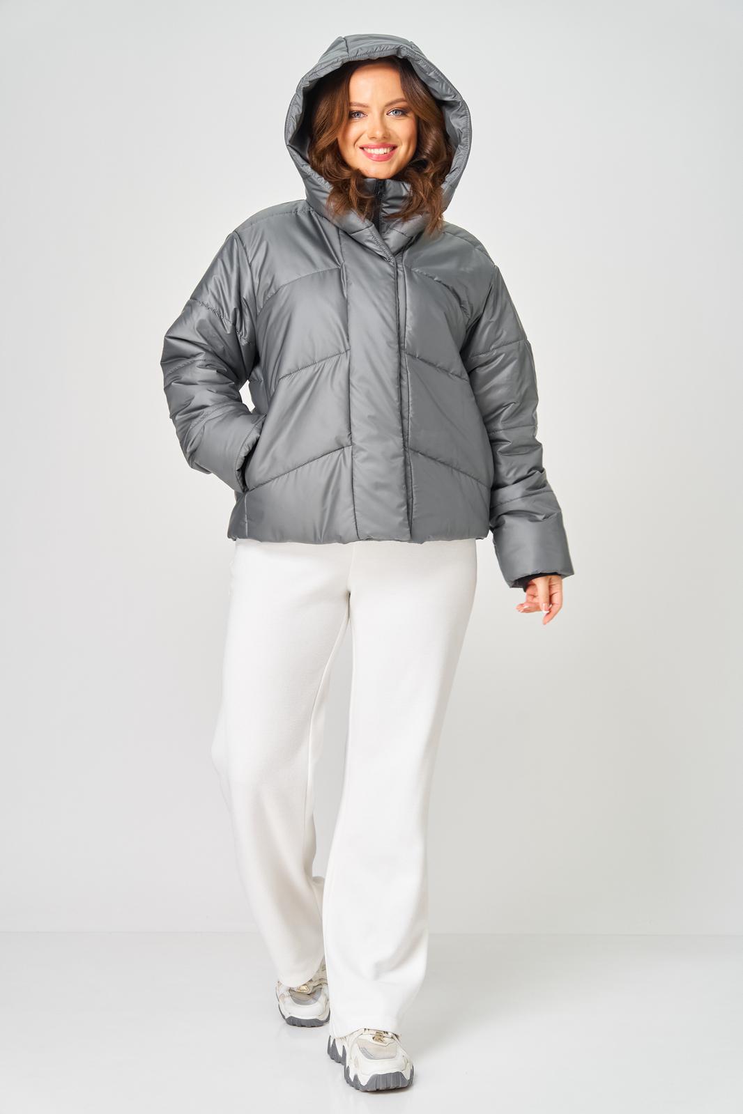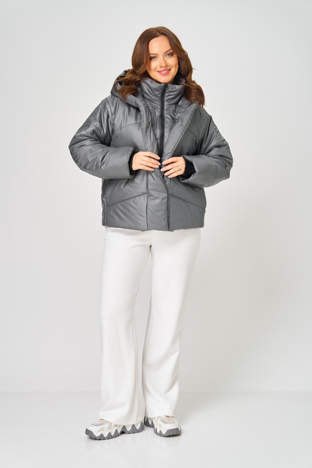 Куртка женская с центральной застёжкой на молнию и потайные кнопки. Спинка с горизонтальной стяжкой. Полочка выстегана по косой. В бококвых швах обработаны карманы. Рукав втачной одношовный с трикотажными манжетами из-под подгибки. Воротник-капюшон переходящий в планку с кнопками. Внутренний воротник-стойка с манишкой на молнии. Куртка на утеплителе. Температурный режим до - 10 градусов.